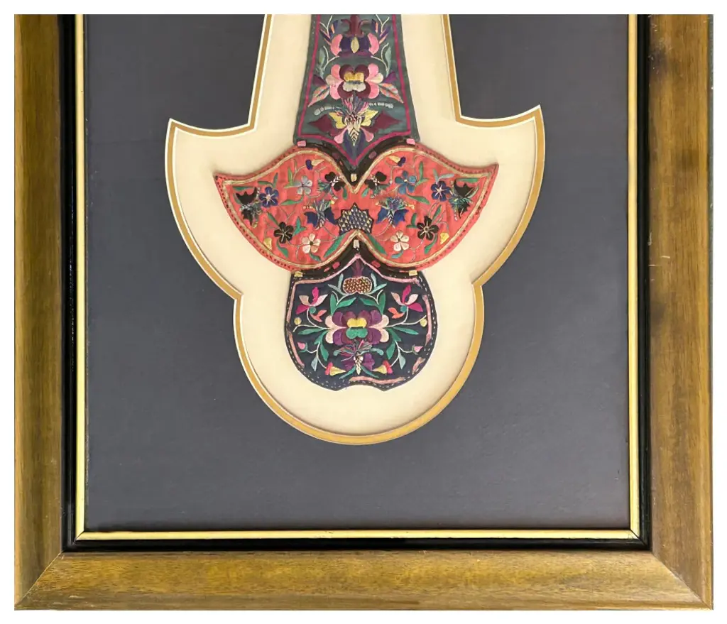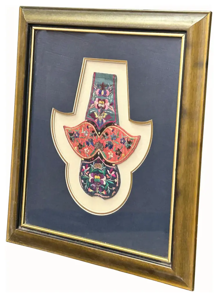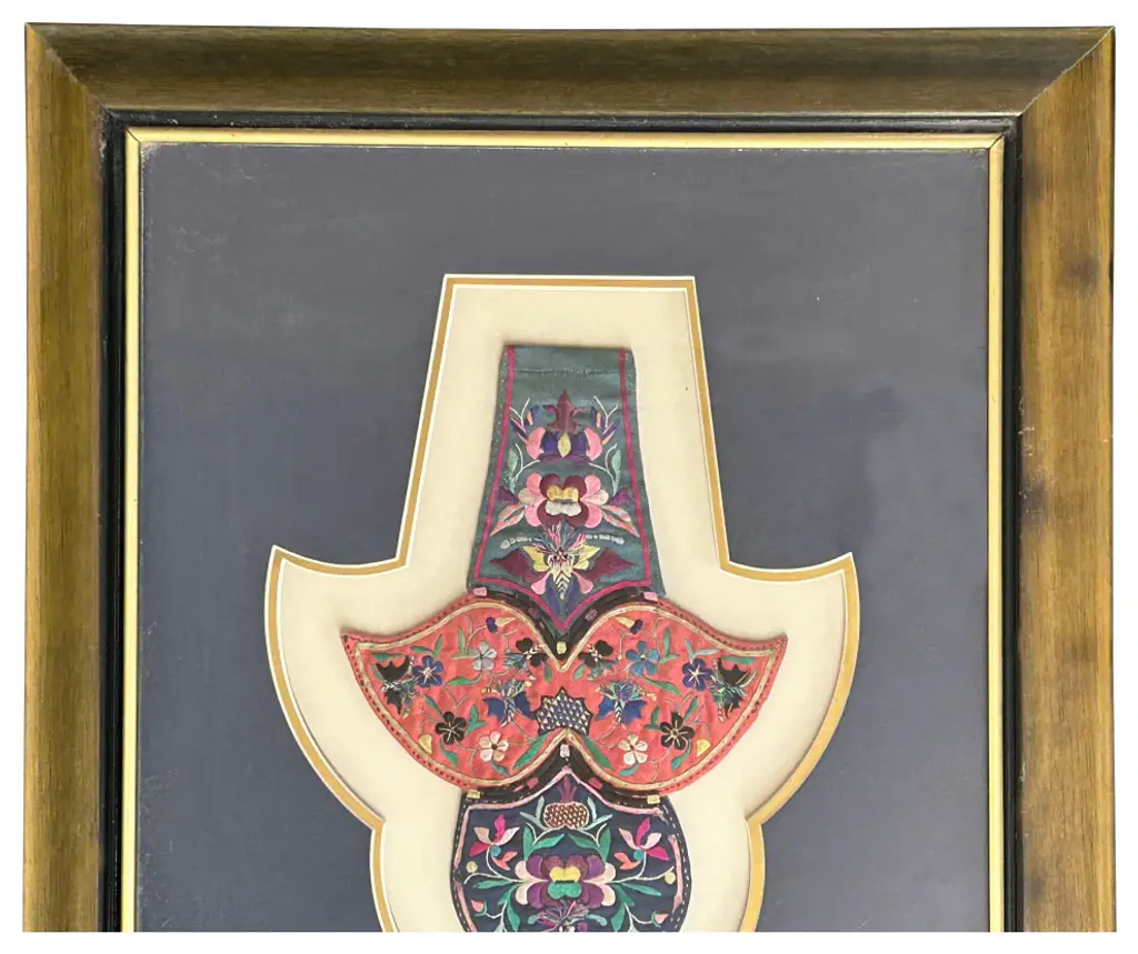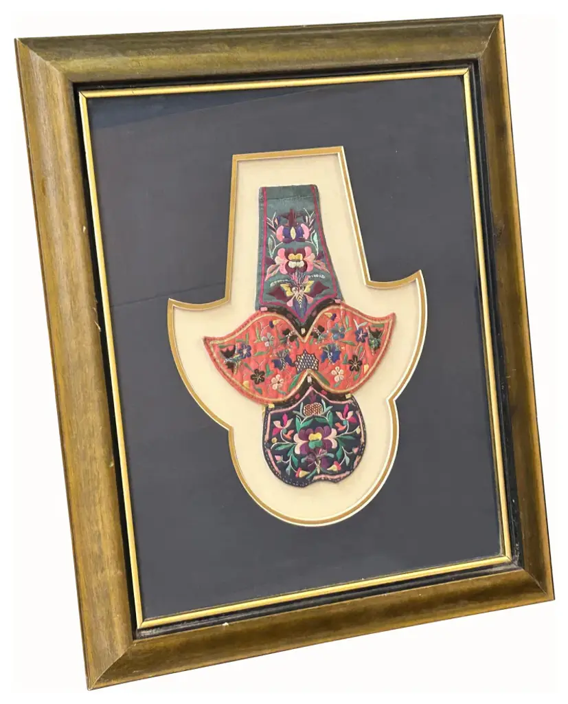 This vintage Chinese embroidery fabric piece, elegantly framed as wall art, showcases intricate craftsmanship and traditional artistry. The fine stitching features vibrant patterns and cultural motifs, capturing the beauty and heritage of Chinese textile arts. Encased in a classic frame, this unique piece brings a touch of history, color, and sophistication to any wall, making it a timeless addition to your decor.Dimensions: w19" x h21.75"Origin: ChinaMaterial: Wood frameCondition: hand made, minor chip distressed marks on the frame