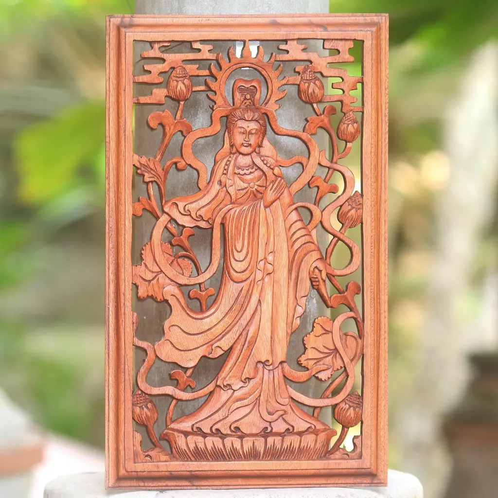 Vintage Chinese Natural Bamboo Carved Kwan Yin Motif Art Plaque Hws4215