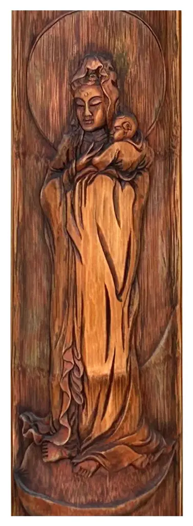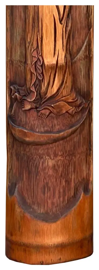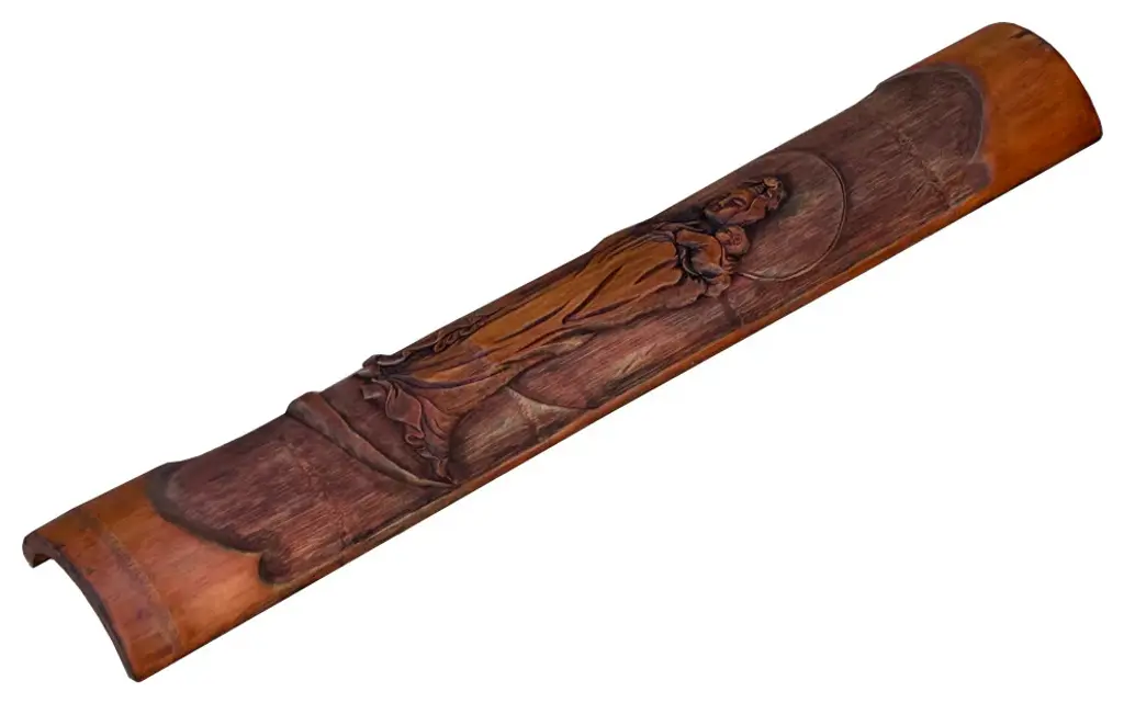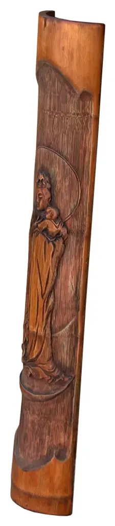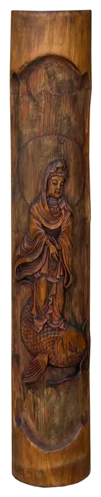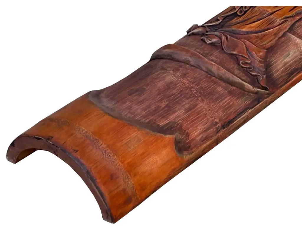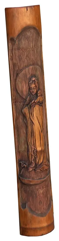 This Vintage Chinese Natural Bamboo Carved Relief Art Plaque showcases the serene figure of Kwan Yin, the Goddess of Mercy, intricately carved in stunning detail. The natural bamboo texture enhances the plaque''s organic beauty, while the relief design brings depth and dimension to the artwork. This elegant piece of traditional Chinese craftsmanship exudes spiritual significance and timeless artistry, making it a perfect addition to any collection or home decor.Dimensions: w5.25" x h31.5", depth 2.5"Origin: ChinaMaterial: BambooCondition: Vintage restored, rustic marks, original hole or missing chips