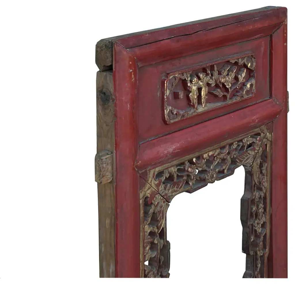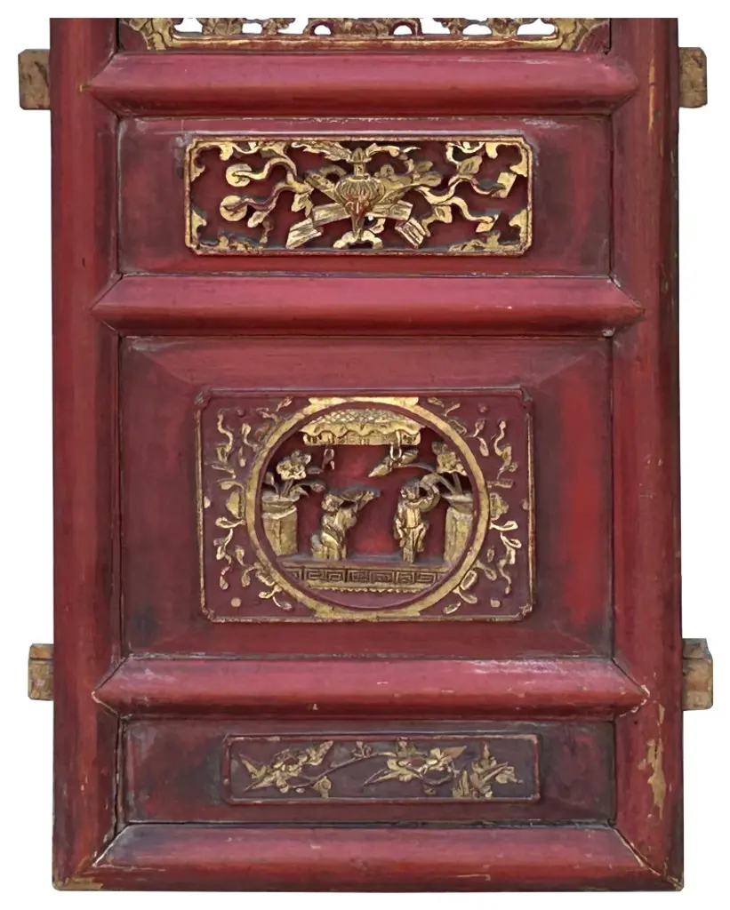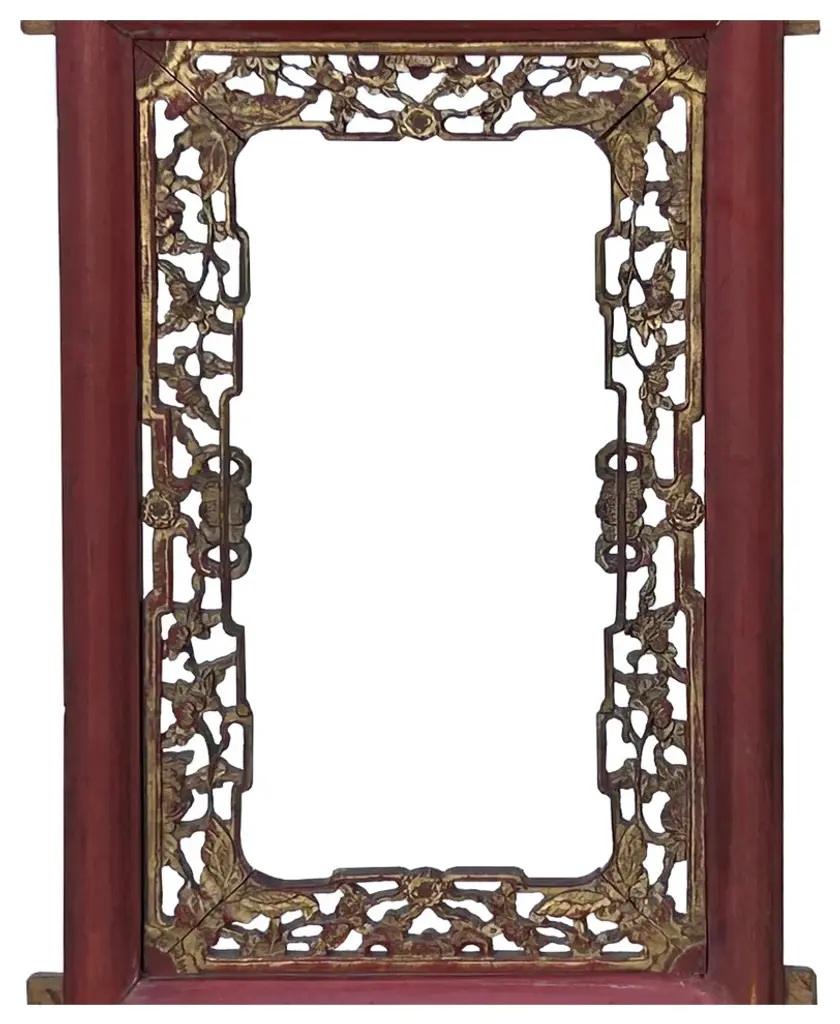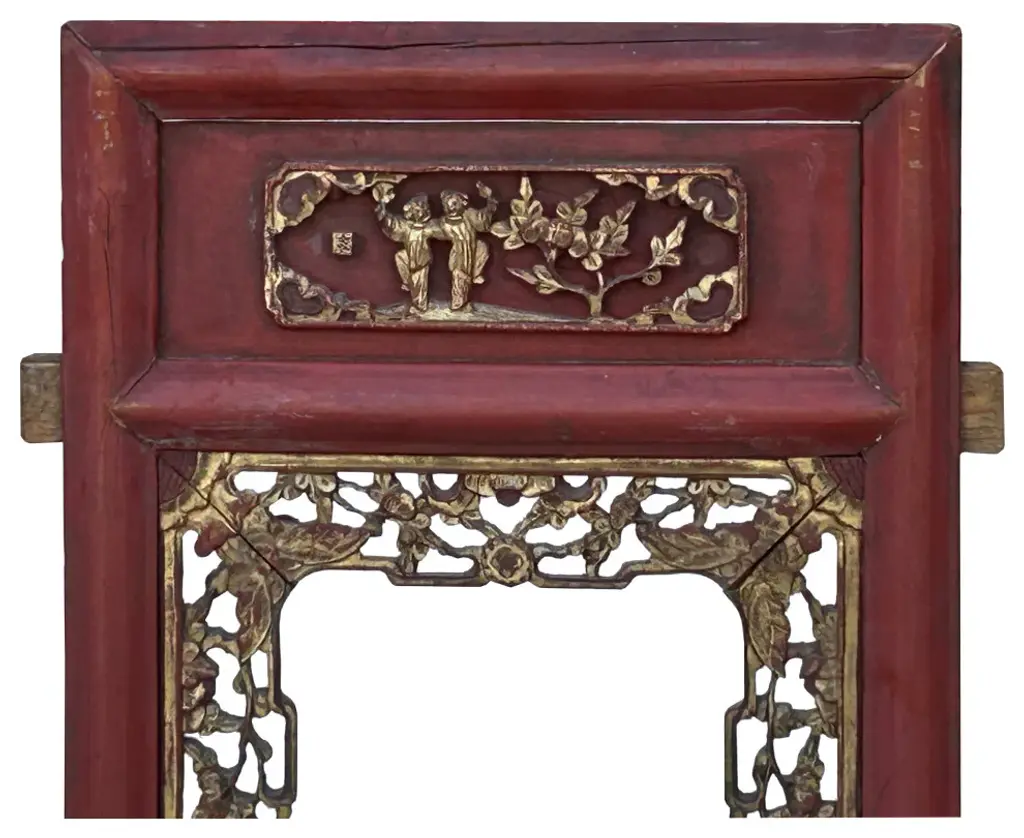 This Vintage Chinese Red and Golden Floral Carving Wood Wall Panel features intricate craftsmanship with an open center design, perfect for adding a traditional touch to your decor. The rich red frame is adorned with delicate golden floral carvings, creating a striking contrast that highlights its artistic elegance. This rectangular wood panel art brings cultural charm and timeless beauty to any wall, making it a standout piece in any room.Dimensions: w15.5" x h50" thickness 1.75"Origin: ChinaMaterial: Elm WoodCondition: Vintage restored, rustic marks, original hole or missing chips