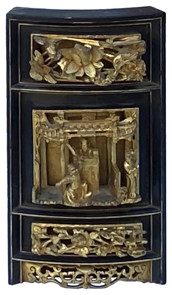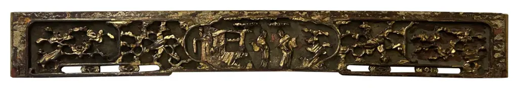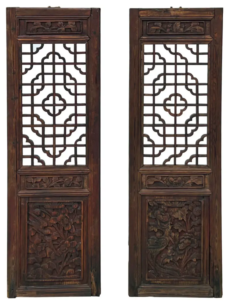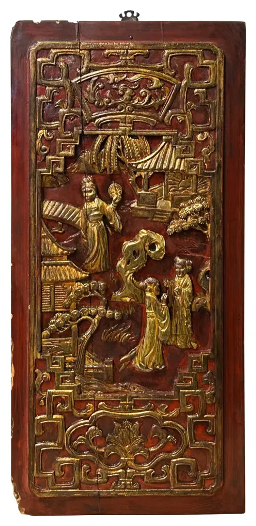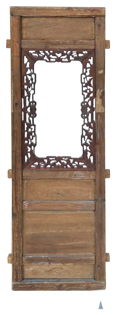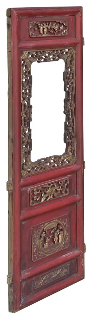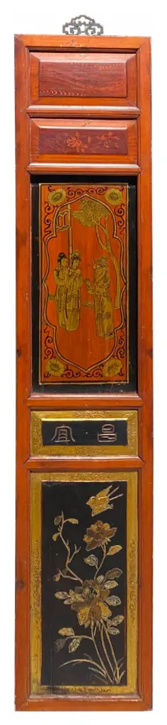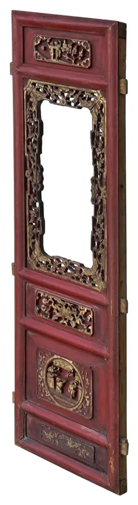 This Vintage Chinese Red and Golden Floral Carving Wood Wall Panel features intricate craftsmanship with an open center design, perfect for adding a traditional touch to your decor. The rich red frame is adorned with delicate golden floral carvings, creating a striking contrast that highlights its artistic elegance. This rectangular wood panel art brings cultural charm and timeless beauty to any wall, making it a standout piece in any room.Dimensions: w15.5" x h50" thickness 1.75"Origin: ChinaMaterial: Elm WoodCondition: Vintage restored, rustic marks, original hole or missing chips