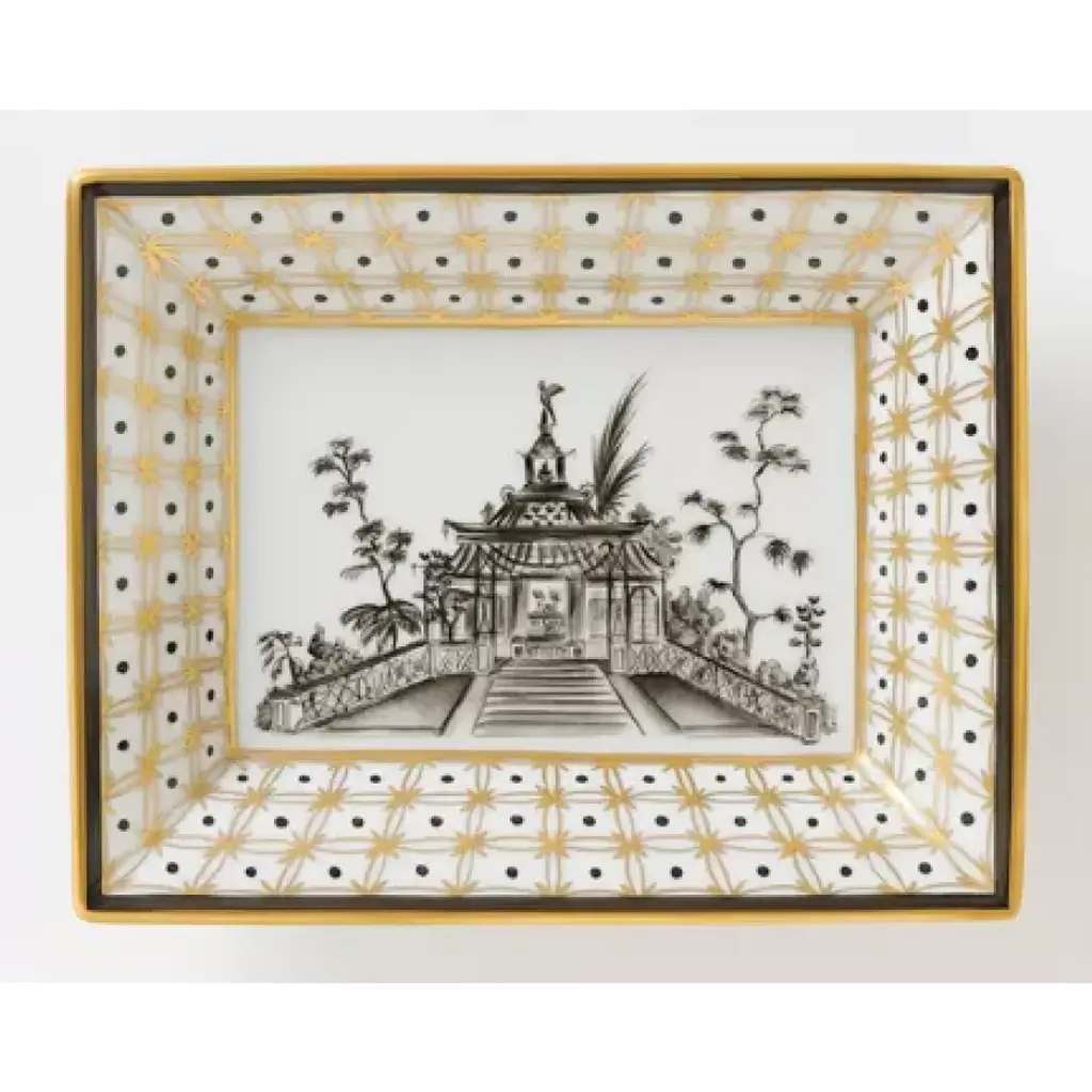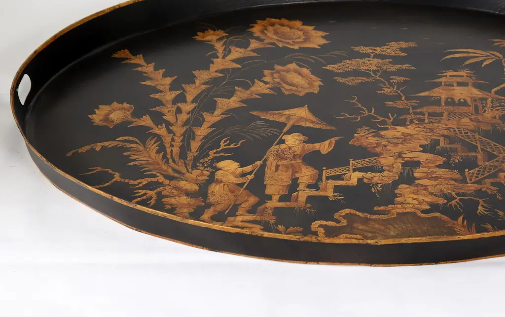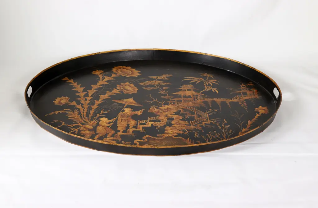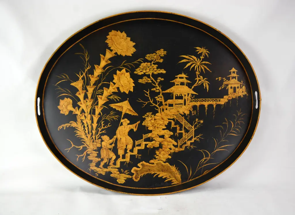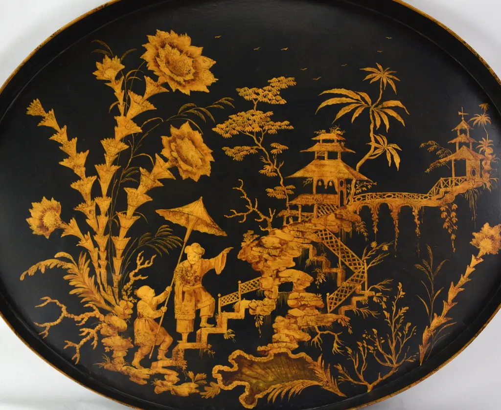 Vintage Chinoiserie Hand Painted Golden Oriental Landscape Tray