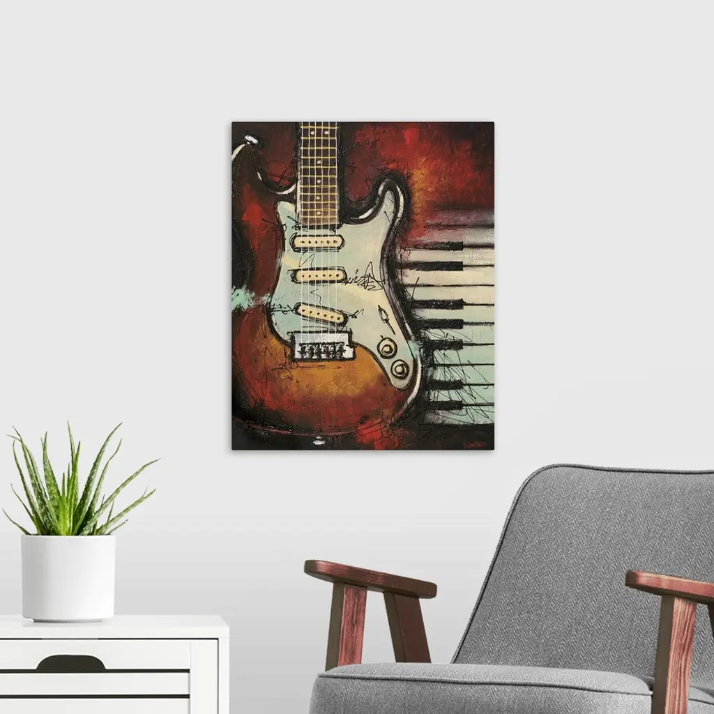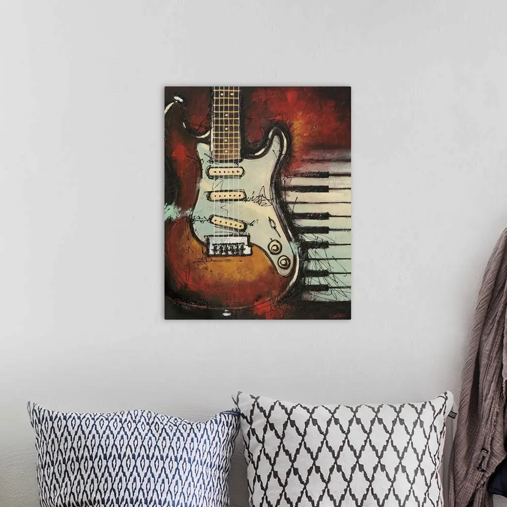 Contemporary painting of a guitar with piano keys in the background.