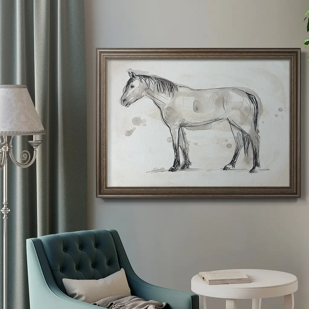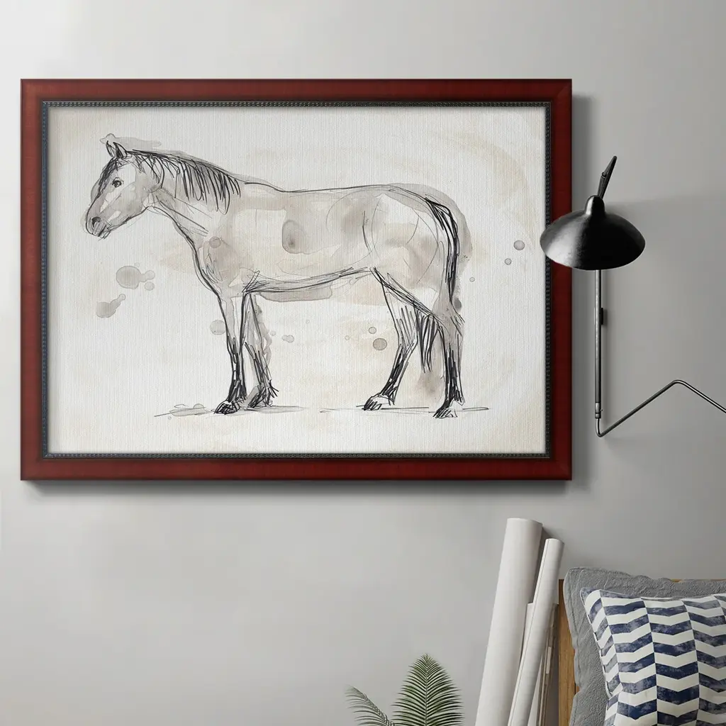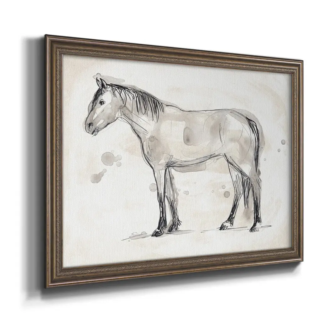 Vintage Equine Sketch I Premium Framed Canvas- Ready to Hang A Premium Framed Canvas created to last. Framed in distressed wood and available in an array of sizes and colors Featuring a beveled a solid wood stretcher bar, each piece comes ready to hand 3 SIZES AVAILABLE 16''X20'' - Overall Size 18'X27'' - Overall Size 24''x36'' - Overall Size Each piece is made to order. Each piece comes with hanging hardware. Made in the USA Ready to Hang Giclee Paper Print Acrylic Glass Beveled Matt Board