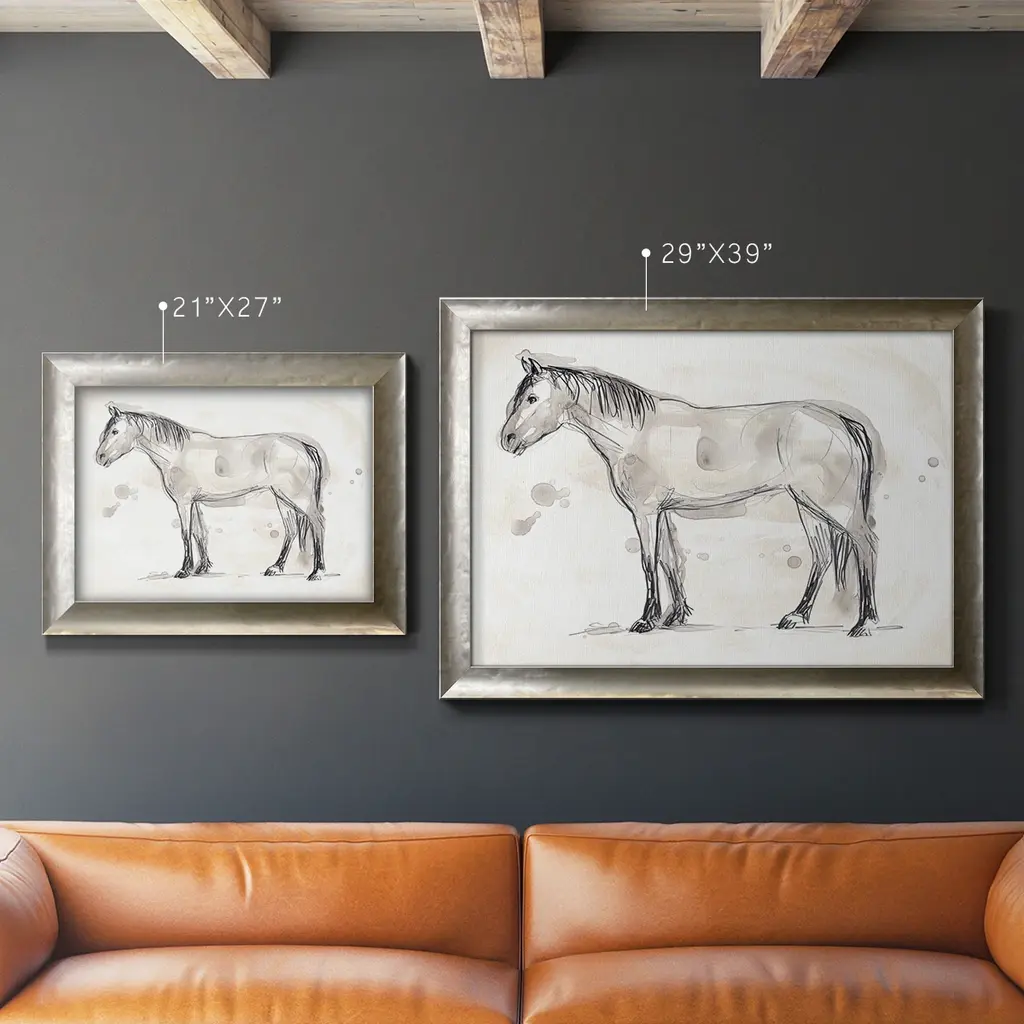 Vintage Equine Sketch I Premium Framed Canvas- Ready to Hang A Premium Framed Canvas created to last. Framed in distressed wood and available in an array of sizes and colors Featuring a beveled a solid wood stretcher bar, each piece comes ready to hand 3 SIZES AVAILABLE 16''X20'' - Overall Size 18'X27'' - Overall Size 24''x36'' - Overall Size Each piece is made to order. Each piece comes with hanging hardware. Made in the USA Ready to Hang Giclee Paper Print Acrylic Glass Beveled Matt Board