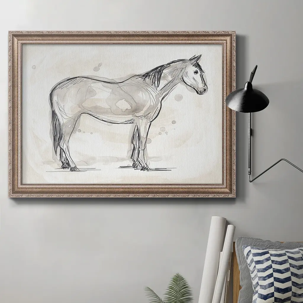 Vintage Equine Sketch II Premium Framed Canvas- Ready to Hang A Premium Framed Canvas created to last. Framed in distressed wood and available in an array of sizes and colors Featuring a beveled a solid wood stretcher bar, each piece comes ready to hand 3 SIZES AVAILABLE 16''X20'' - Overall Size 18'X27'' - Overall Size 24''x36'' - Overall Size Each piece is made to order. Each piece comes with hanging hardware. Made in the USA Ready to Hang Giclee Paper Print Acrylic Glass Beveled Matt Board