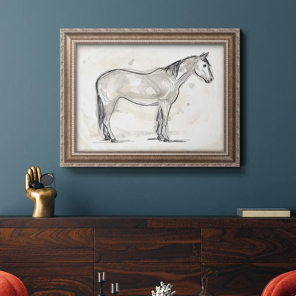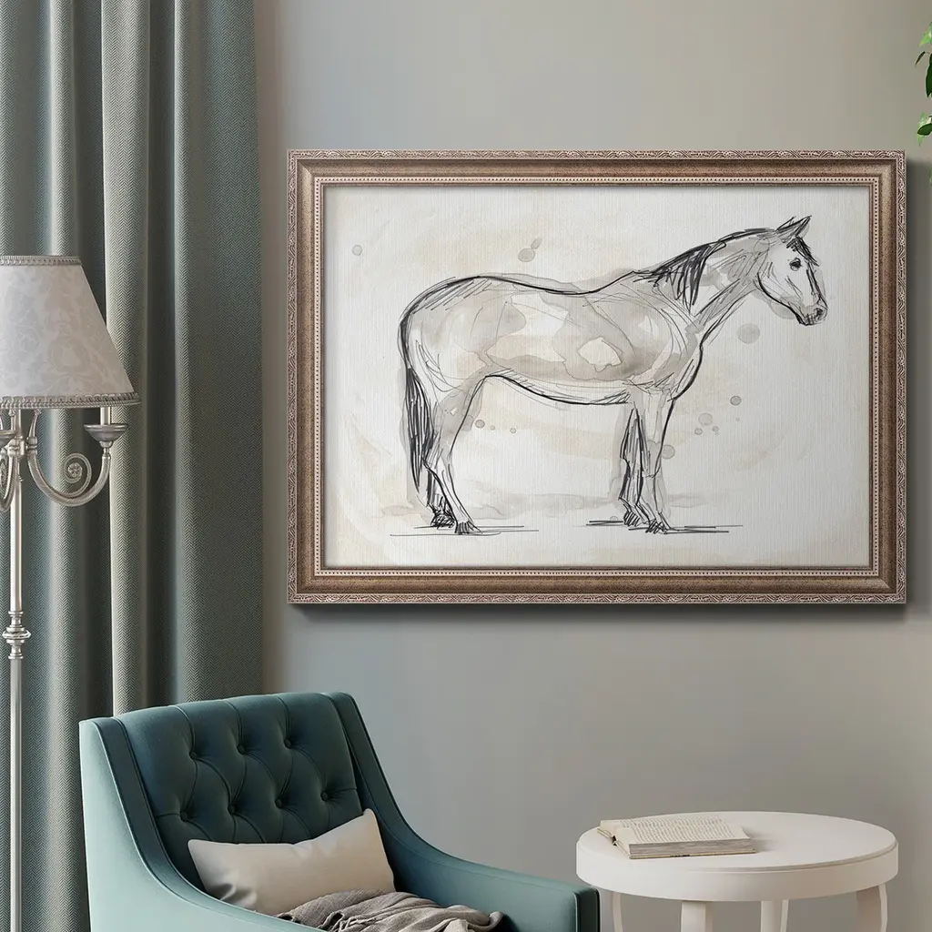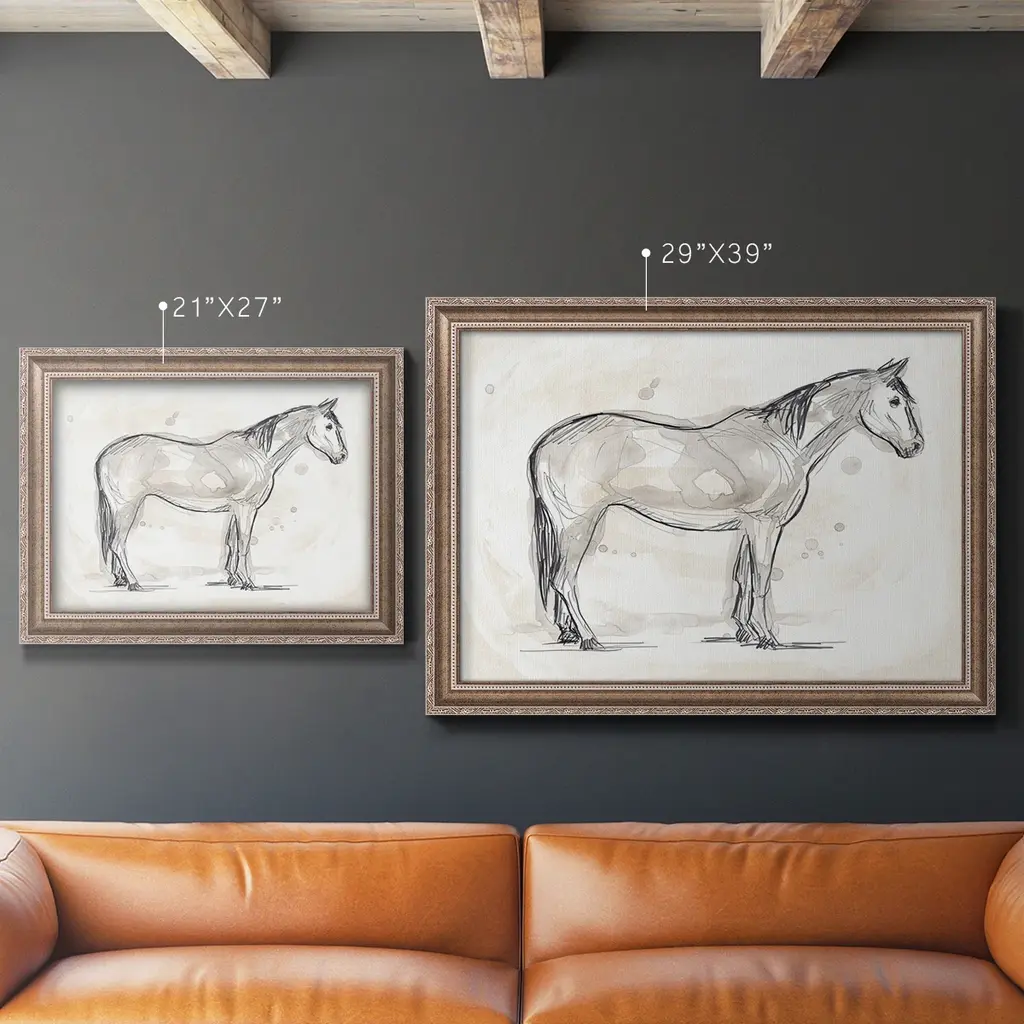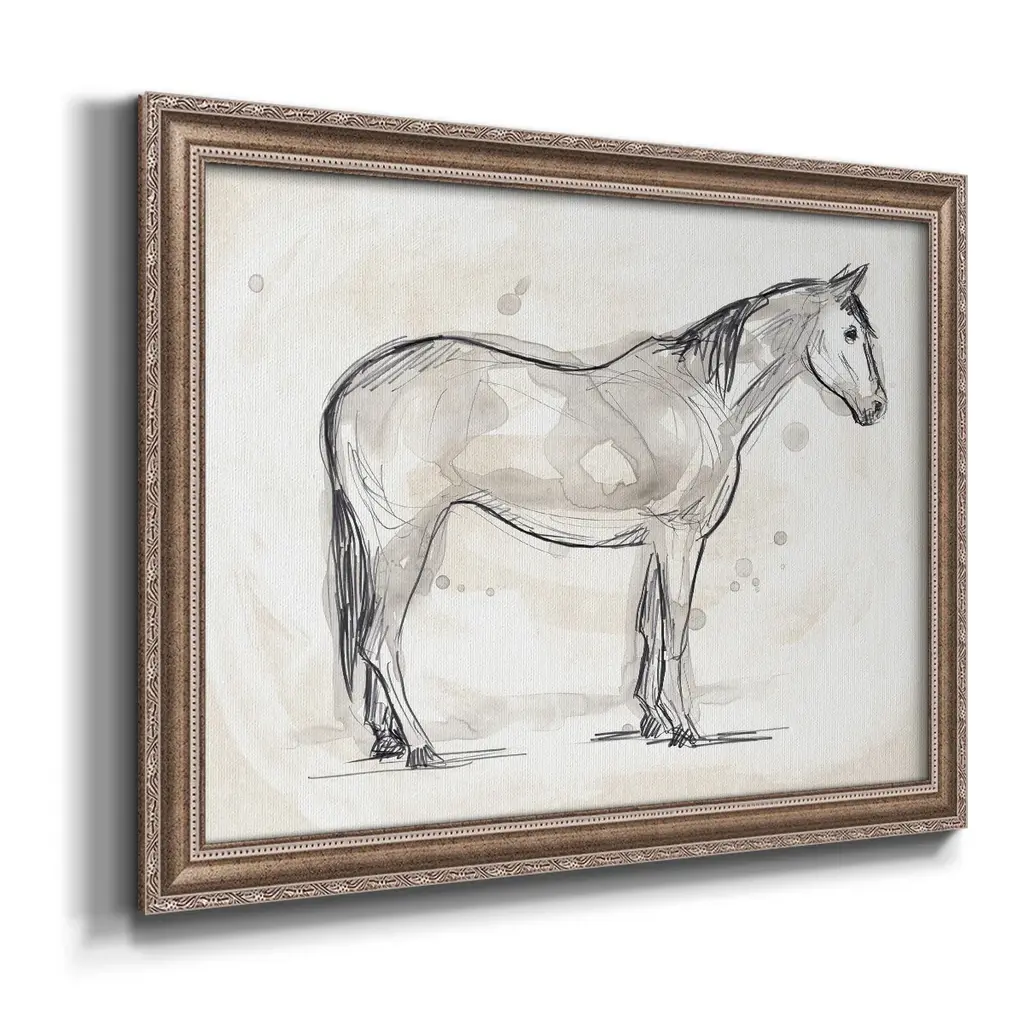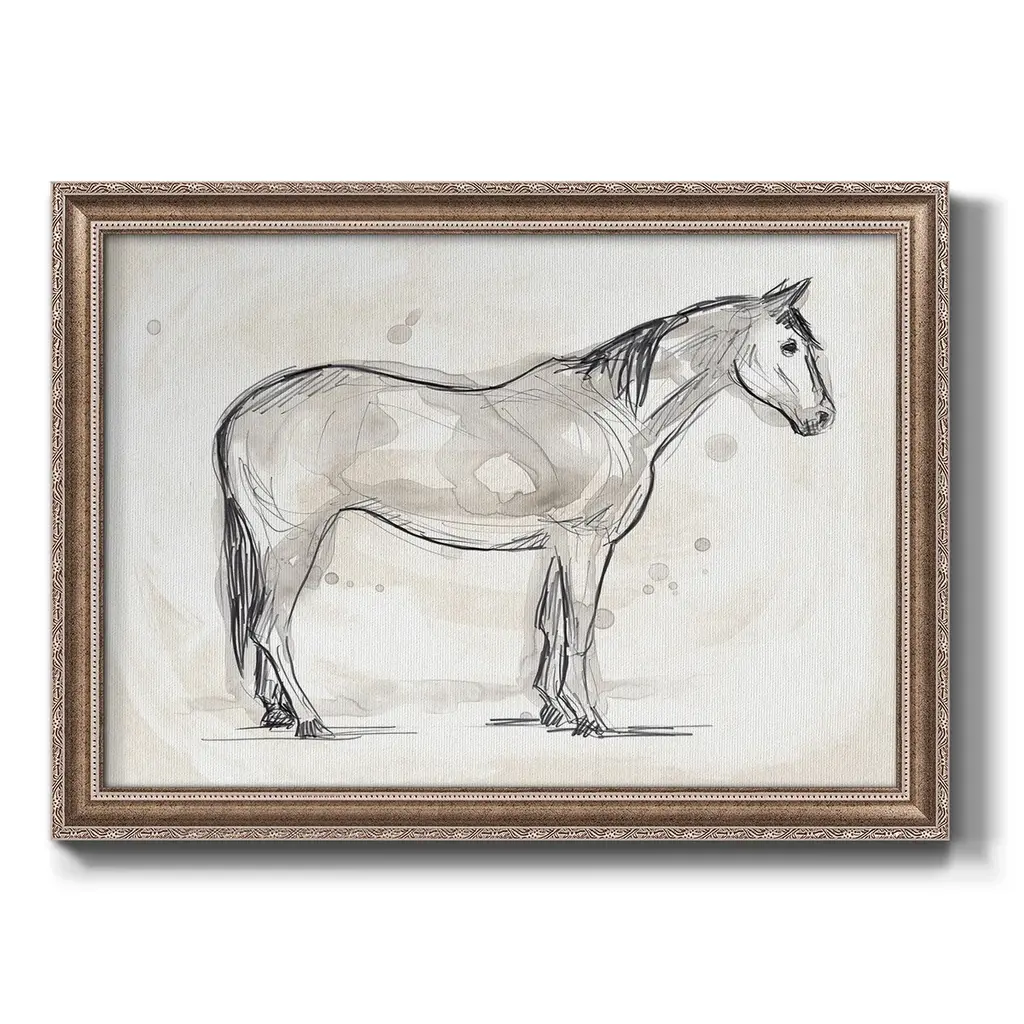 Vintage Equine Sketch II Premium Framed Canvas- Ready to Hang A Premium Framed Canvas created to last. Framed in distressed wood and available in an array of sizes and colors Featuring a beveled a solid wood stretcher bar, each piece comes ready to hand 3 SIZES AVAILABLE 16''X20'' - Overall Size 18'X27'' - Overall Size 24''x36'' - Overall Size Each piece is made to order. Each piece comes with hanging hardware. Made in the USA Ready to Hang Giclee Paper Print Acrylic Glass Beveled Matt Board