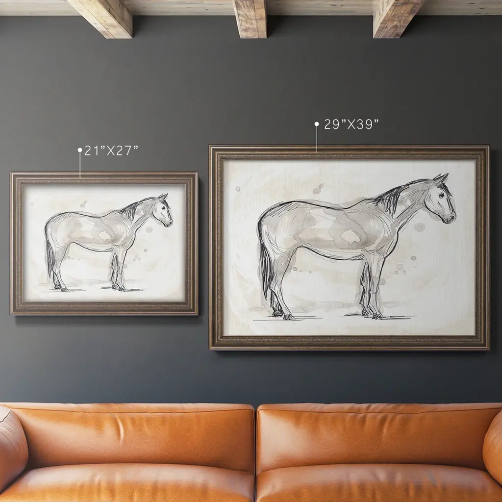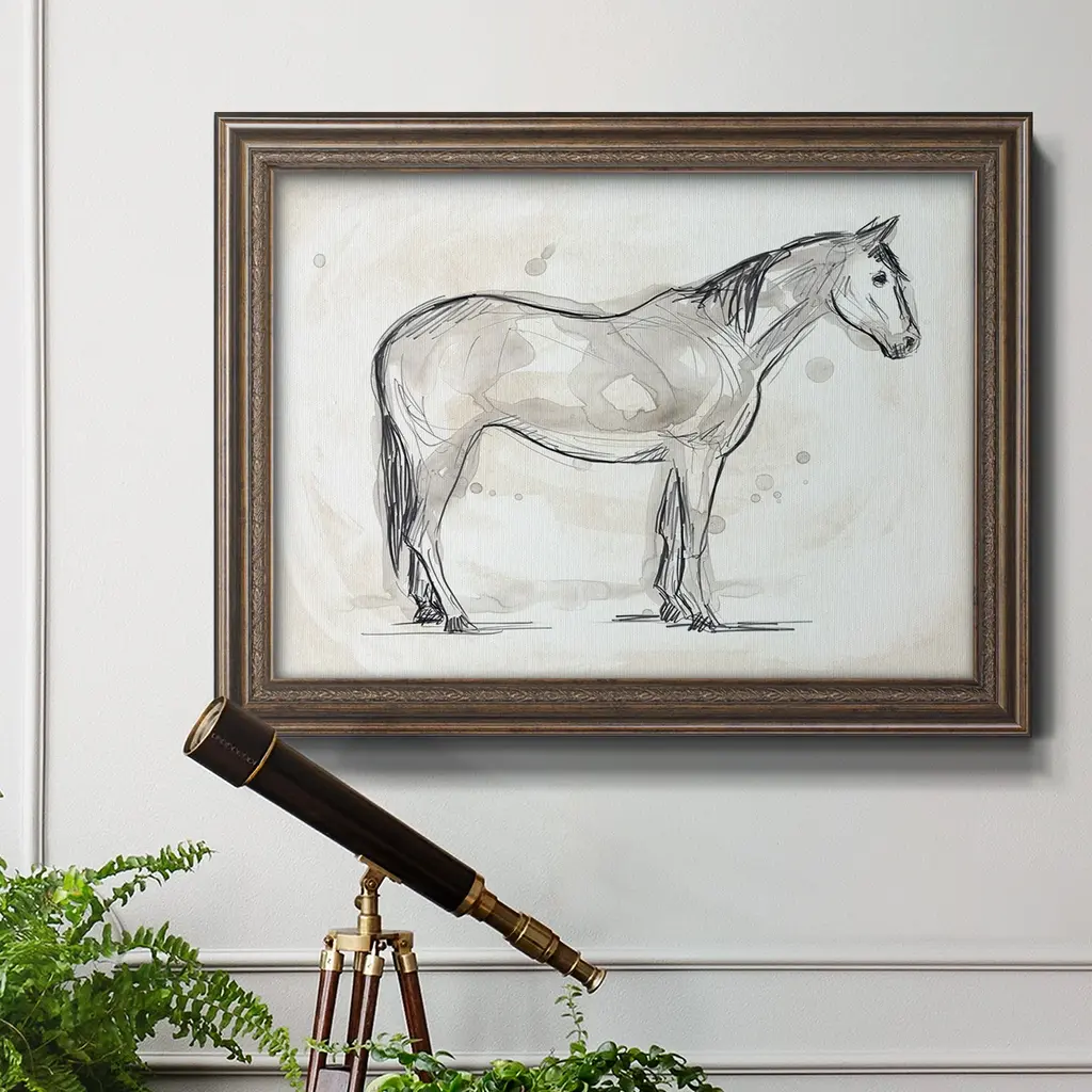 Vintage Equine Sketch II Premium Framed Canvas- Ready to Hang A Premium Framed Canvas created to last. Framed in distressed wood and available in an array of sizes and colors Featuring a beveled a solid wood stretcher bar, each piece comes ready to hand 3 SIZES AVAILABLE 16''X20'' - Overall Size 18'X27'' - Overall Size 24''x36'' - Overall Size Each piece is made to order. Each piece comes with hanging hardware. Made in the USA Ready to Hang Giclee Paper Print Acrylic Glass Beveled Matt Board