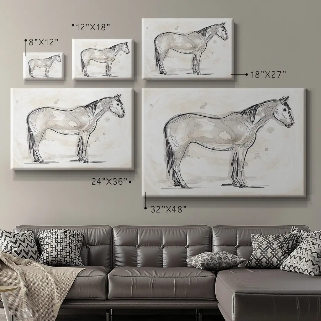 Vintage Equine Sketch II Premium Gallery Wrapped Canvas - Ready to Hang A premium hand stretched gallery wrapped canvas print created to last. Featuring a beveled a solid wood stretcher bar, each piece comes ready to hand 6 SIZES AVAILABLE 8''X12'' - Overall Size 12''X18'' - Overall Size 18''X27'' - Overall Size 24''x36'' - Overall Size 32''x48'' - Overall Size 40''x60'' - Overall Size Each piece is made to order. Built to Last Each piece comes ready to hang Solid wood stretcher Fade and Water resistant Made domestically