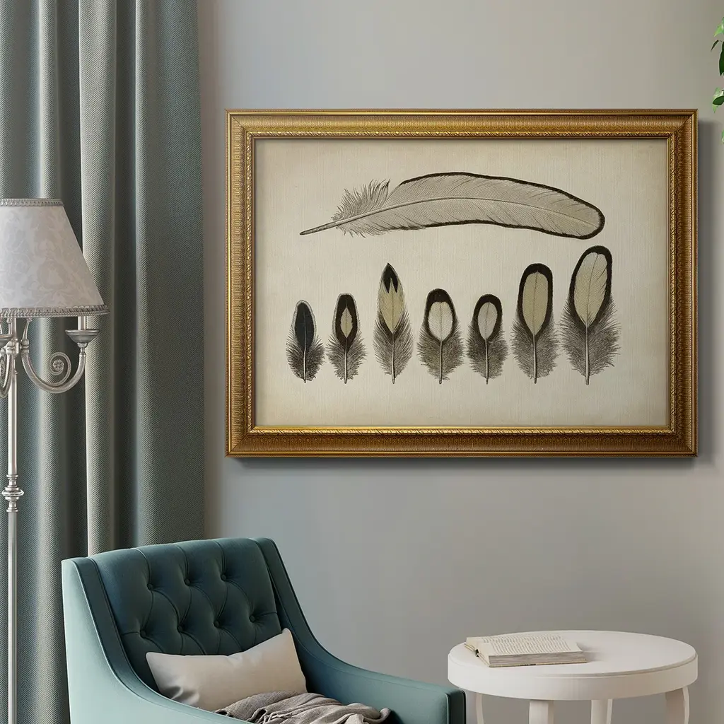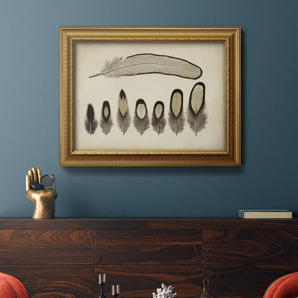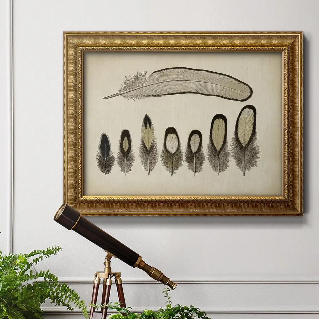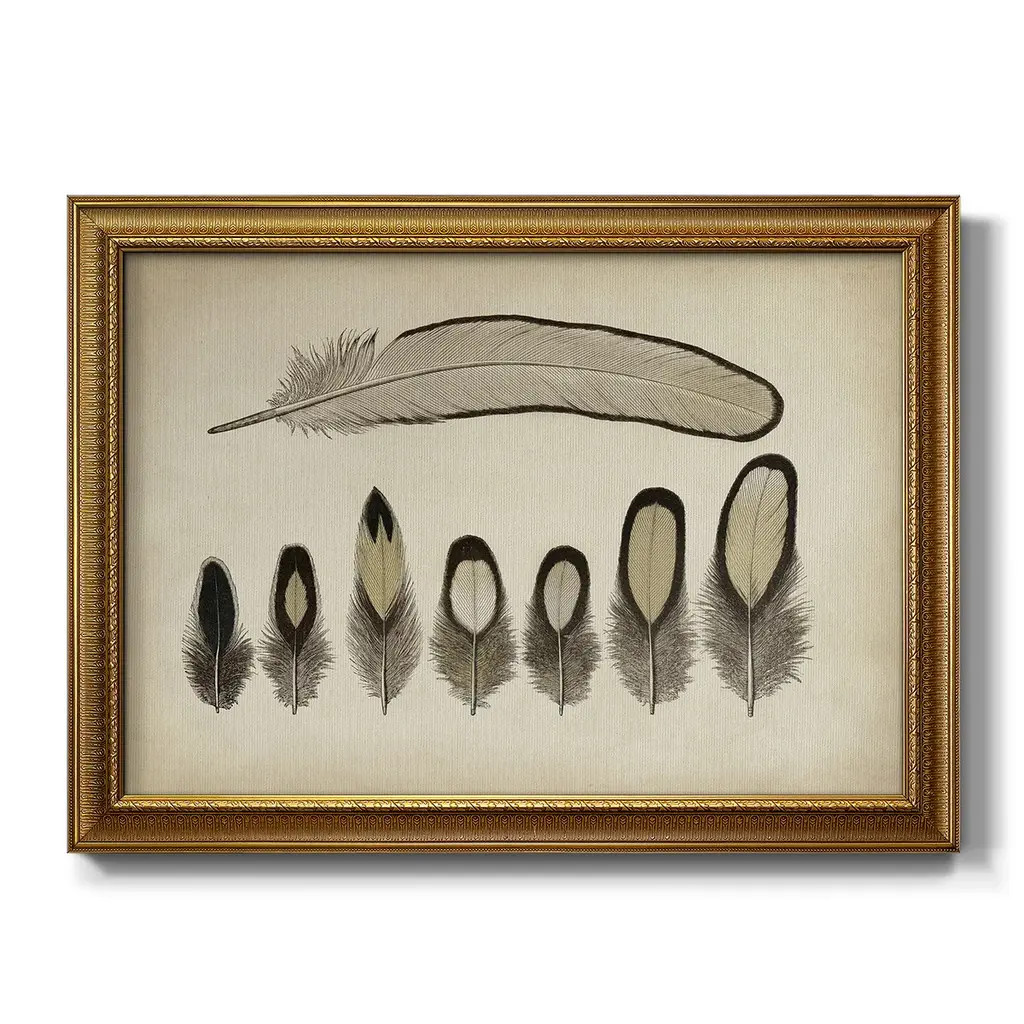 Vintage Feathers IX Premium Framed Canvas- Ready to Hang A Premium Framed Canvas created to last. Framed in distressed wood and available in an array of sizes and colors Featuring a beveled a solid wood stretcher bar, each piece comes ready to hand 3 SIZES AVAILABLE 16''X20'' - Overall Size 18'X27'' - Overall Size 24''x36'' - Overall Size Each piece is made to order. Each piece comes with hanging hardware. Made in the USA Ready to Hang Giclee Paper Print Acrylic Glass Beveled Matt Board