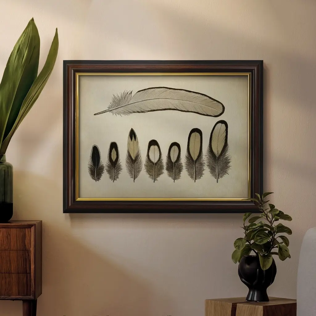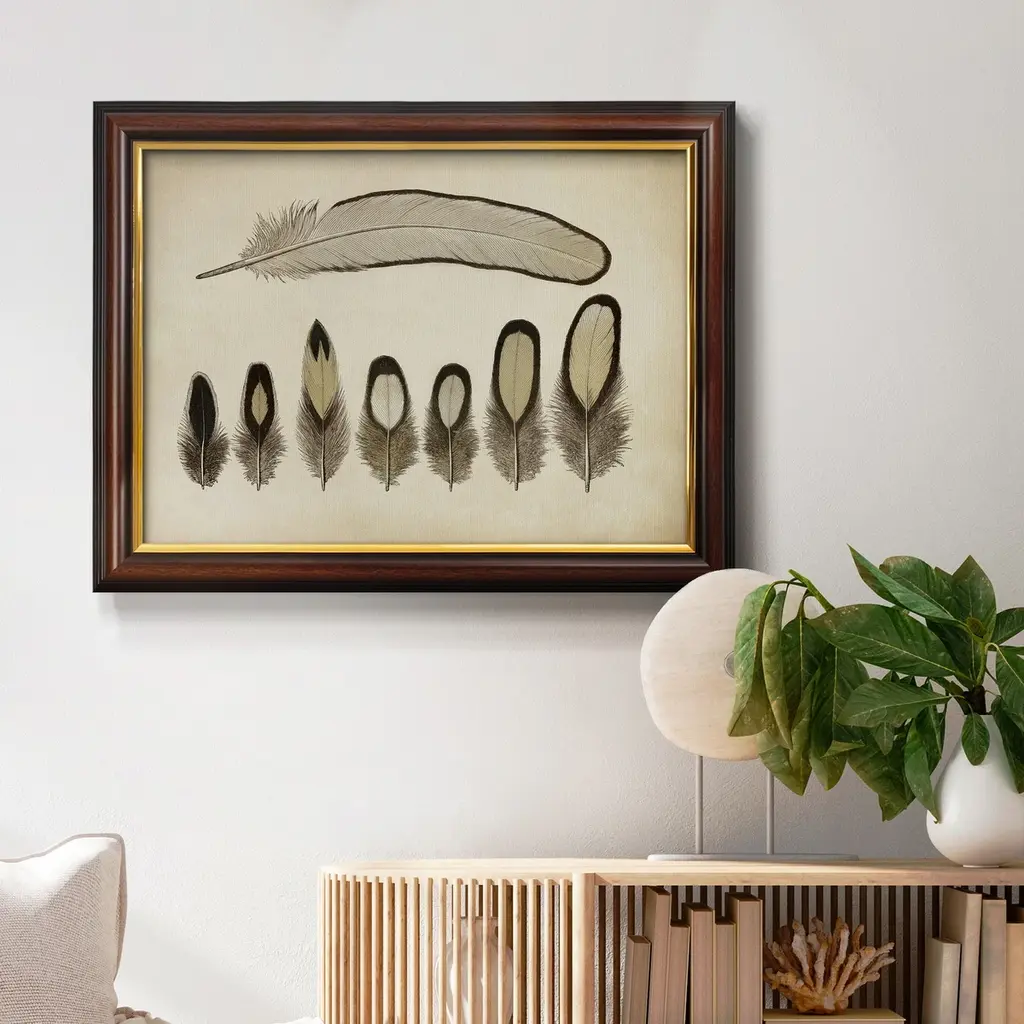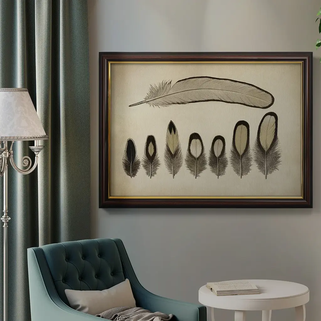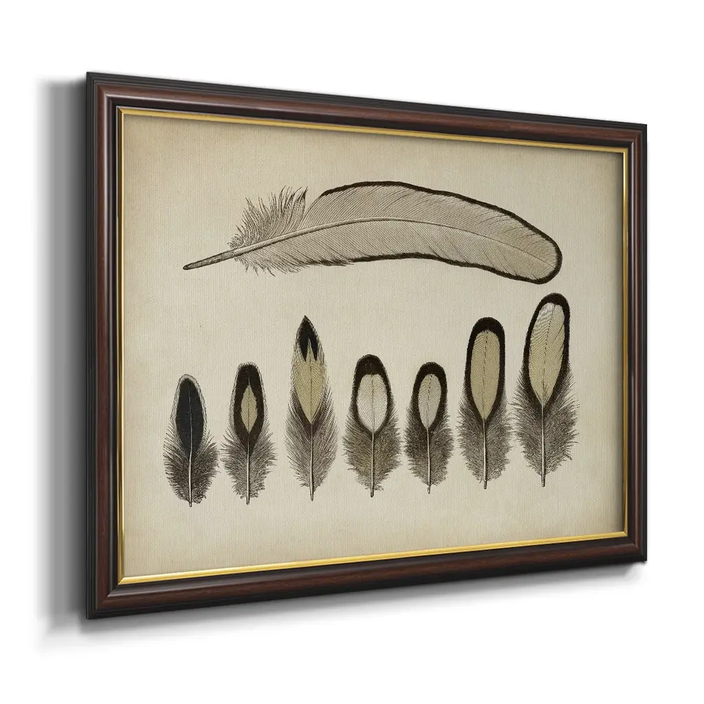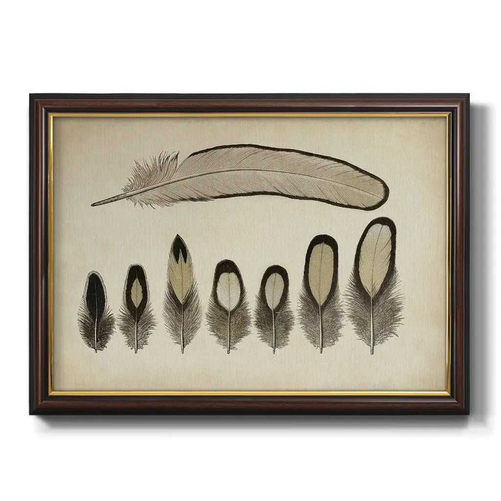 Vintage Feathers IX Premium Framed Canvas- Ready to Hang A Premium Framed Canvas created to last. Framed in distressed wood and available in an array of sizes and colors Featuring a beveled a solid wood stretcher bar, each piece comes ready to hand 3 SIZES AVAILABLE 16''X20'' - Overall Size 18'X27'' - Overall Size 24''x36'' - Overall Size Each piece is made to order. Each piece comes with hanging hardware. Made in the USA Ready to Hang Giclee Paper Print Acrylic Glass Beveled Matt Board