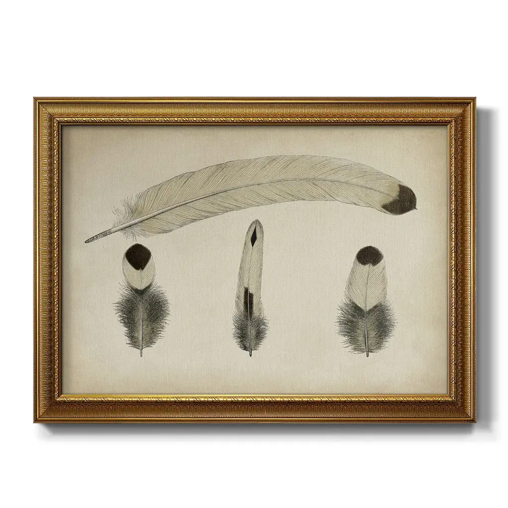 Vintage Feathers V Premium Framed Canvas- Ready to Hang A Premium Framed Canvas created to last. Framed in distressed wood and available in an array of sizes and colors Featuring a beveled a solid wood stretcher bar, each piece comes ready to hand 3 SIZES AVAILABLE 16''X20'' - Overall Size 18'X27'' - Overall Size 24''x36'' - Overall Size Each piece is made to order. Each piece comes with hanging hardware. Made in the USA Ready to Hang Giclee Paper Print Acrylic Glass Beveled Matt Board