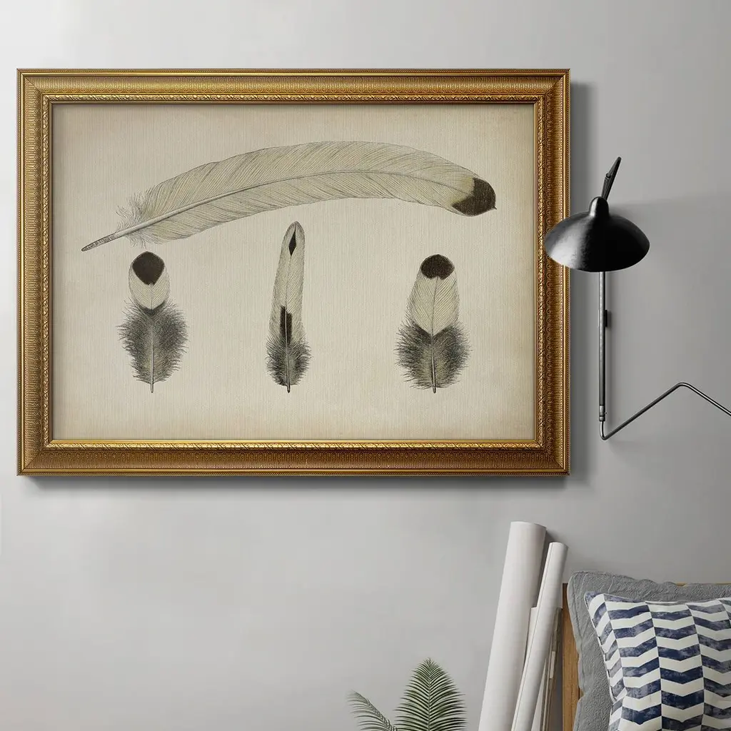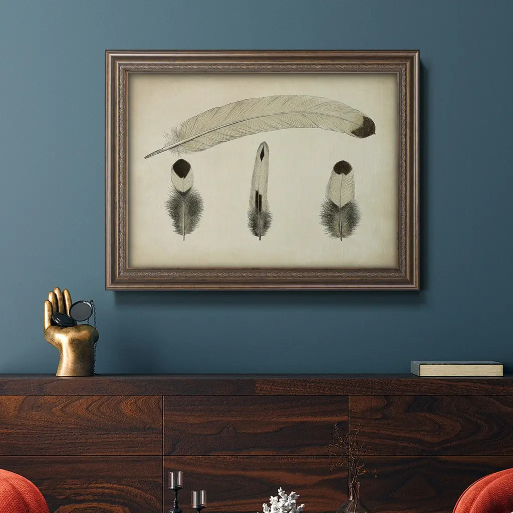 Vintage Feathers V Premium Framed Canvas- Ready to Hang A Premium Framed Canvas created to last. Framed in distressed wood and available in an array of sizes and colors Featuring a beveled a solid wood stretcher bar, each piece comes ready to hand 3 SIZES AVAILABLE 16''X20'' - Overall Size 18'X27'' - Overall Size 24''x36'' - Overall Size Each piece is made to order. Each piece comes with hanging hardware. Made in the USA Ready to Hang Giclee Paper Print Acrylic Glass Beveled Matt Board