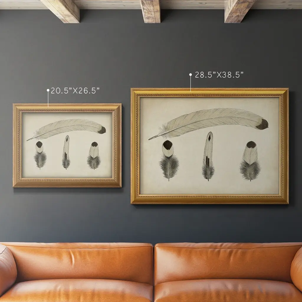 Vintage Feathers V Premium Framed Canvas- Ready to Hang A Premium Framed Canvas created to last. Framed in distressed wood and available in an array of sizes and colors Featuring a beveled a solid wood stretcher bar, each piece comes ready to hand 3 SIZES AVAILABLE 16''X20'' - Overall Size 18'X27'' - Overall Size 24''x36'' - Overall Size Each piece is made to order. Each piece comes with hanging hardware. Made in the USA Ready to Hang Giclee Paper Print Acrylic Glass Beveled Matt Board