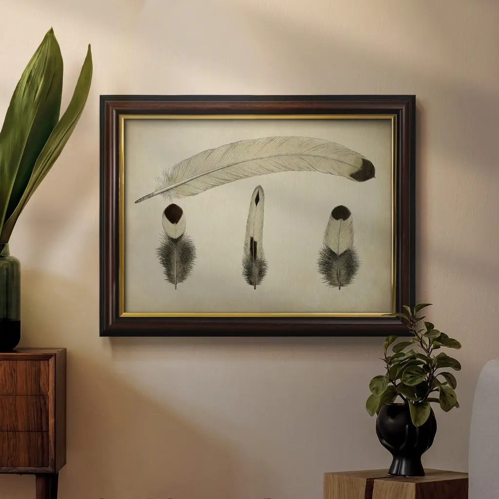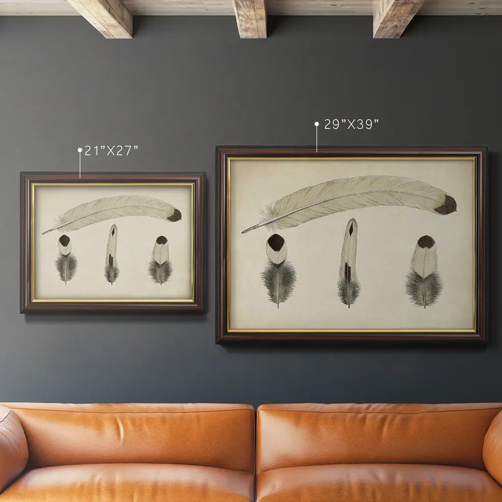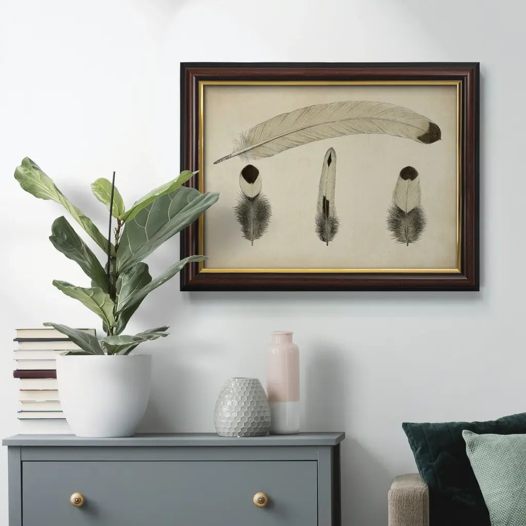 Vintage Feathers V Premium Framed Canvas- Ready to Hang A Premium Framed Canvas created to last. Framed in distressed wood and available in an array of sizes and colors Featuring a beveled a solid wood stretcher bar, each piece comes ready to hand 3 SIZES AVAILABLE 16''X20'' - Overall Size 18'X27'' - Overall Size 24''x36'' - Overall Size Each piece is made to order. Each piece comes with hanging hardware. Made in the USA Ready to Hang Giclee Paper Print Acrylic Glass Beveled Matt Board