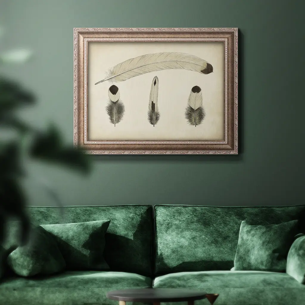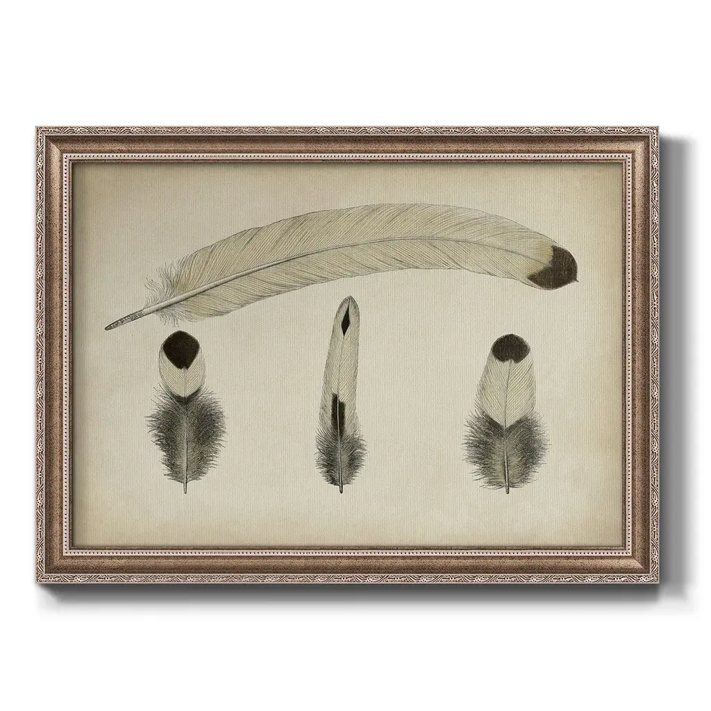 Vintage Feathers V Premium Framed Canvas- Ready to Hang A Premium Framed Canvas created to last. Framed in distressed wood and available in an array of sizes and colors Featuring a beveled a solid wood stretcher bar, each piece comes ready to hand 3 SIZES AVAILABLE 16''X20'' - Overall Size 18'X27'' - Overall Size 24''x36'' - Overall Size Each piece is made to order. Each piece comes with hanging hardware. Made in the USA Ready to Hang Giclee Paper Print Acrylic Glass Beveled Matt Board