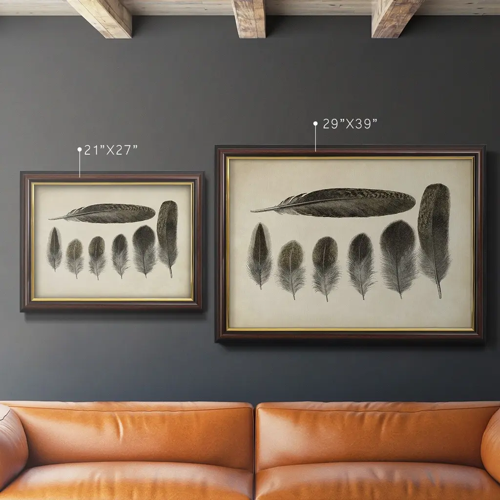 Vintage Feathers VI Premium Framed Canvas- Ready to Hang A Premium Framed Canvas created to last. Framed in distressed wood and available in an array of sizes and colors Featuring a beveled a solid wood stretcher bar, each piece comes ready to hand 3 SIZES AVAILABLE 16''X20'' - Overall Size 18'X27'' - Overall Size 24''x36'' - Overall Size Each piece is made to order. Each piece comes with hanging hardware. Made in the USA Ready to Hang Giclee Paper Print Acrylic Glass Beveled Matt Board