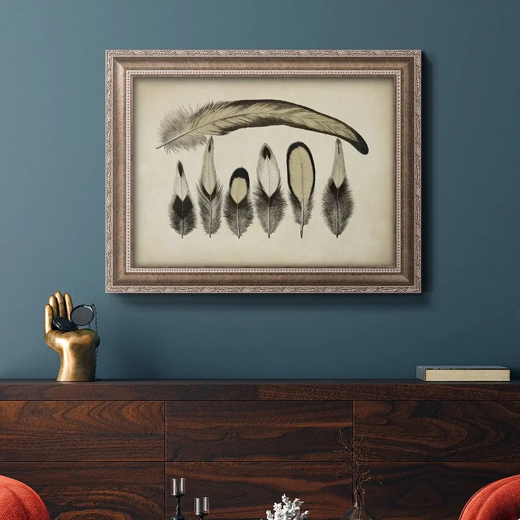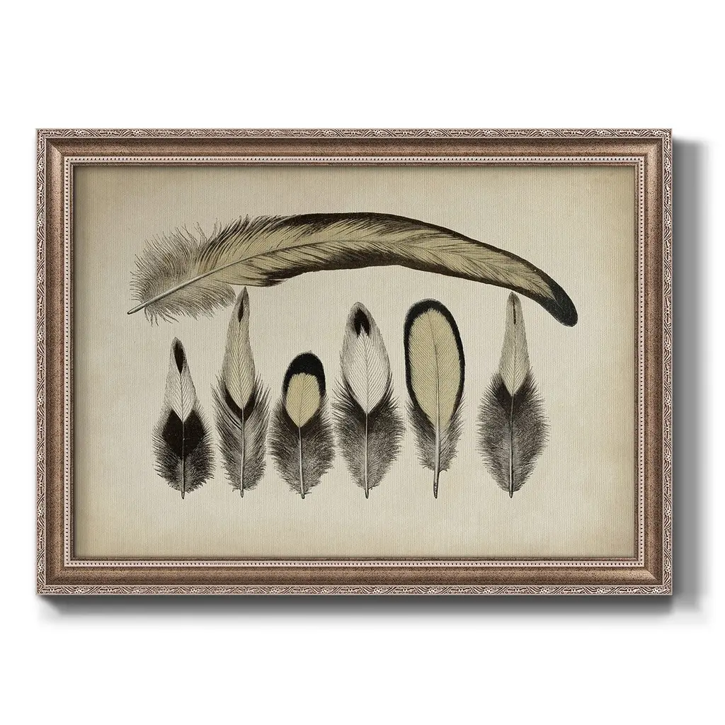 Vintage Feathers VII Premium Framed Canvas- Ready to Hang A Premium Framed Canvas created to last. Framed in distressed wood and available in an array of sizes and colors Featuring a beveled a solid wood stretcher bar, each piece comes ready to hand 3 SIZES AVAILABLE 16''X20'' - Overall Size 18'X27'' - Overall Size 24''x36'' - Overall Size Each piece is made to order. Each piece comes with hanging hardware. Made in the USA Ready to Hang Giclee Paper Print Acrylic Glass Beveled Matt Board