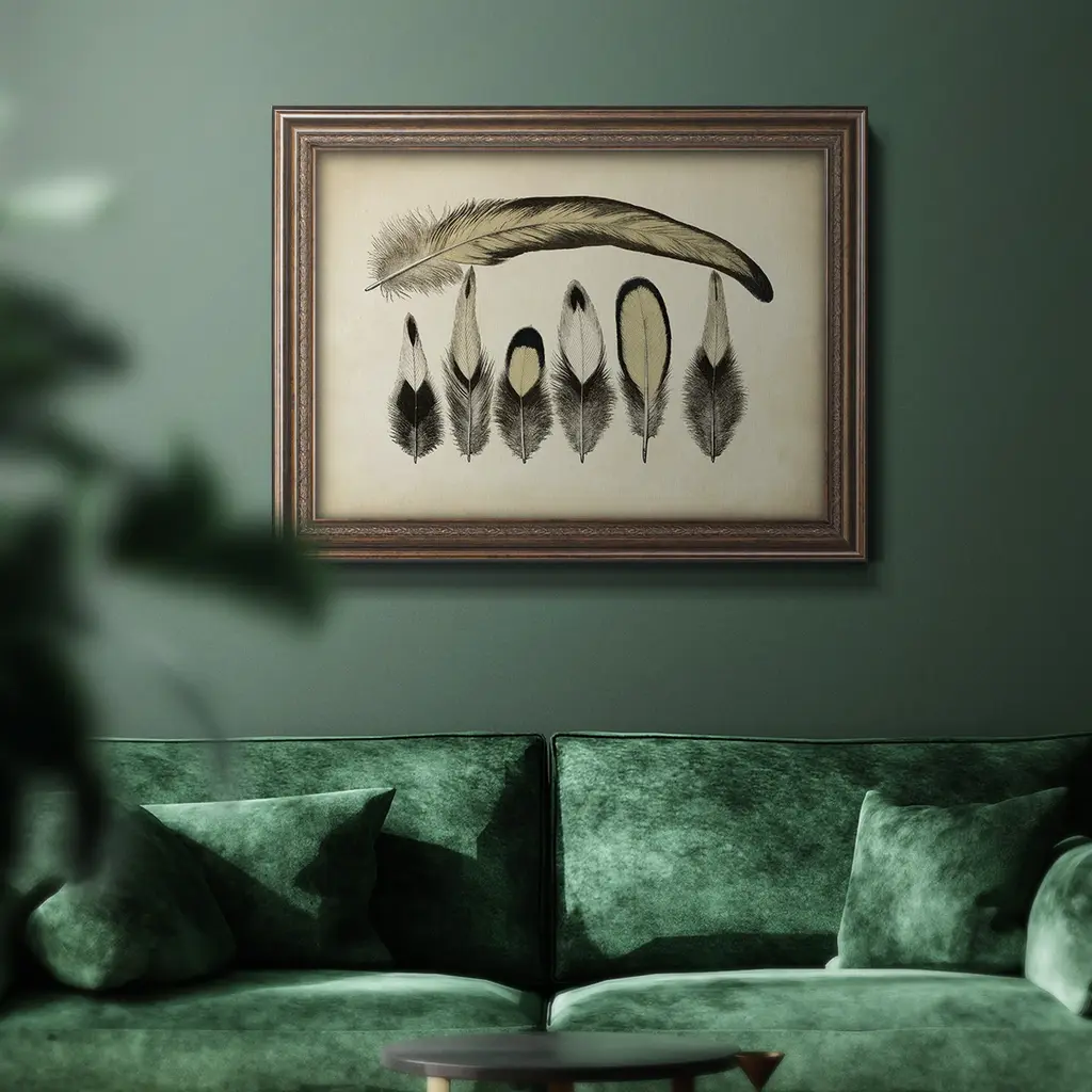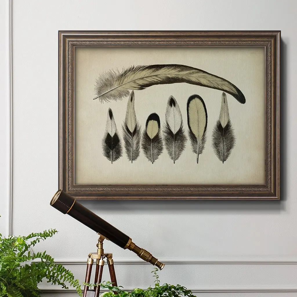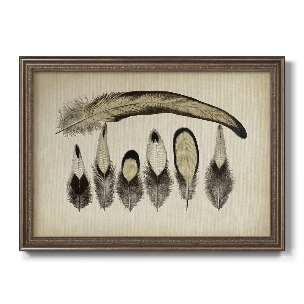 Vintage Feathers VII Premium Framed Canvas- Ready to Hang A Premium Framed Canvas created to last. Framed in distressed wood and available in an array of sizes and colors Featuring a beveled a solid wood stretcher bar, each piece comes ready to hand 3 SIZES AVAILABLE 16''X20'' - Overall Size 18'X27'' - Overall Size 24''x36'' - Overall Size Each piece is made to order. Each piece comes with hanging hardware. Made in the USA Ready to Hang Giclee Paper Print Acrylic Glass Beveled Matt Board