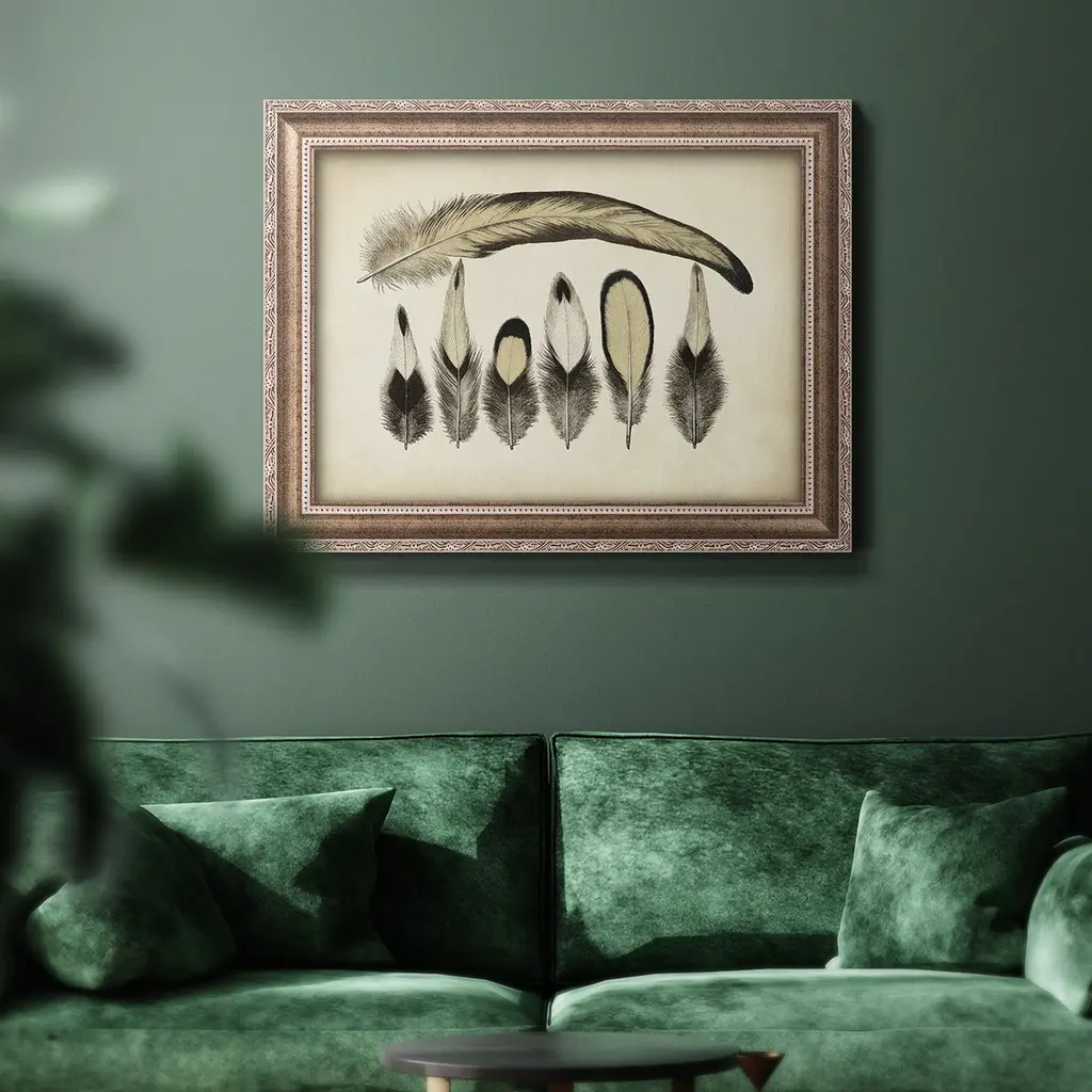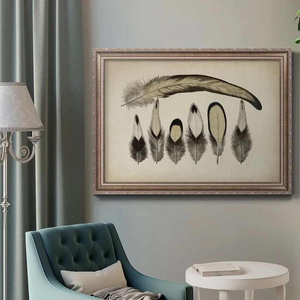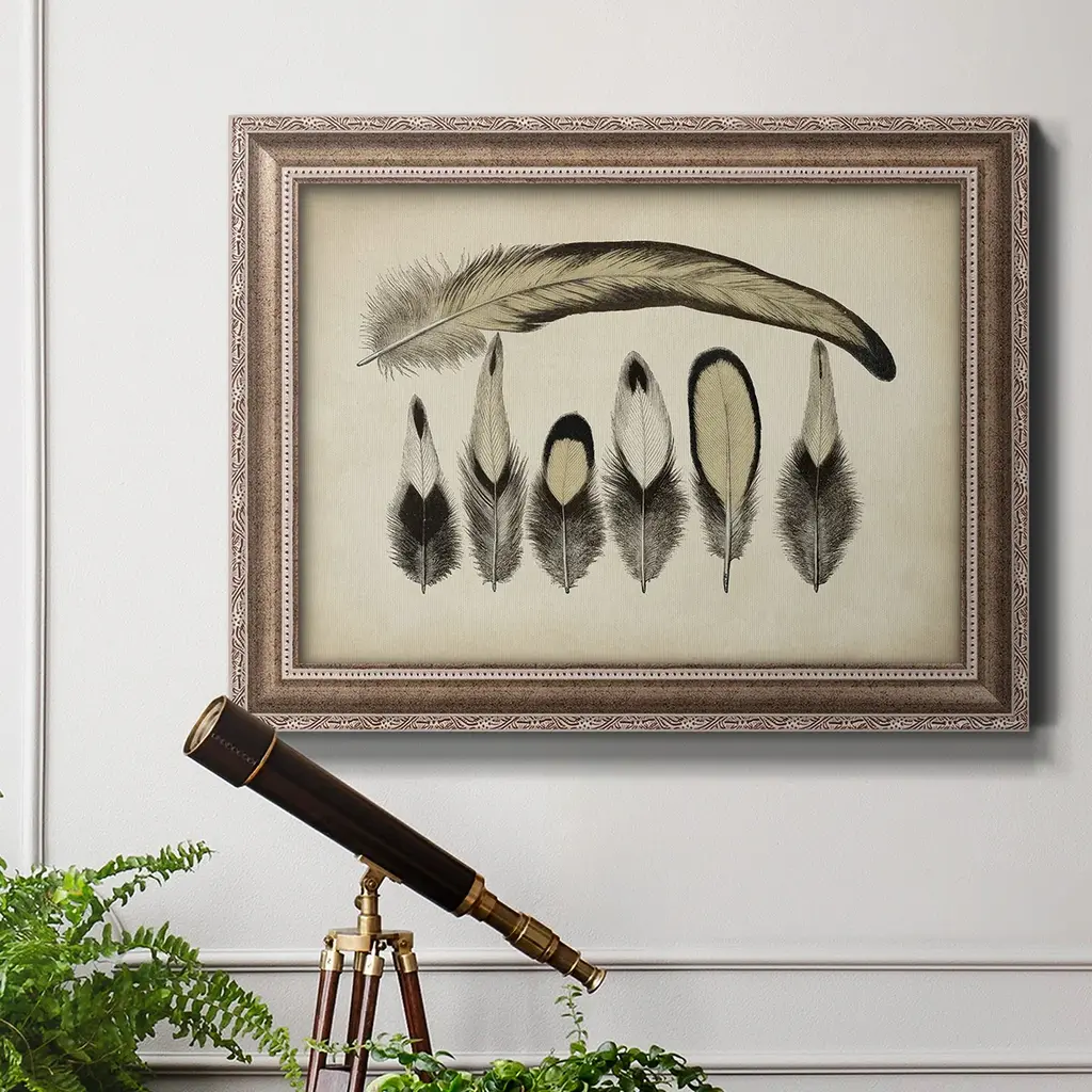 Vintage Feathers VII Premium Framed Canvas- Ready to Hang A Premium Framed Canvas created to last. Framed in distressed wood and available in an array of sizes and colors Featuring a beveled a solid wood stretcher bar, each piece comes ready to hand 3 SIZES AVAILABLE 16''X20'' - Overall Size 18'X27'' - Overall Size 24''x36'' - Overall Size Each piece is made to order. Each piece comes with hanging hardware. Made in the USA Ready to Hang Giclee Paper Print Acrylic Glass Beveled Matt Board