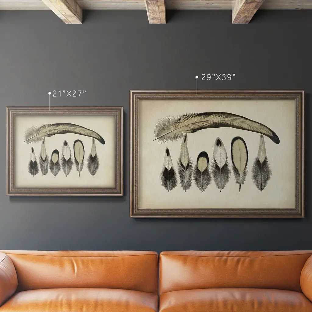 Vintage Feathers VII Premium Framed Canvas- Ready to Hang A Premium Framed Canvas created to last. Framed in distressed wood and available in an array of sizes and colors Featuring a beveled a solid wood stretcher bar, each piece comes ready to hand 3 SIZES AVAILABLE 16''X20'' - Overall Size 18'X27'' - Overall Size 24''x36'' - Overall Size Each piece is made to order. Each piece comes with hanging hardware. Made in the USA Ready to Hang Giclee Paper Print Acrylic Glass Beveled Matt Board