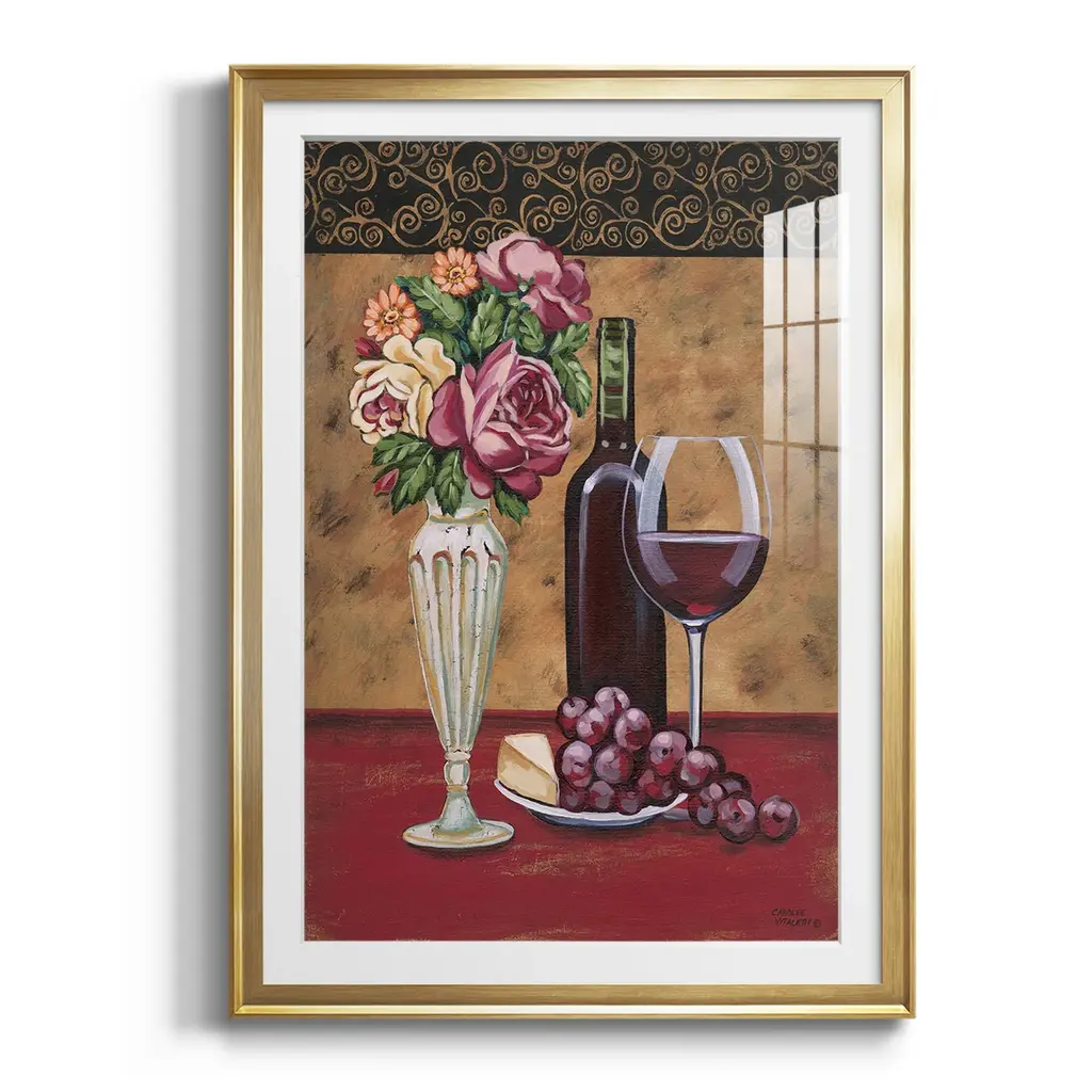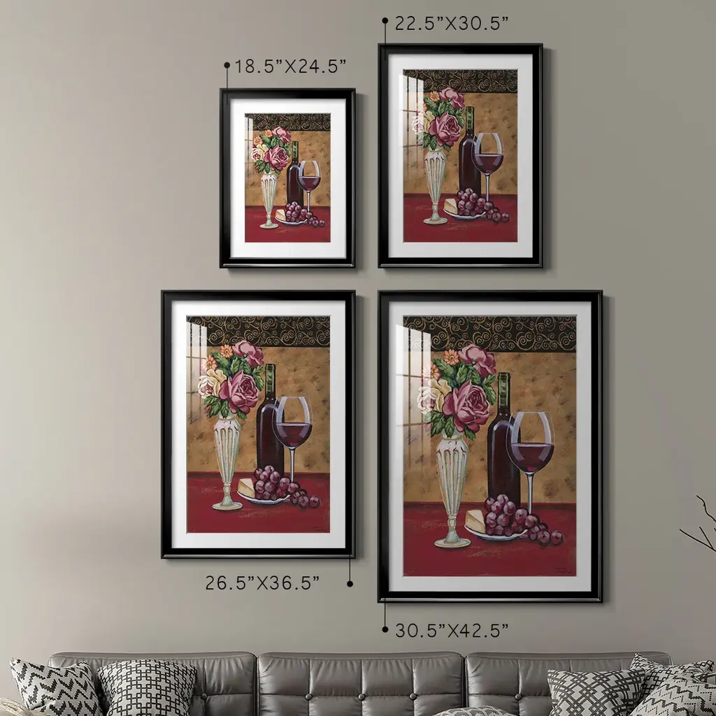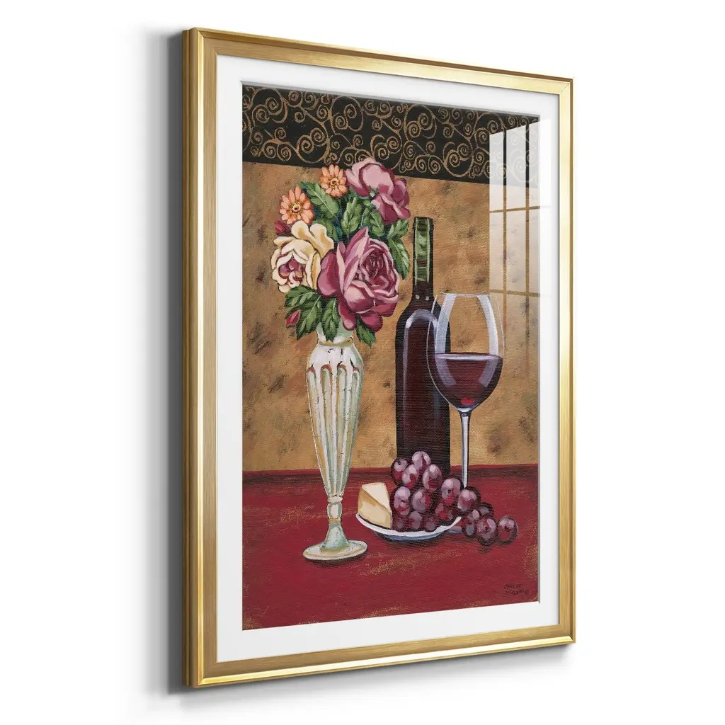 Vintage Flowers and Wine I Premium Framed Print - Ready to Hang A Premium Framed Print created to last. Framed in distressed wood and available in an array of sizes and colors Featuring a beveled a solid wood stretcher bar, each piece comes ready to hand 4 SIZES AVAILABLE 30.5''X42.5'' - Overall Size 26.5'X36.5'' - Overall Size 22.5''x30.5'' - Overall Size 18.5''x24.5'' - Overall Size Each piece is made to order. Each piece comes with hanging hardware. Made in the USA Ready to Hang Giclee Paper Print Acrylic Glass Beveled Matt Board