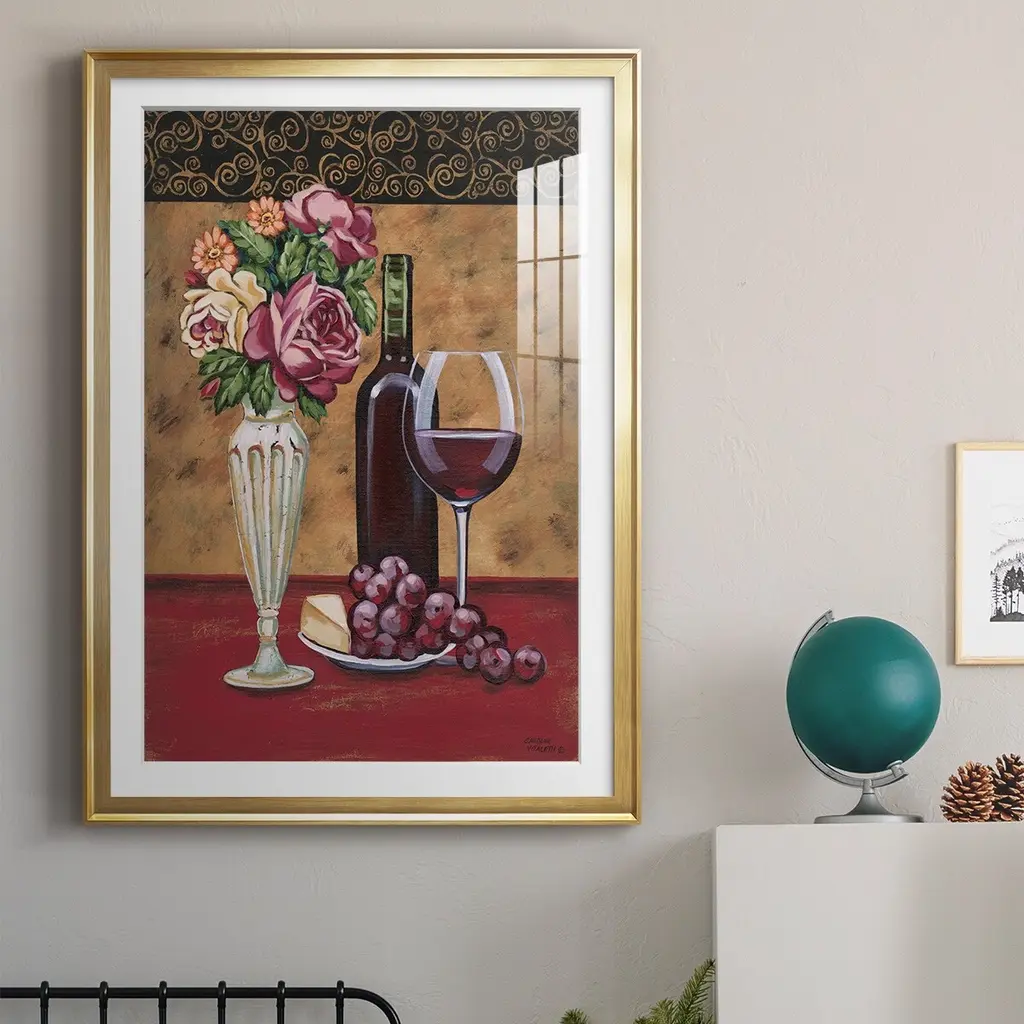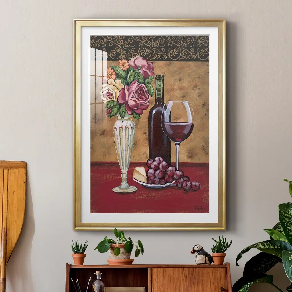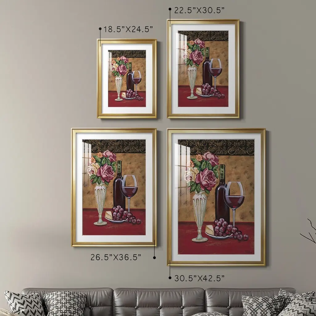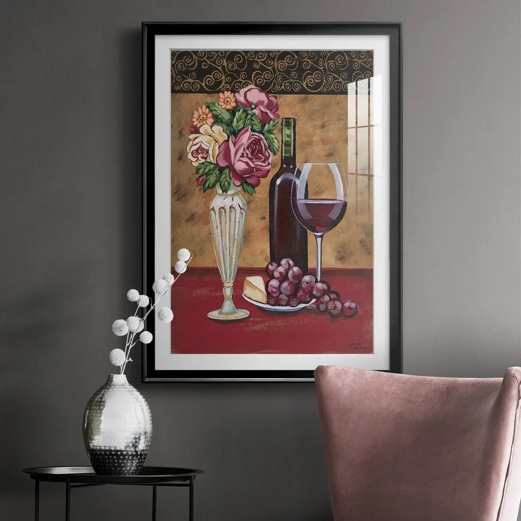 Vintage Flowers and Wine I Premium Framed Print - Ready to Hang A Premium Framed Print created to last. Framed in distressed wood and available in an array of sizes and colors Featuring a beveled a solid wood stretcher bar, each piece comes ready to hand 4 SIZES AVAILABLE 30.5''X42.5'' - Overall Size 26.5'X36.5'' - Overall Size 22.5''x30.5'' - Overall Size 18.5''x24.5'' - Overall Size Each piece is made to order. Each piece comes with hanging hardware. Made in the USA Ready to Hang Giclee Paper Print Acrylic Glass Beveled Matt Board