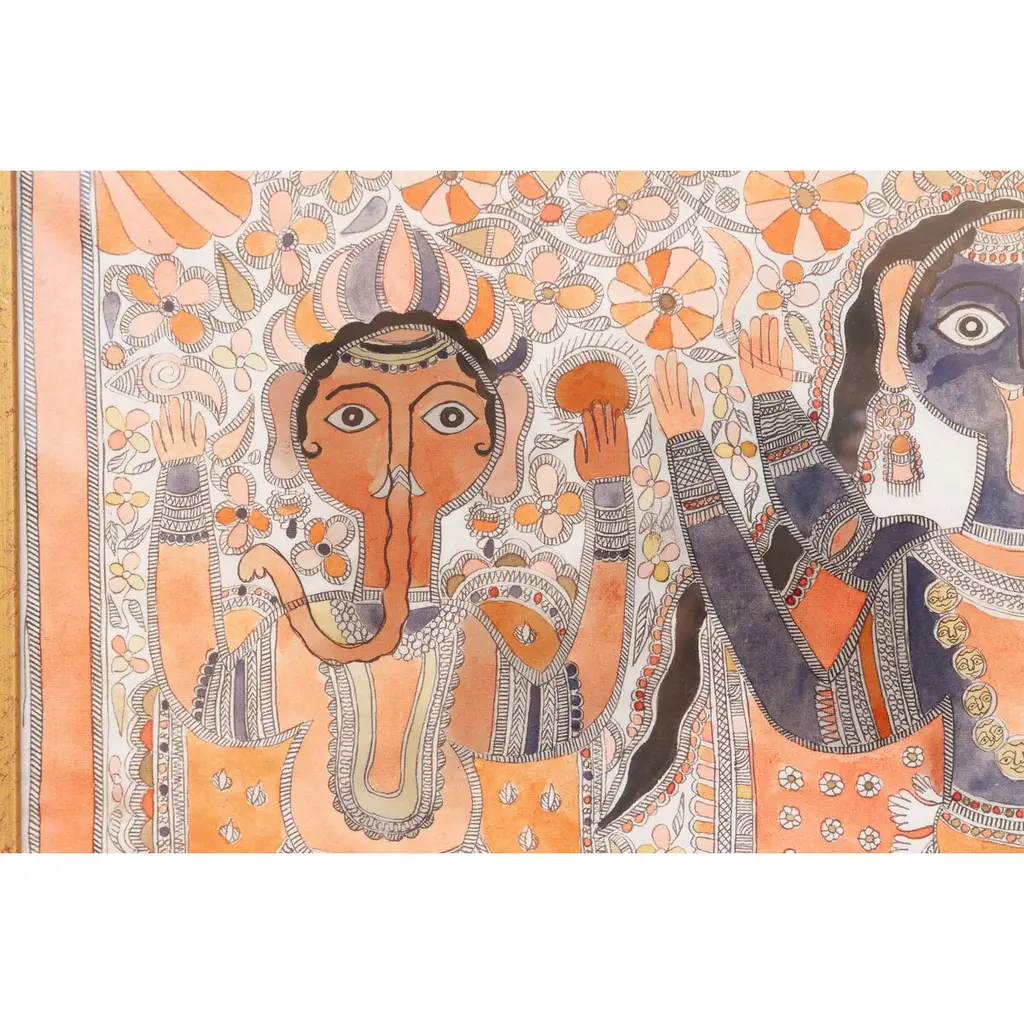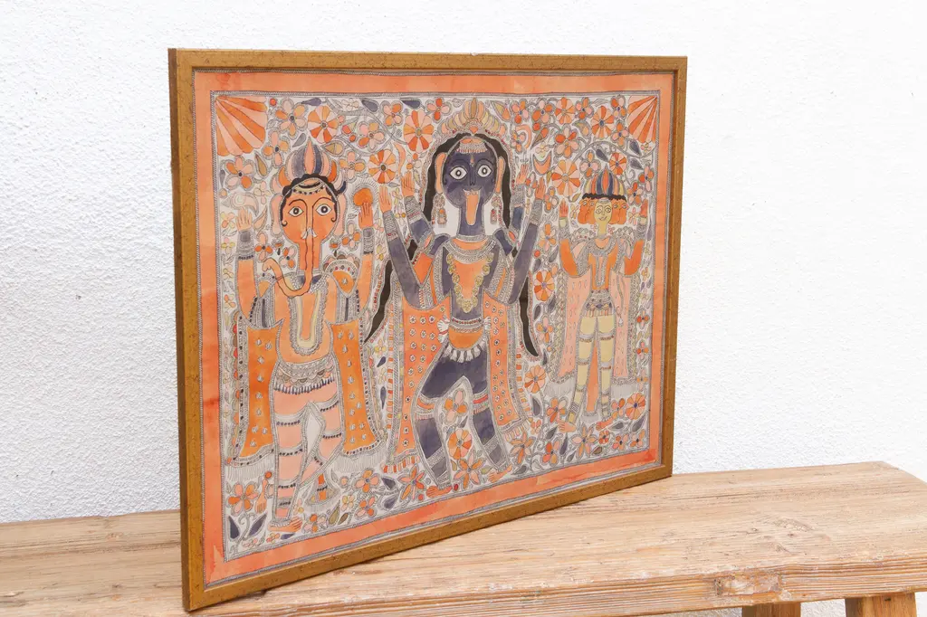 Bring vibrant Indian folk art into your space with this framed Madhubani painting, measuring 31" x 23". Hand-painted in the traditional Mithila style, it features mythological figures and deities, with intricate patterns and bold colors that define Madhubani art. A unique decorative piece, it highlights the skill of the artist and adds cultural depth and historical charm to any room—perfect as a standalone or part of a folk art collection.