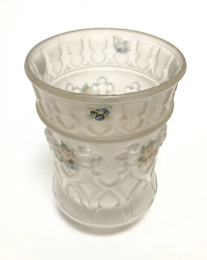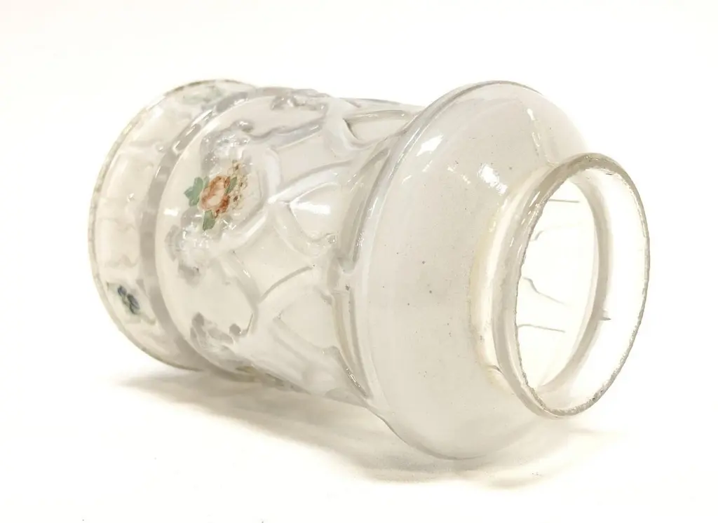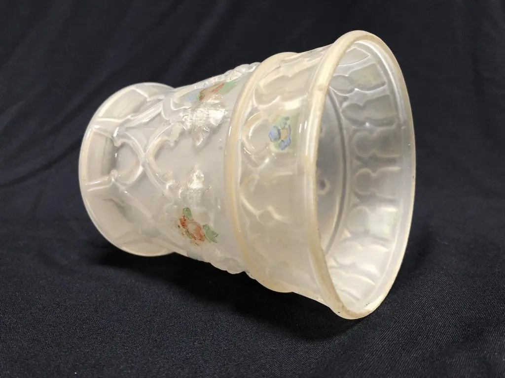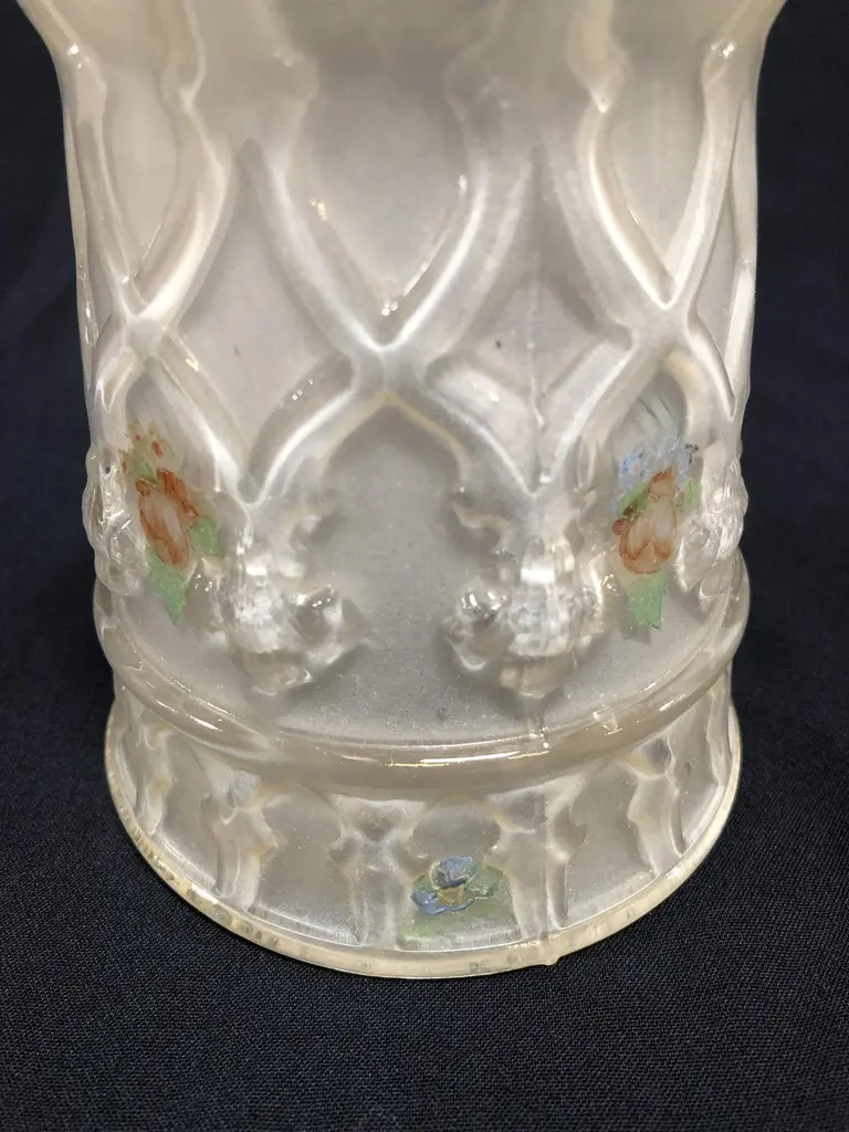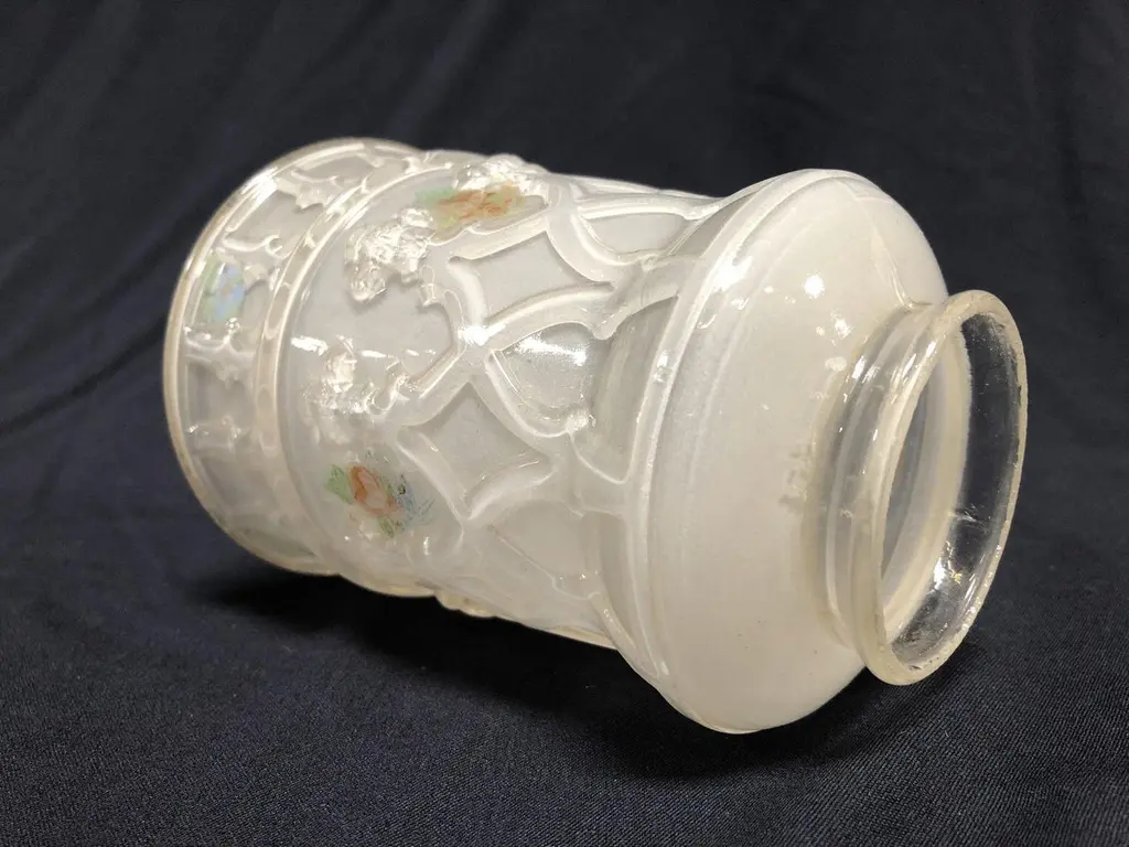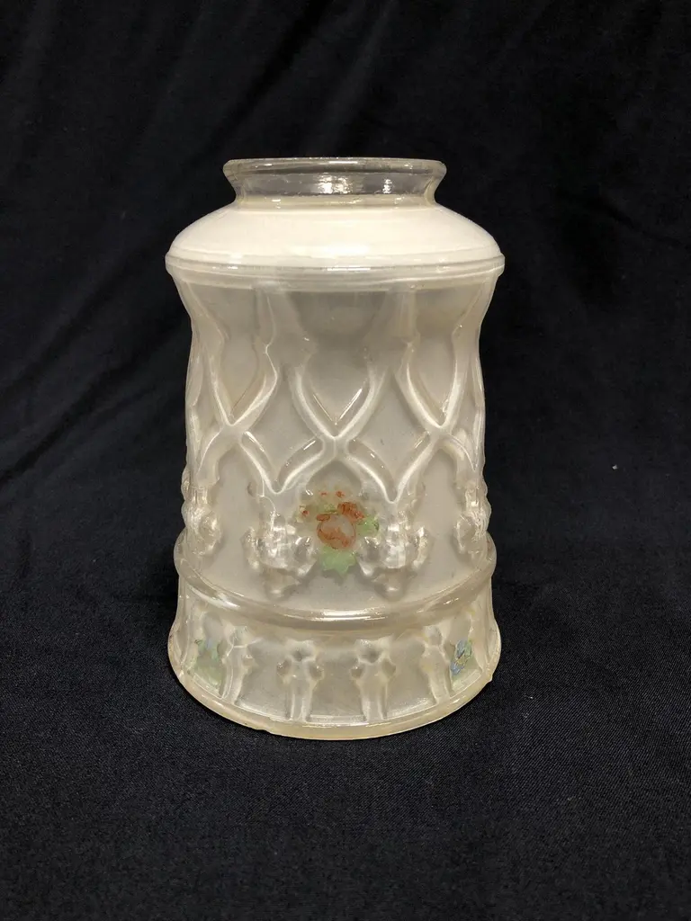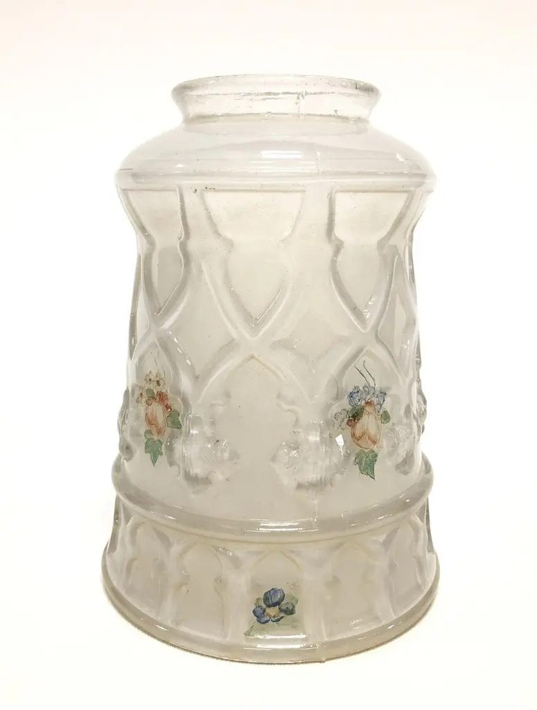 Vintage Frosted Glass Globe with a 4" inch opening for easy mounting with a gothic pattern and floral painting along the bottom5" Tall x 2' Fitter x 4" Opening