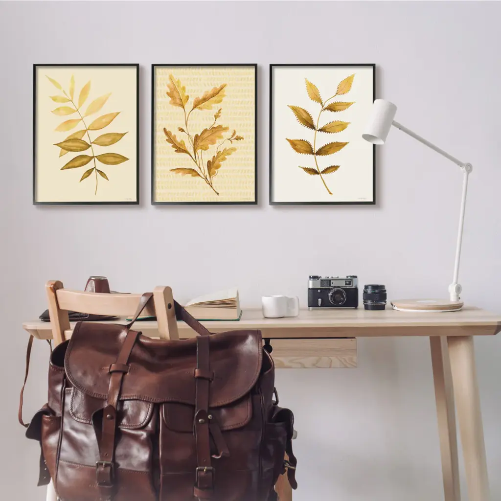 Vintage Golden Plant Leaves Natural Stripe Patterned Design , 3Pc, Each 16 X 20
