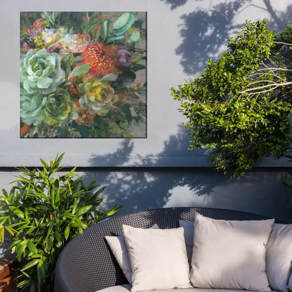 All weather outdoor canvas art. Transport yourself into nature with this stunning and vivid outdoor art piece. This unique and inspired artwork features bright, beautiful colors and is printed on canvas using giclee printing technology. Each piece is waterproof, UV protected, and gallery wrapped on vinyl stretcher bars, making it safe for the outdoors and keeping it protected from the elements. Hang this colorful, nature-inspired piece on your patio, porch or even a fence and watch as your outdoor living space is transformed.