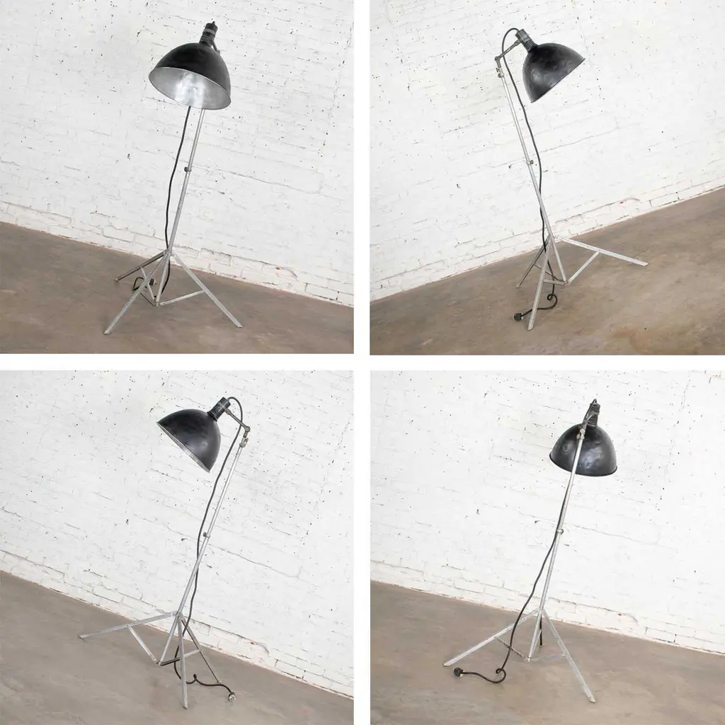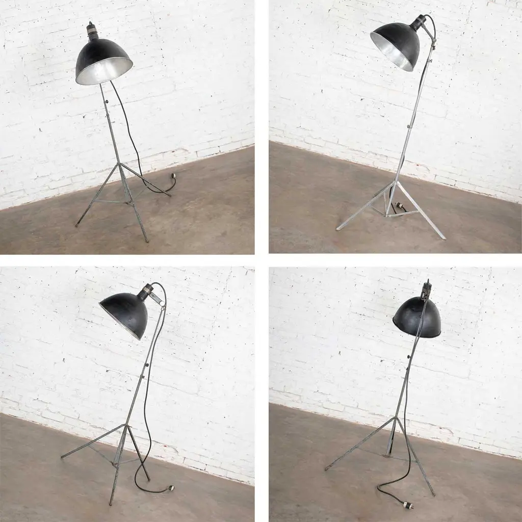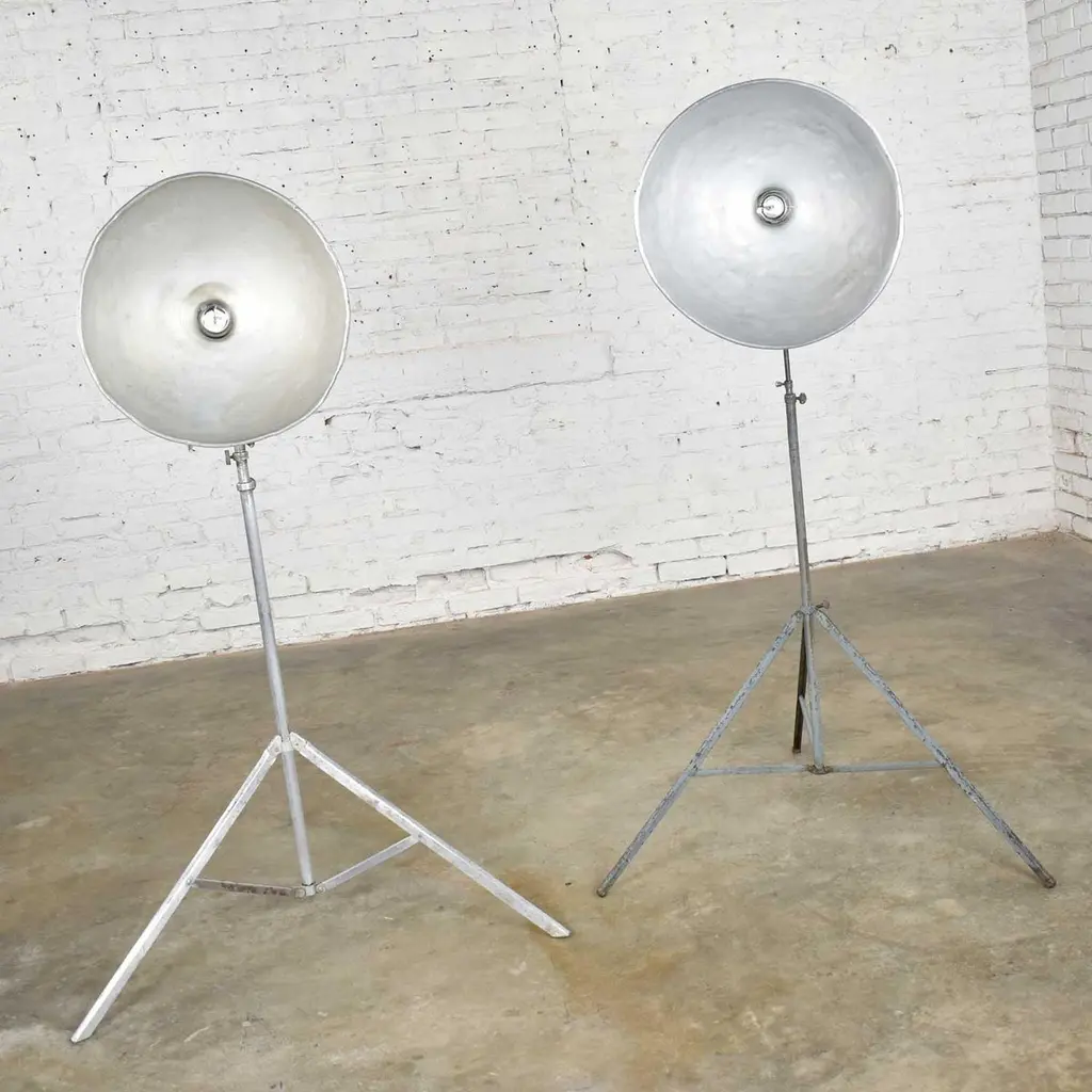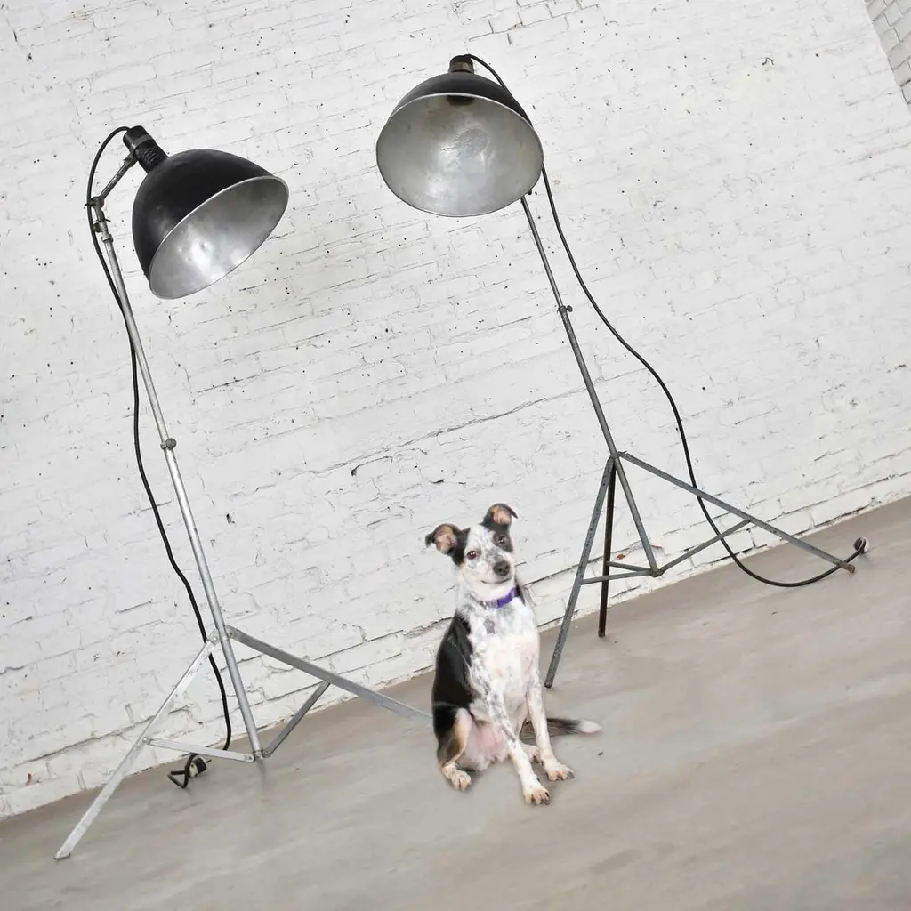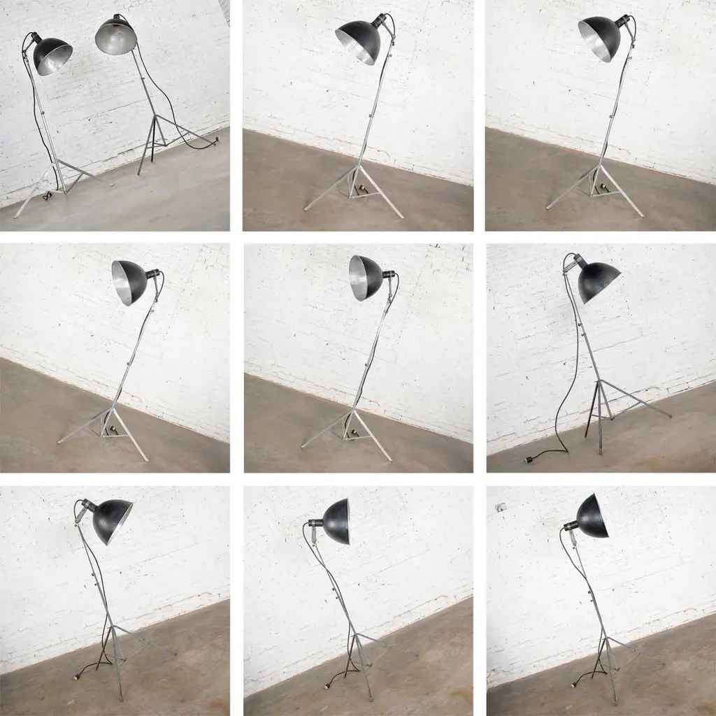 Fabulous vintage Industrial pair of aluminum and steel structured photographers floor lights with tripod bases. They are in wonderful vintage condition Beat up with lots of dents and patina. Fresh coat of texture paint on shades. Please see photos. Please note that we are selling these individually and the mogul base converter to standard bulbs included, circa 1940s-1950sThese lights are amazing!! Previously these beauties were used as photography lights, but they are just too versatile to be locked up in a studio somewhere. One frame is comprised of aluminum and the other frame is solid steel. They both have large dome shades and are adjustable with a 360-degree swivel. They have mogul base sockets that were made for larger bulbs but can be converted to standard or medium bulbs. Ideal to put in any room that needs a little touch of stylish lighting. They would be just the right touch of Industrial Design to your living room standing alongside your favorite lounge chair or next to a desk in your study. Although we are selling them individually, we think you need them both! They will add just the right spark of surprise to a more traditional or Mid-Century Modern setting or just the right touch to an Industrial style room. Useful, stylish, versatile, and unique are just a few ways to describe these floor lamps. You know you love them, make them yours!! Measures: Lamp large• O/A height to top of shade 51.5-132 inches• Height to top of socket 45.5 inches• Height to top of chrome base 34.5 inches• Base diameter 35 inches• Shaft diameter 1 inches• Dome size 16 inches• Weight with shade 11 poundsLamp small• O/A height to top of dome 51-92 inches• Height to top of socket 43.75 inches• Height to top of chrome base 34.75 inches• Base diameter 28 inches• Shaft diameter 0.75 inches• Dome size 15.5 inches• Weight with shade 8.1 poundsBoxed size 1• Height 22 inches• Width 30 inches• Depth 25 inches• Weight 15 poundsBoxed size 2• Height 22 inches• Width 38 inches• Depth 25 inches• Weight 35 pounds.