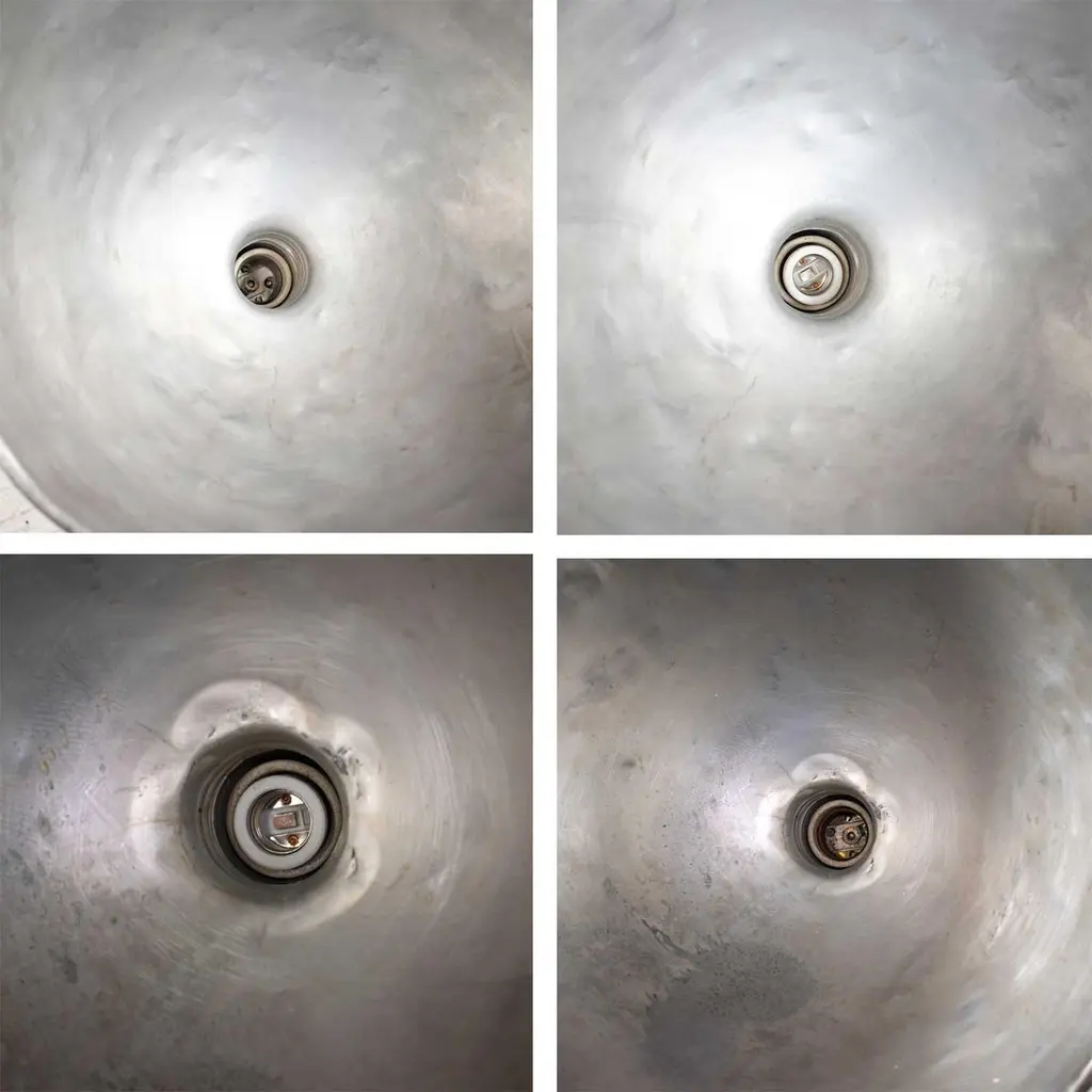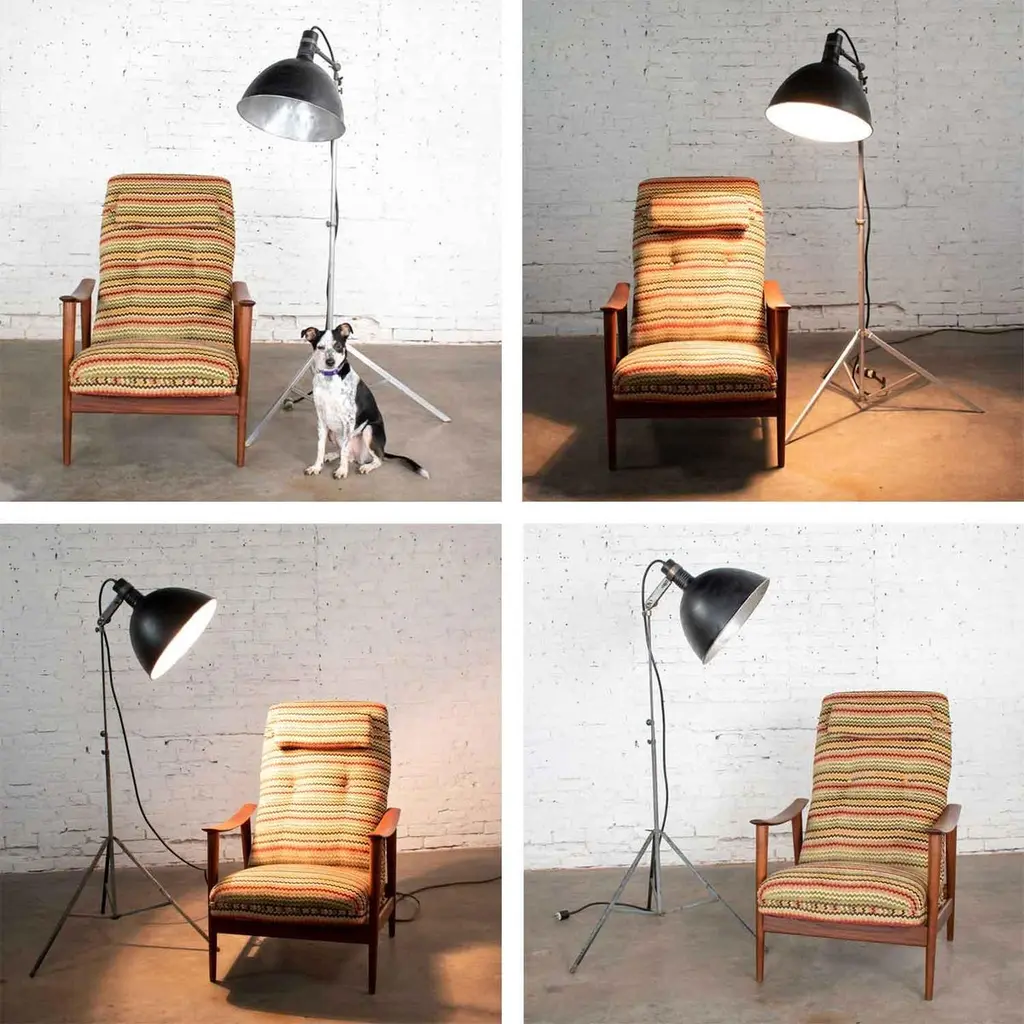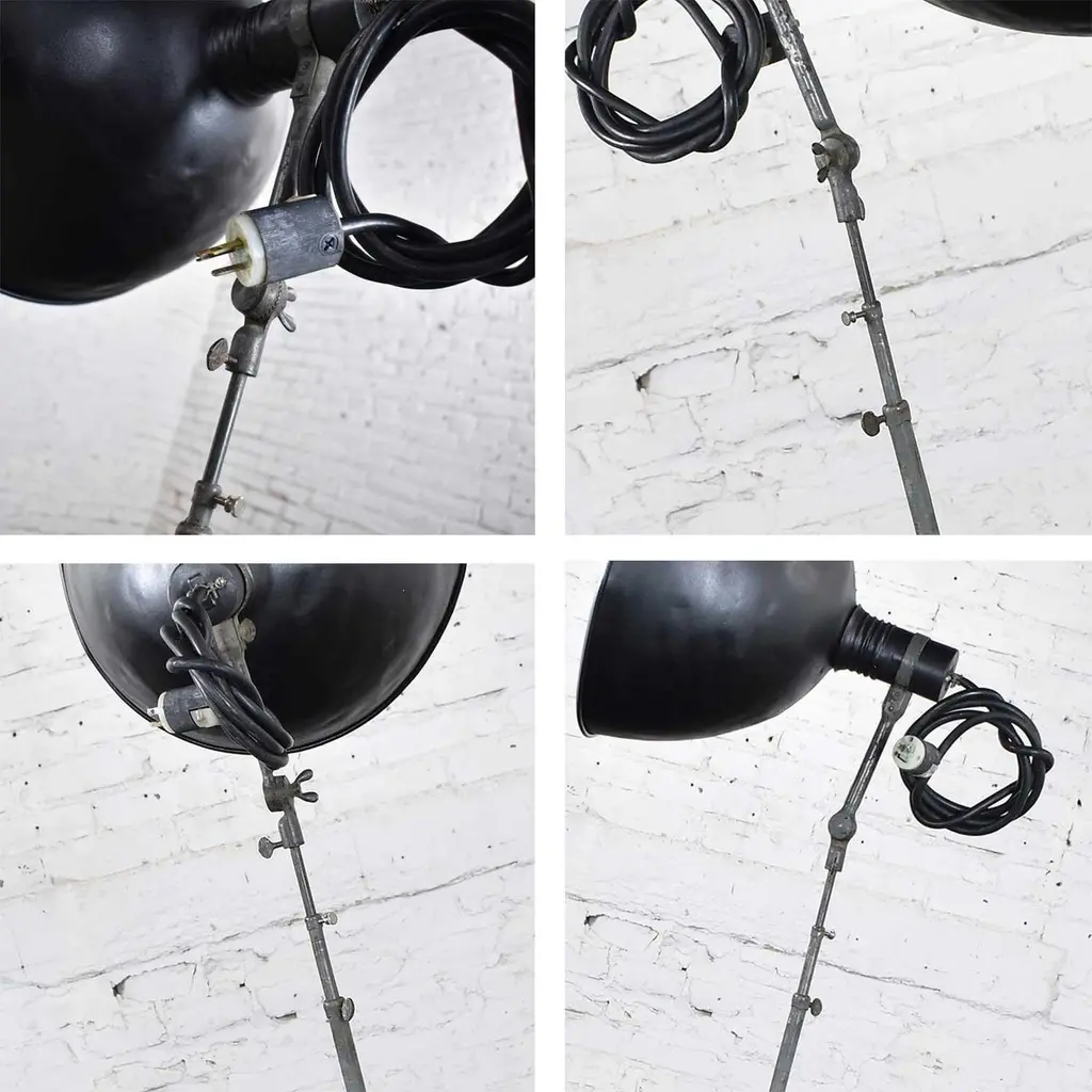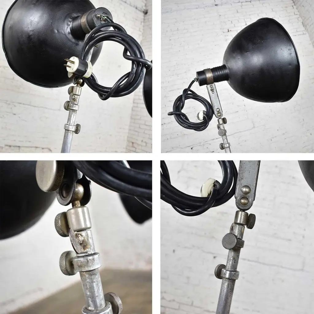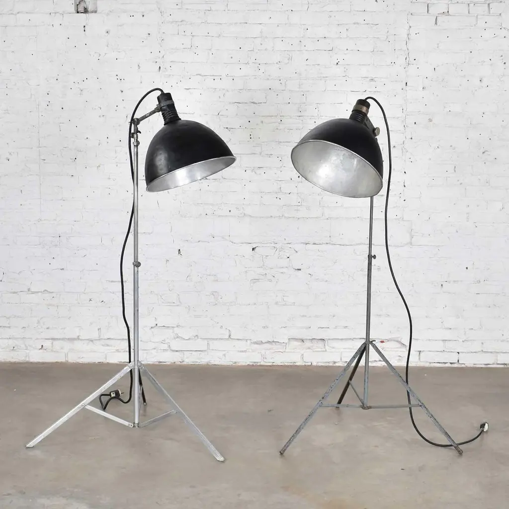 Fabulous vintage Industrial pair of aluminum and steel structured photographers floor lights with tripod bases. They are in wonderful vintage condition Beat up with lots of dents and patina. Fresh coat of texture paint on shades. Please see photos. Please note that we are selling these individually and the mogul base converter to standard bulbs included, circa 1940s-1950sThese lights are amazing!! Previously these beauties were used as photography lights, but they are just too versatile to be locked up in a studio somewhere. One frame is comprised of aluminum and the other frame is solid steel. They both have large dome shades and are adjustable with a 360-degree swivel. They have mogul base sockets that were made for larger bulbs but can be converted to standard or medium bulbs. Ideal to put in any room that needs a little touch of stylish lighting. They would be just the right touch of Industrial Design to your living room standing alongside your favorite lounge chair or next to a desk in your study. Although we are selling them individually, we think you need them both! They will add just the right spark of surprise to a more traditional or Mid-Century Modern setting or just the right touch to an Industrial style room. Useful, stylish, versatile, and unique are just a few ways to describe these floor lamps. You know you love them, make them yours!! Measures: Lamp large• O/A height to top of shade 51.5-132 inches• Height to top of socket 45.5 inches• Height to top of chrome base 34.5 inches• Base diameter 35 inches• Shaft diameter 1 inches• Dome size 16 inches• Weight with shade 11 poundsLamp small• O/A height to top of dome 51-92 inches• Height to top of socket 43.75 inches• Height to top of chrome base 34.75 inches• Base diameter 28 inches• Shaft diameter 0.75 inches• Dome size 15.5 inches• Weight with shade 8.1 poundsBoxed size 1• Height 22 inches• Width 30 inches• Depth 25 inches• Weight 15 poundsBoxed size 2• Height 22 inches• Width 38 inches• Depth 25 inches• Weight 35 pounds.