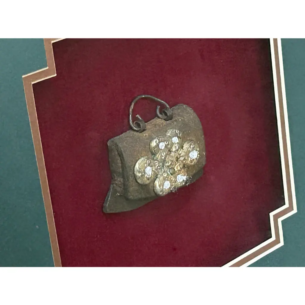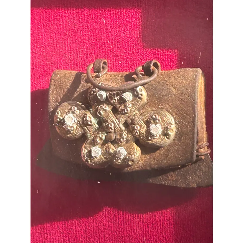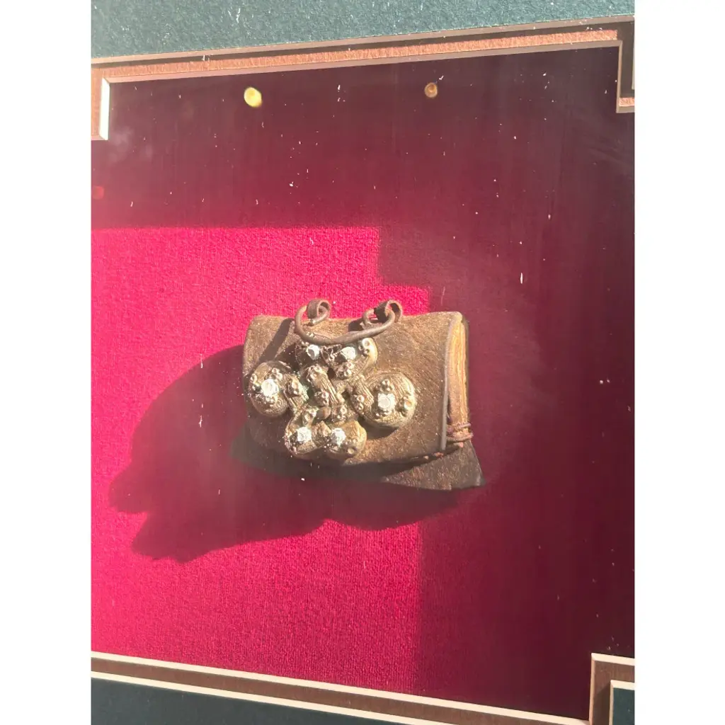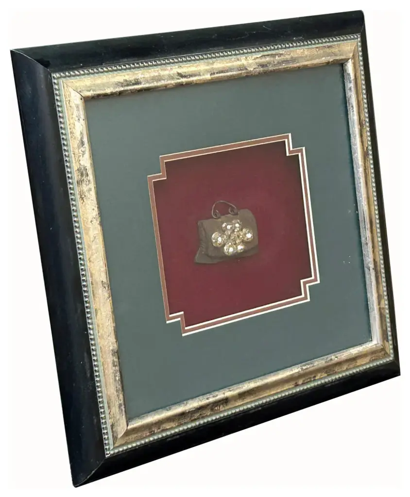 This vintage Oriental Tibetan-style flint pouch display is adorned with white and silver-colored beads arranged in an intricate infinite knot pattern, symbolizing eternal harmony and interconnectedness. Crafted from fine leather, the pouch is framed as a stunning piece of wall art, highlighting the rich cultural heritage and exquisite craftsmanship of Tibetan tradition. Perfect for adding a touch of history, spirituality, and elegance to any room, this framed display is both a meaningful and artistic addition to your decor.Dimensions: 15.5" Origin: ChinaMaterial: Wood frameCondition: hand made, minor chip distressed marks on the frame