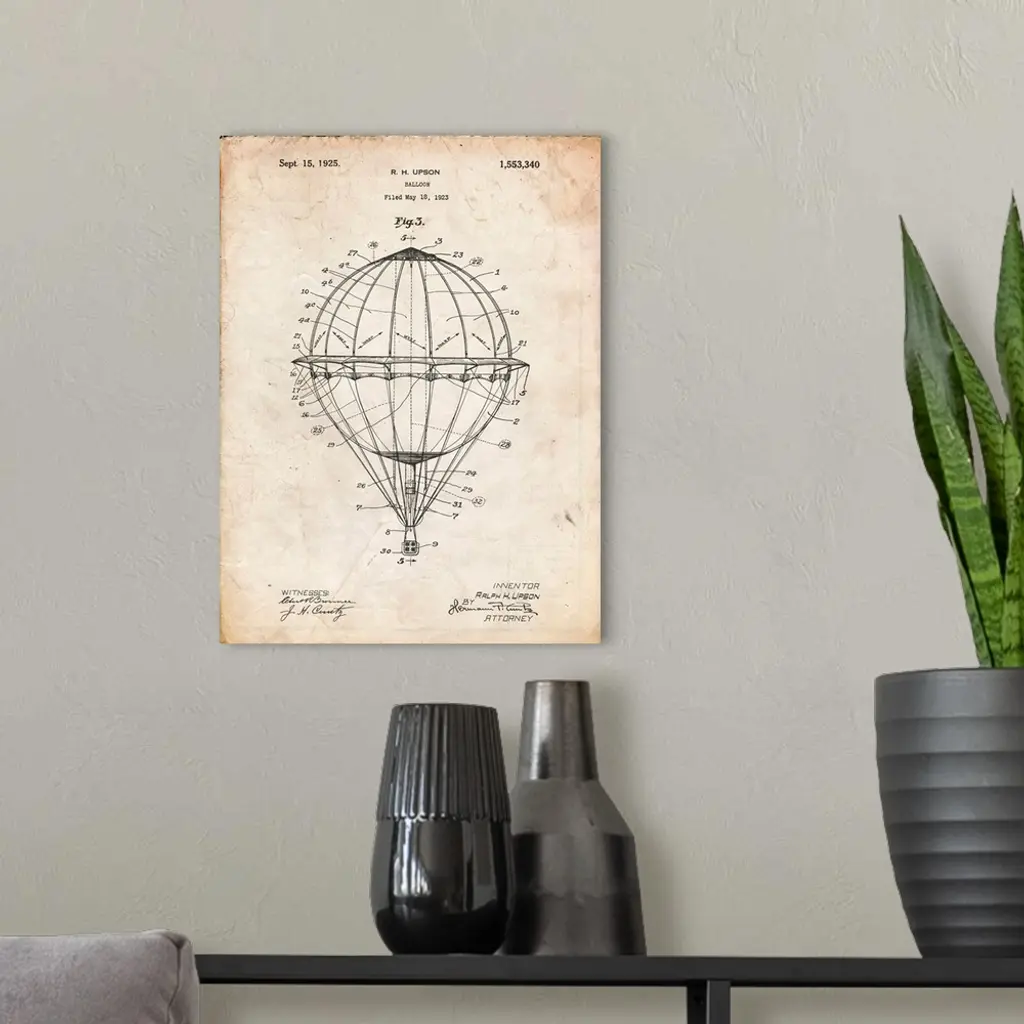 Vintage Parchment Hot Air Balloon 1923 Patent Poster wall art for home and office decor. Discover canvas art prints, photos, mural, big canvas art and framed wall art in GreatBigCanvas.com's varied collections.