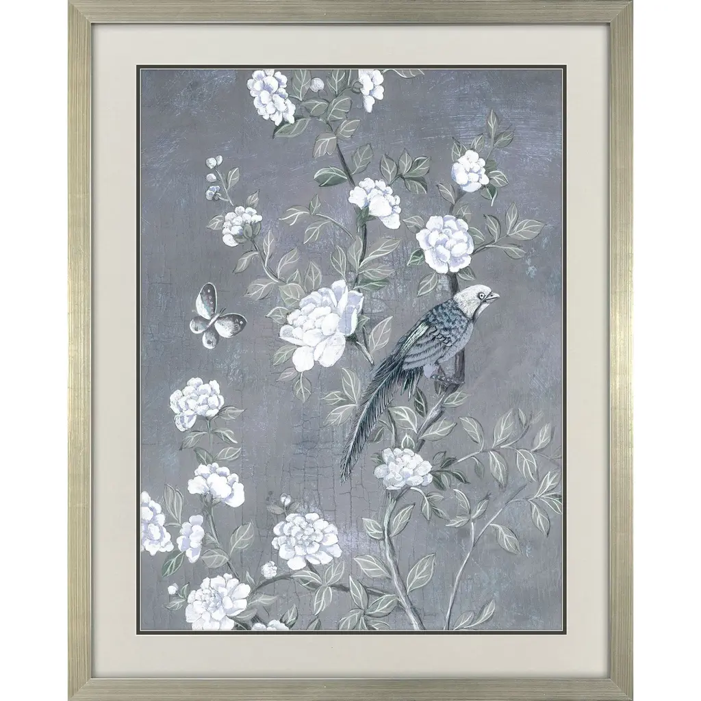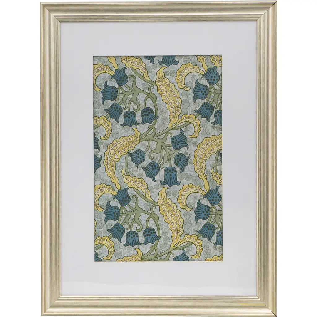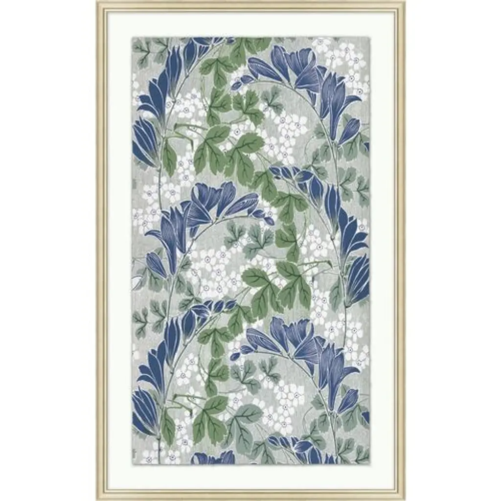 This reproduction of a vintage floral pattern is printed on deckled matte paper, floated over a white mat, and displayed in a silver-leaf-finished frame. Arrives ready to hang.