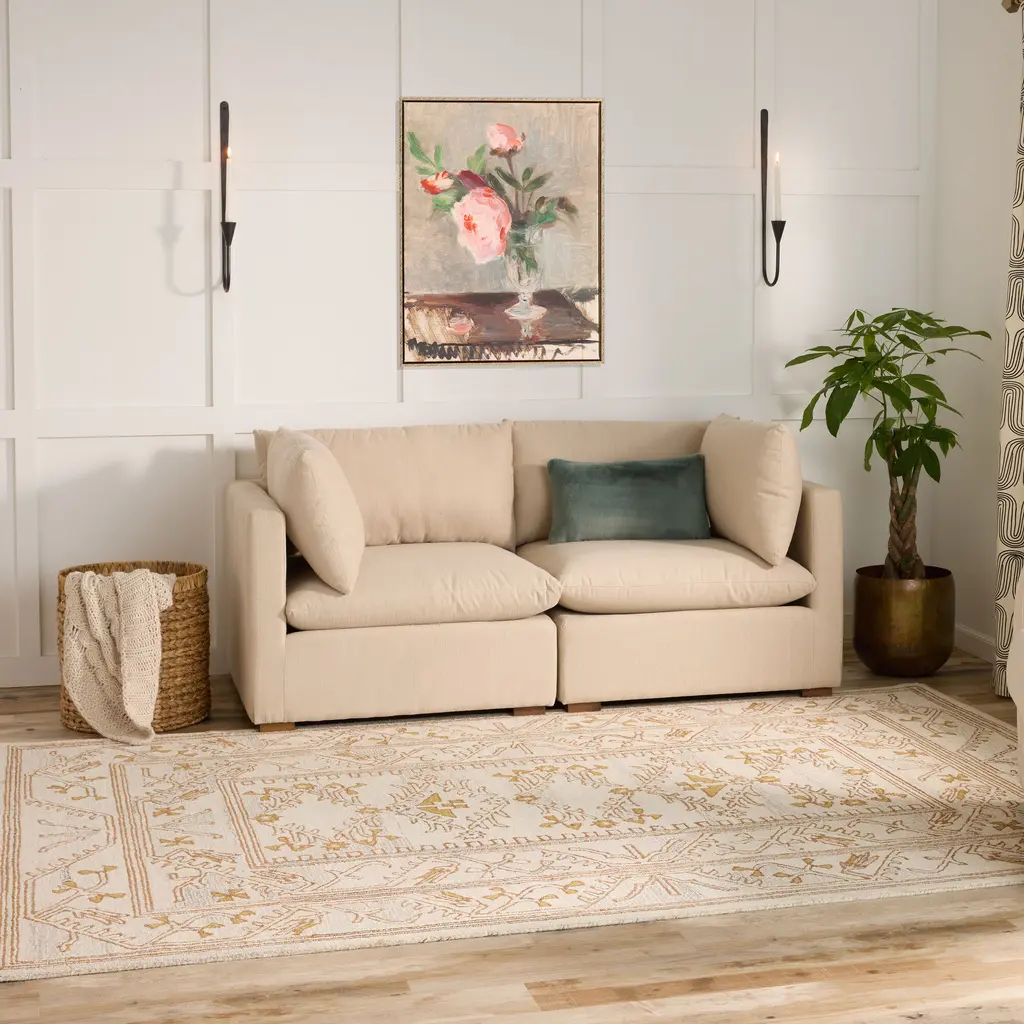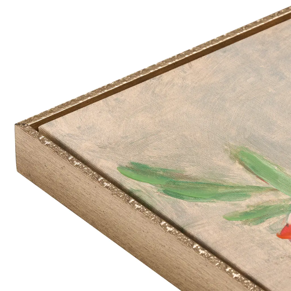 Our exclusive still life canvas wall art depicts a glass vase full of leafy pink peonies rendered in active, impressionistic brushstrokes. Set on a brown side table against a soft gray backdrop, this piece is full of visual texture and natural beauty. Ready to hang in an ornately detailed frame with champagne finish, it has a vintage look that lends a unique and cheerful vibe to living spaces.