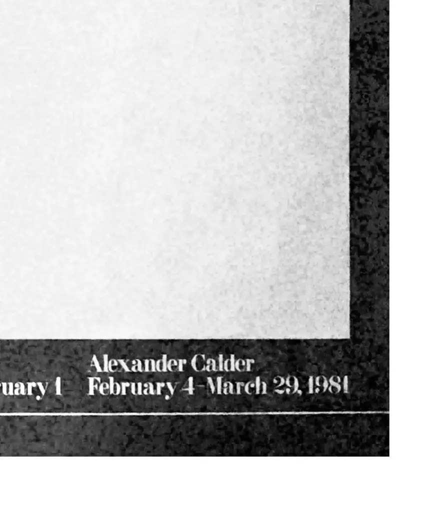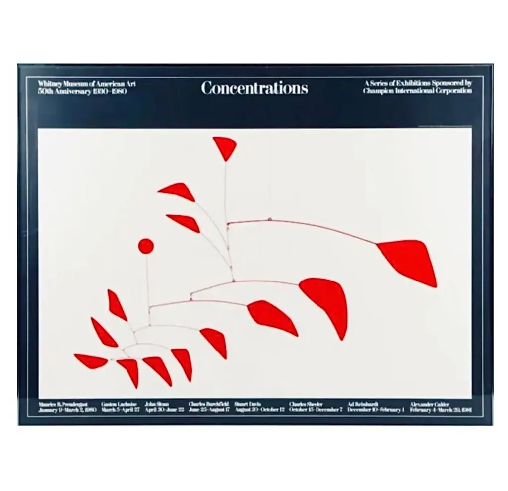80s ULTRA RARE, Vintage, Original Alexander Calder, Large Format, Modern Exhibition Lithograph Poster published by the Whitney Museum of Art, New York, 1980-1981. NEVER REMOVED FROM ORIGINAL WRAPPER!!!This enormous, pristine lithograph is entitled; "Concentrations" Big Red Mobile. It was published by the Whitney Museum of New York in 1981.This artwork, has remained rolled, in the museum's original, tubular casing, since 1981. I removed the casing, for the first time, to inspect the artwork for any issues, after almost half a decade of being stored. It's was perfect, colors vivid, uncreased!!!The imagery is classic, minimalist Calder. It displays the very iconic, Big Red Mobile, part of the permanent collection of the Whitney Museum in NYC. The image is very dramatic due to its large format and minimalist graphic design of the Big Red Mobile on a simple white background, framed in black. All the information regarding the itinerary of this traveling exhibition, and the "provence" of dates, copyright, publishing, and rights are printed in a 80s modern white font against the black border. The poster is printed on heavier stock with a clear lacquer-like smooth finish. Almost like a protectant. It gives the work a low luster sheen that would not be noticeable once framed Measurements 44" W x 33" H This is an incredibly rare find, of an outstanding Calder exhibition lithograph. sealed and stored for close to half a century.