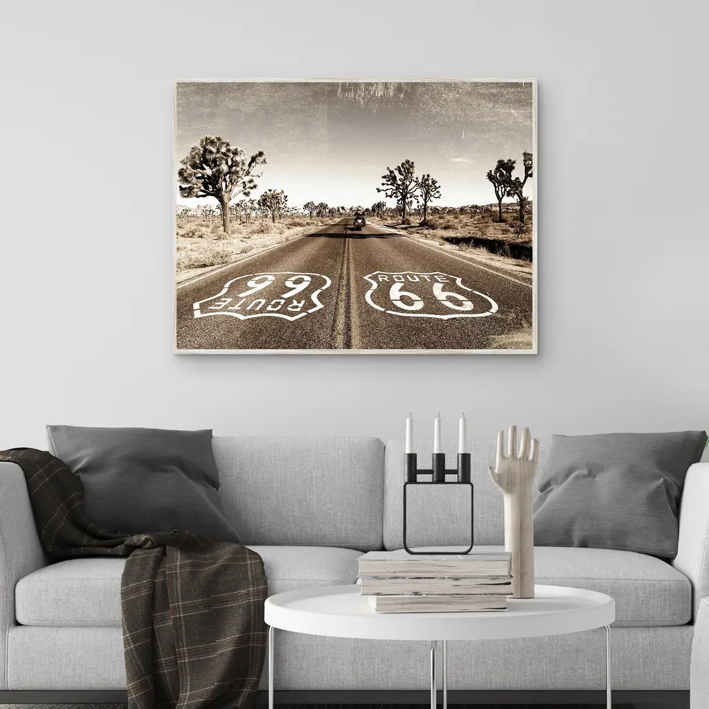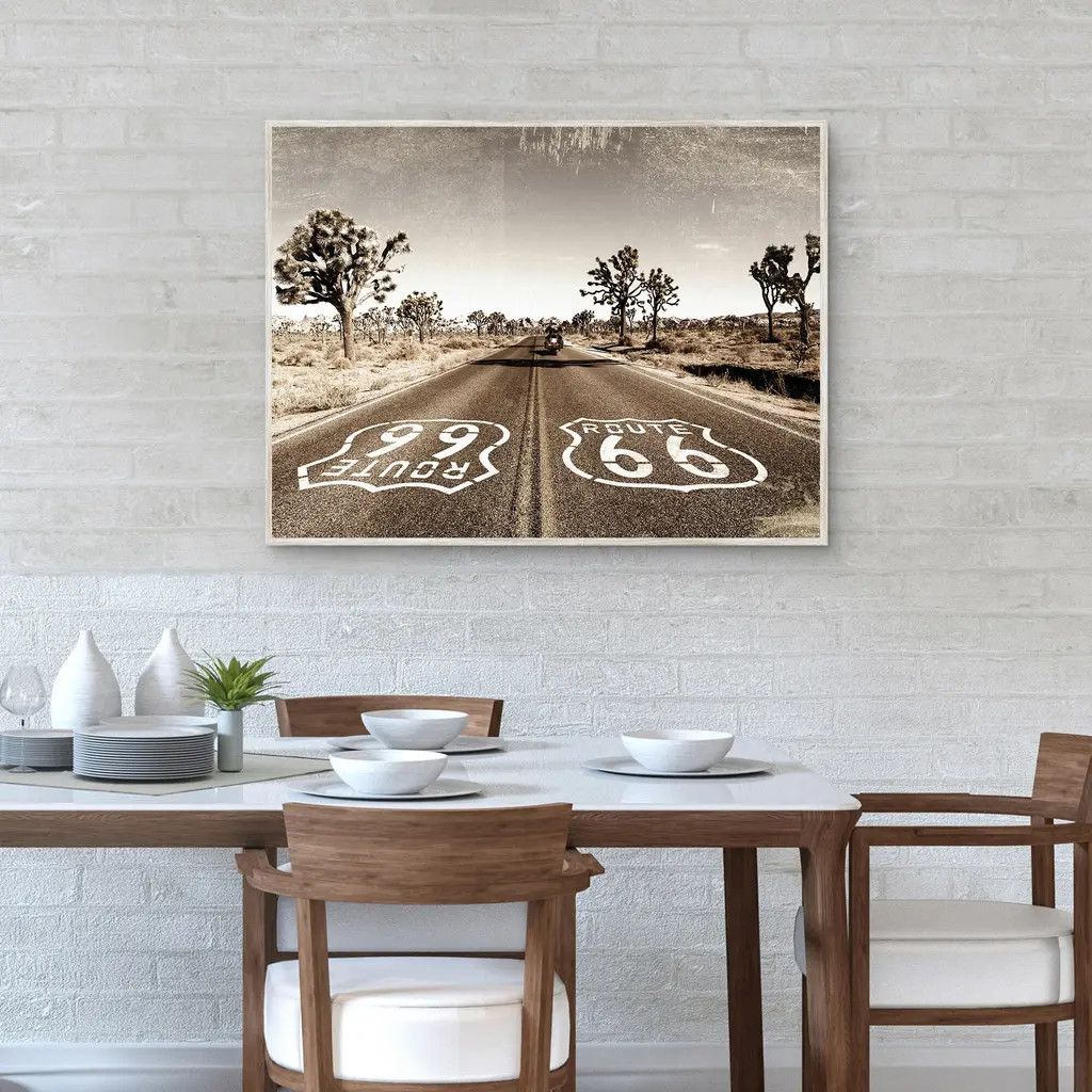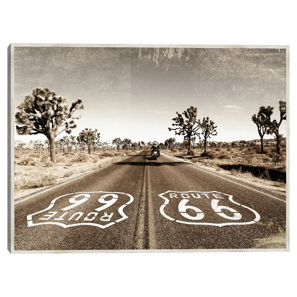 An expansive desert road stretches out into the horizon in this dramatic canvas print. Meanwhile, a rider speeds past the yucca palms surrounding the open highway. This sepia-colored canvas print is the next best thing to cruising down historic route 66. Produced with full-bleed printing that covers the entirety of the canvas, your new masterpiece is made with state-of-the-art technology for that museum-quality look. Plus, your new masterpiece comes ready to hang and is surrounded by a stylish, hand-crafted frame that enhances the beauty of your new artwork.