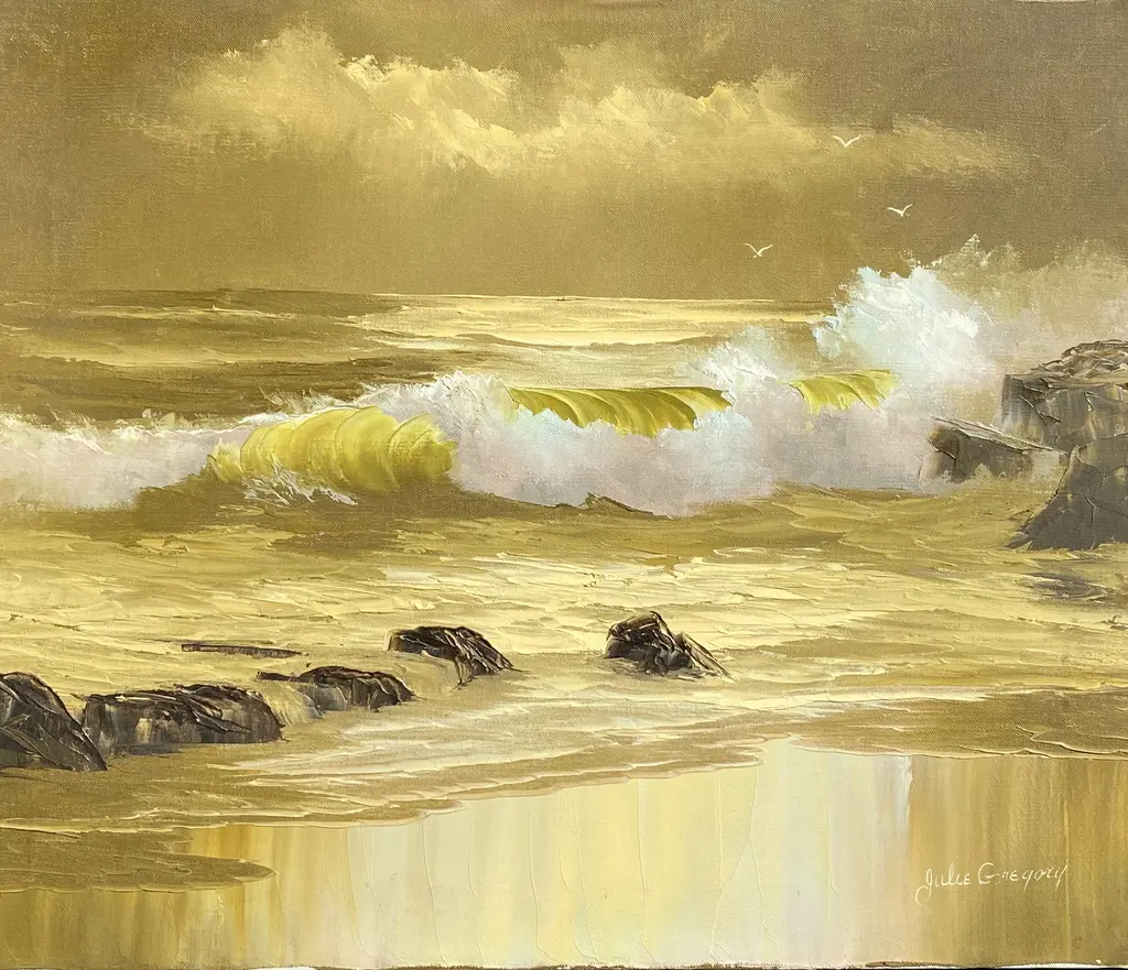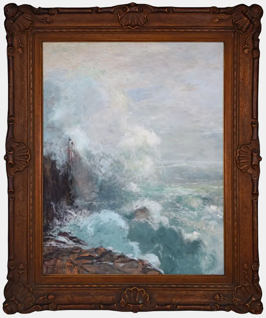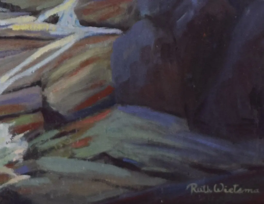 Stunning vintage seascape of waves crashing on a rocky coastline titled "Halibut Rocks" on verso, likely of Halibut Point in Rockport, MA on Cape Ann. Signed by artist Ruth Weitsma lower right. Presented in an exquisite, carved gilt plein air frame with notched corners. Circa 1950s.Canvas: 20" x24"Framed: 23.25" x 27.25"