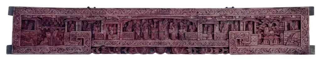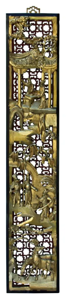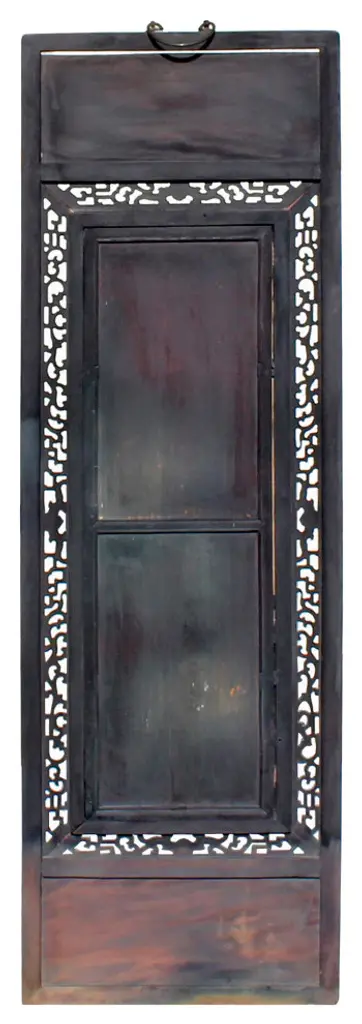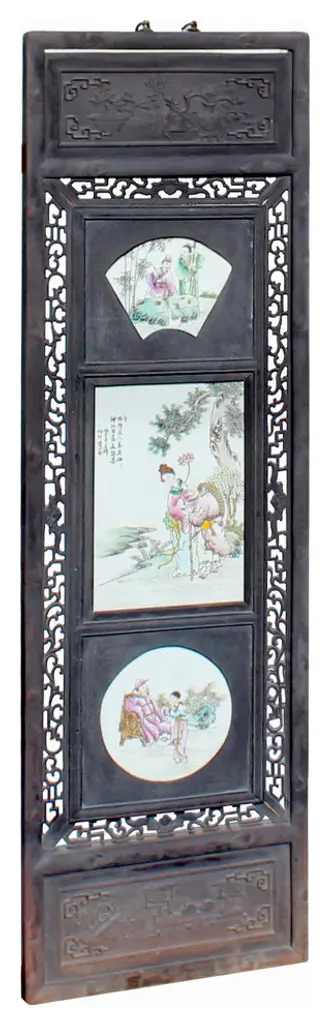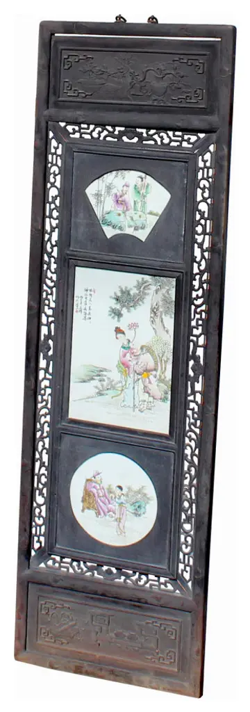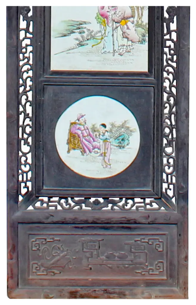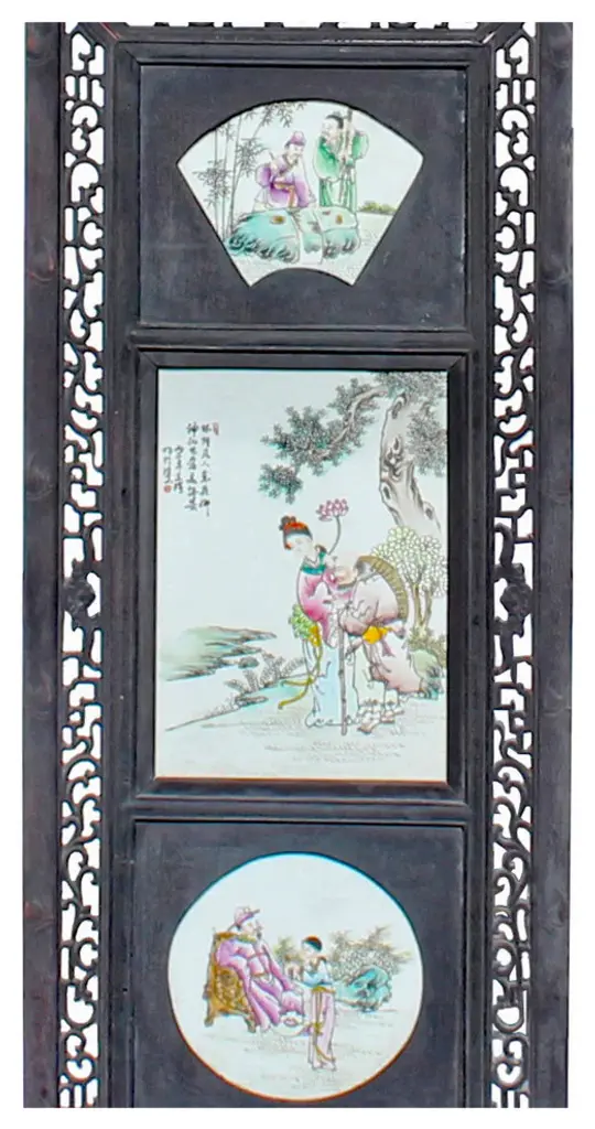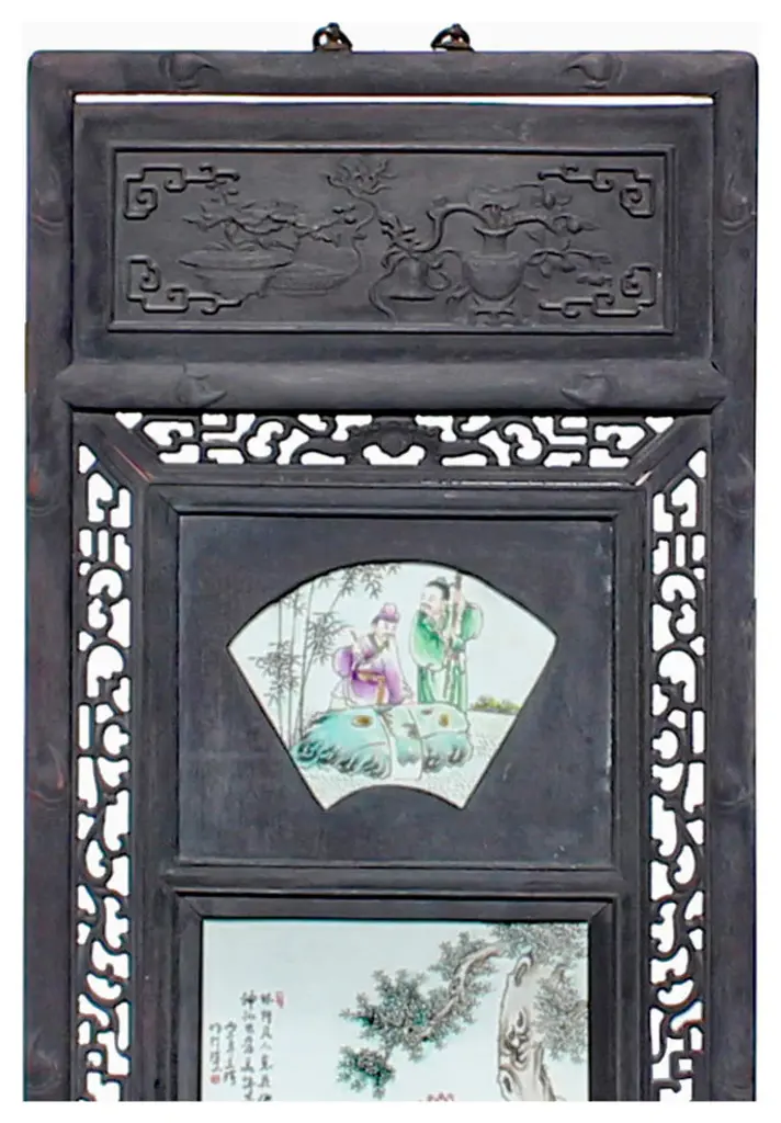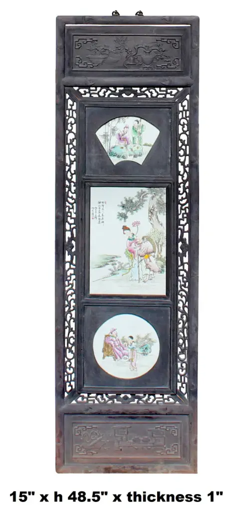 This is a porcelain painting wall decorative panel. The distressed off white part is made of porcelain and the frame is made of wood. The theme on each small porcelain plate is a colorful graphic of people. The wood frame is rustic with dark brown stain and wood crack marksDimensions: w15" x h 48.5" x 1" thickness Origin: ChinaMaterial: Porcelain and WoodCondition: handmade, vintage style finish production, minor wood cracks on the frame