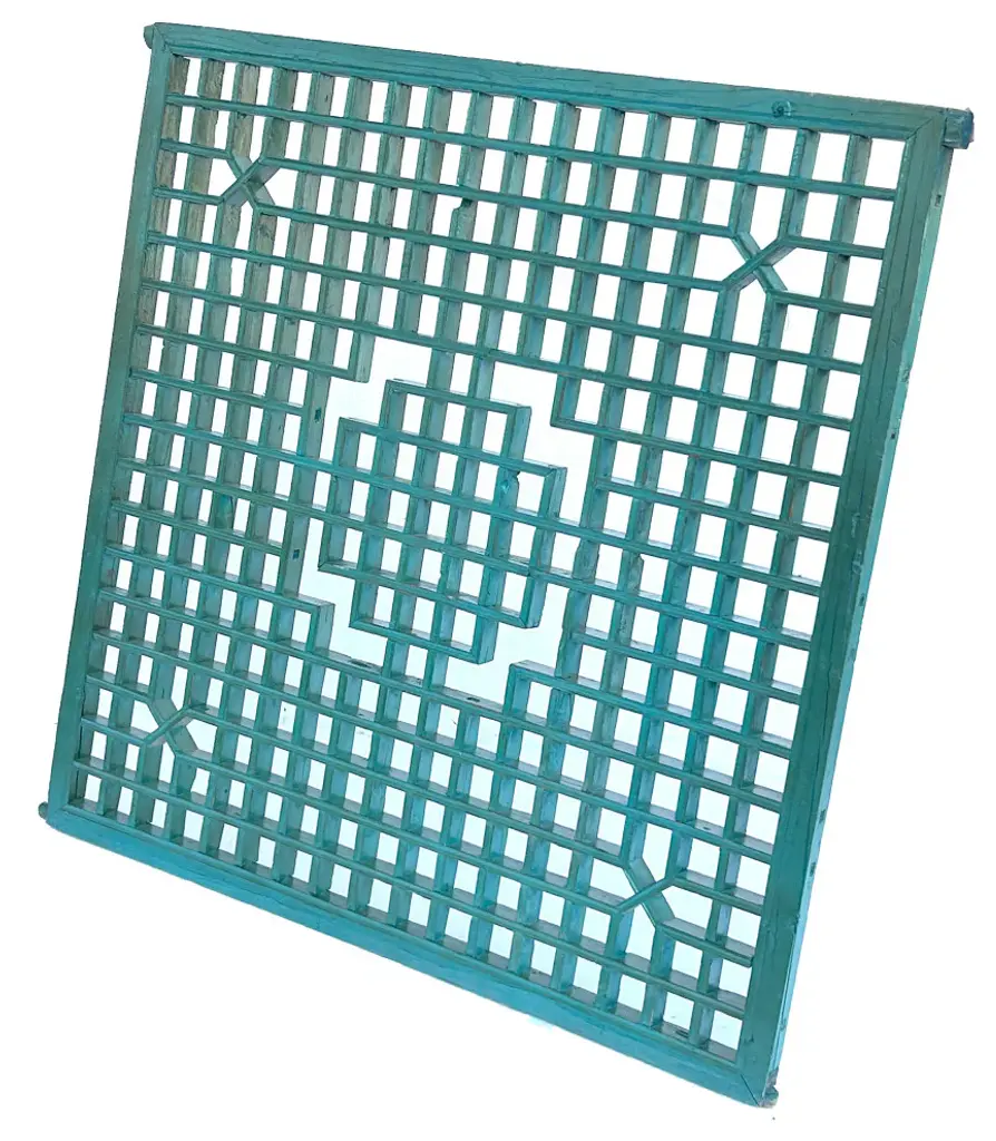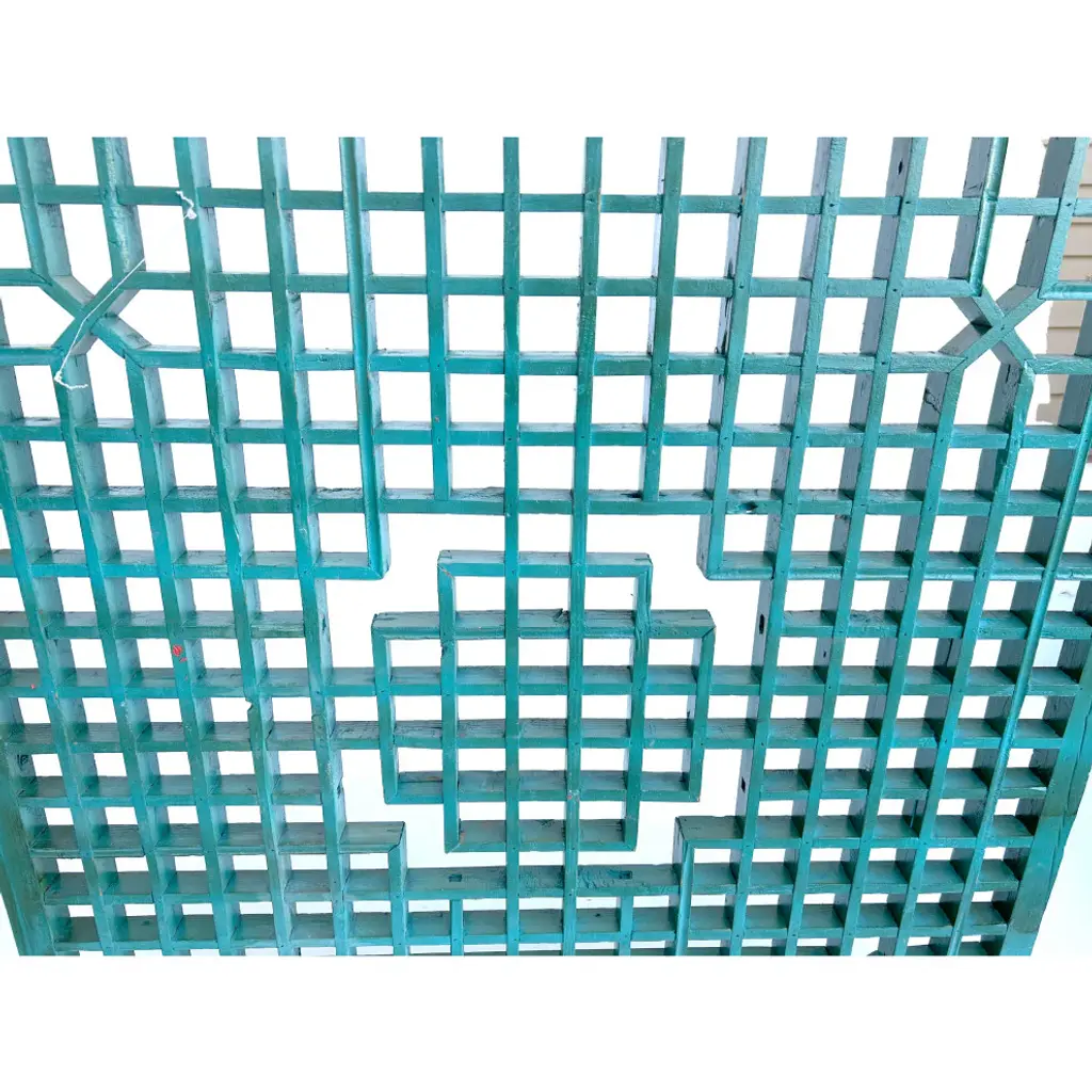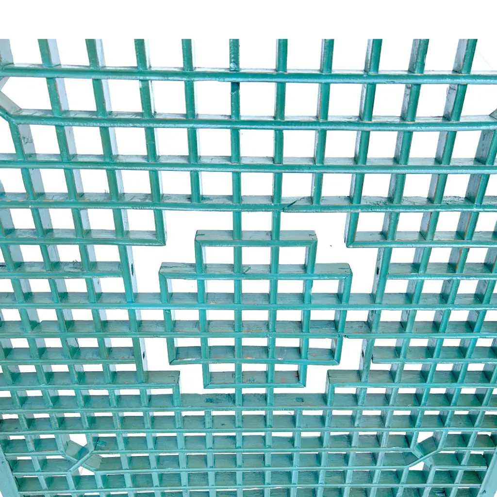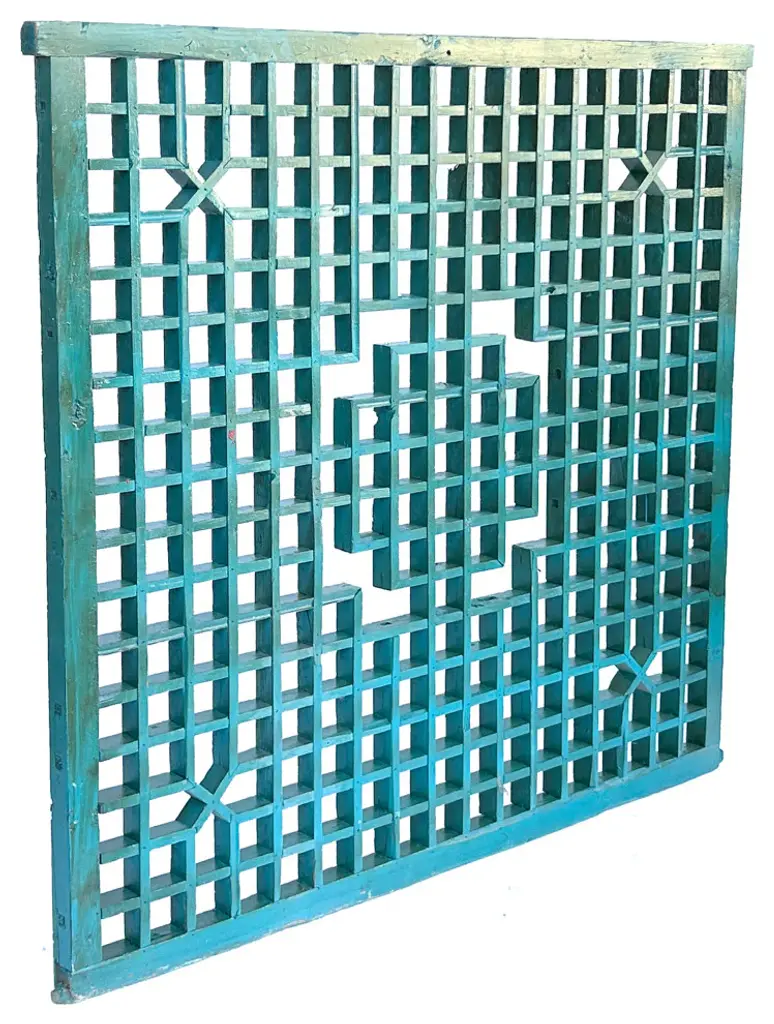 This elegant teal lattice panel combines intricate craftsmanship with a refreshing modern aesthetic. The panel features a finely detailed grid of small squares, formed by intersecting horizontal and vertical bars, creating a sense of rhythm and symmetry. At its center, a geometric motif unfolds with a series of angular shapes, forming a subtle, maze-like pattern that adds depth and visual intrigue. The soft teal finish brings a calming, contemporary vibe, making it an ideal accent for both indoor and outdoor spaces. Perfect for use as a decorative screen, garden trellis, or window insert, this lattice panel offers a harmonious blend of style and versatility, enhancing any setting with its understated sophistication.Dimensions: 43.75" x 44" thickness 1.5"Origin: ChinaMaterial: WoodCondition: Vintage style finish, wear-out marksWe offer a flat shipping fee of $295 for customers in the contiguous United States (48 states) for convenient curbside delivery. (Additional shipping costs will apply to customers in New York, Hawaii, Alaska, US Islands, Florida Keywest, or Canada, based on their specific location). The shipping cost includes insurance and handling charges for added protection. For customers in San Francisco or the Bay Area, we provide local delivery at a cost determined by the distance. You can find the exact cost by entering your zip code during checkout. Alternatively, you can pick up your order in-store with no extra shipping fee. If you need extra care and a white-glove experience, we offer a specialized service with a 4-8 week transit time, tailored to your destination. Contact us for a detailed quote on this service. Upon receiving your shipment, please carefully inspect the exterior packaging while the delivery personnel are present. Note any visible damage on the delivery paperwork, as carriers do not typically honor concealed damage claims. Your cooperation in documenting any visible damage is greatly appreciated