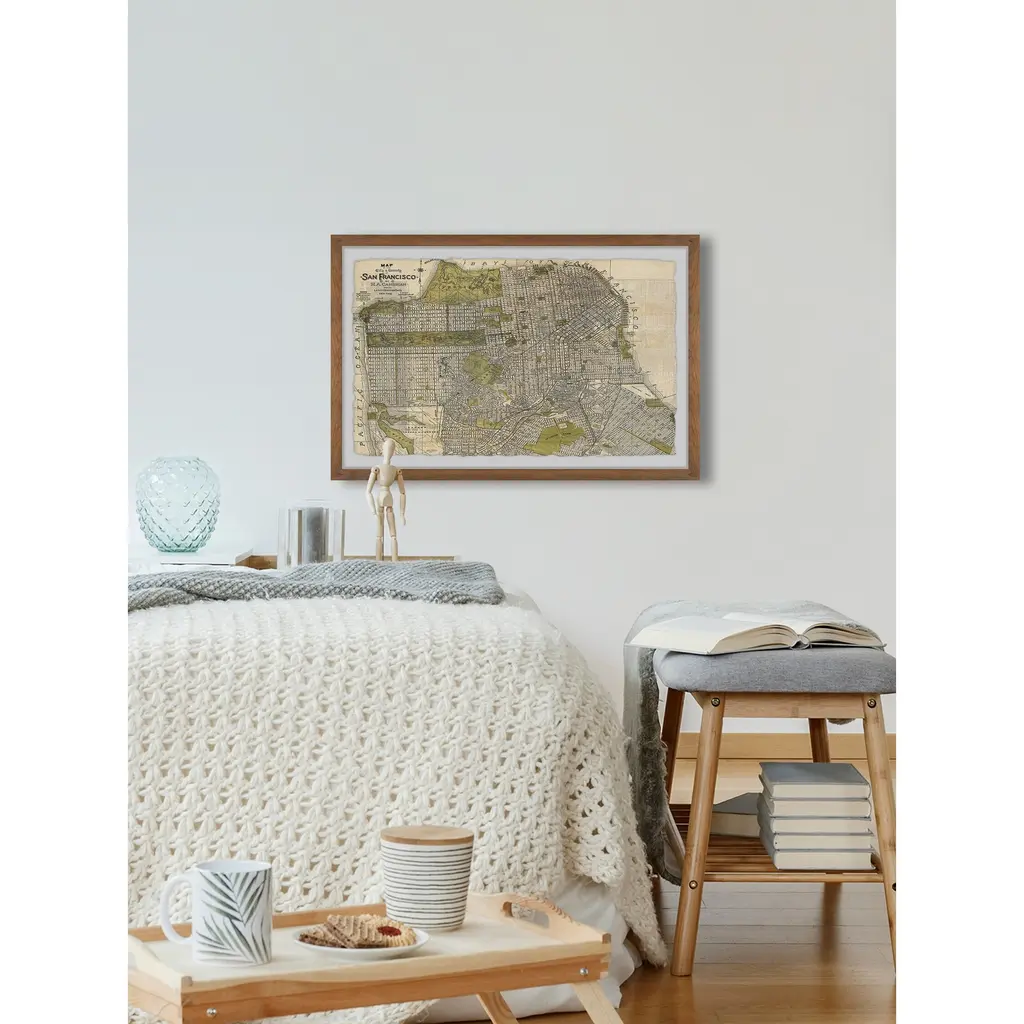 A detailed map of San Francisco that includes the ocean, parks and more. This natural colored piece will add a geographic aesthetic to any living space. Proudly printed in the USA, this piece is printed on high quality archive paper and professionally hand-framed. With wall-mounting hooks included, this artful accent is ready to hang up as soon as it reaches your front door. • Top quality Giclee print on high resolution Archive Paper • Hand cut deckled edges • High quality durable non-warping frame • Finished under shatter resistant plexiglass • Arrives ready to hang • Includes a certificate of authenticity • Printed the USA