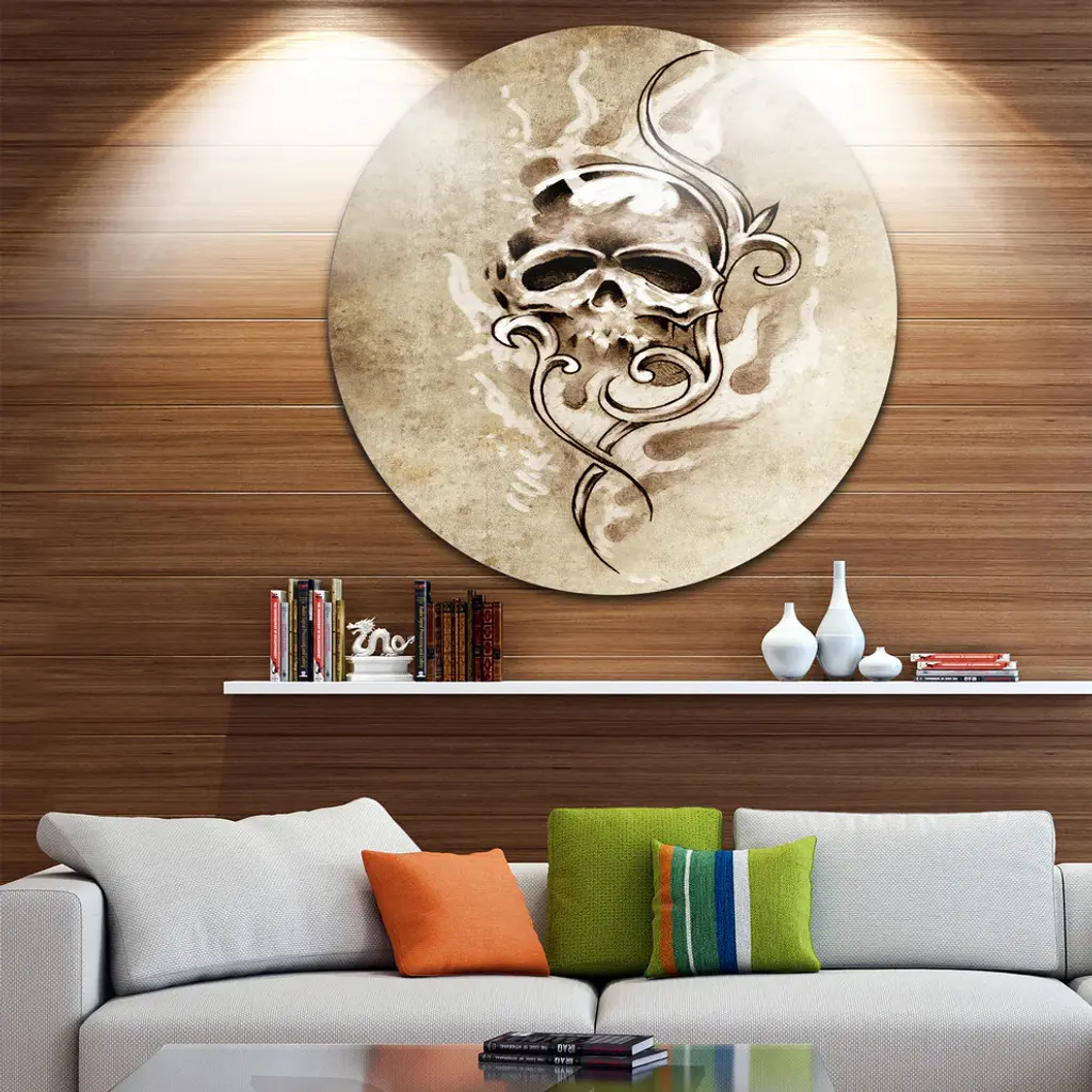 Bring Contemporary Abstraction to your home with this large Circle Metal wall art. This Vintage Style Skull Devil Tattoo Metal Artwork makes it the focal point of any room or office. - White Gloss Coating ensures colors are extra vibrant with light reflection.- Aluminum grade Sheet Metal with 1 inch mounting frame on the back giving the illusion that the artwork is floating on the wall..- Mounting Brackets are included along with instructions.- High Quality Digital images are created directly into a glossy aluminum panel producing a stunning and captivating print into the glossy finish of the metal.- Water, Fire and Scratch resistant HD Aluminum panels.- Looks better than any photo paper and guaranteed to last at least 20 years- Easy to clean with a microfiber cloth. Colors are far superior to regular Canvas Art. - Easy to Hang