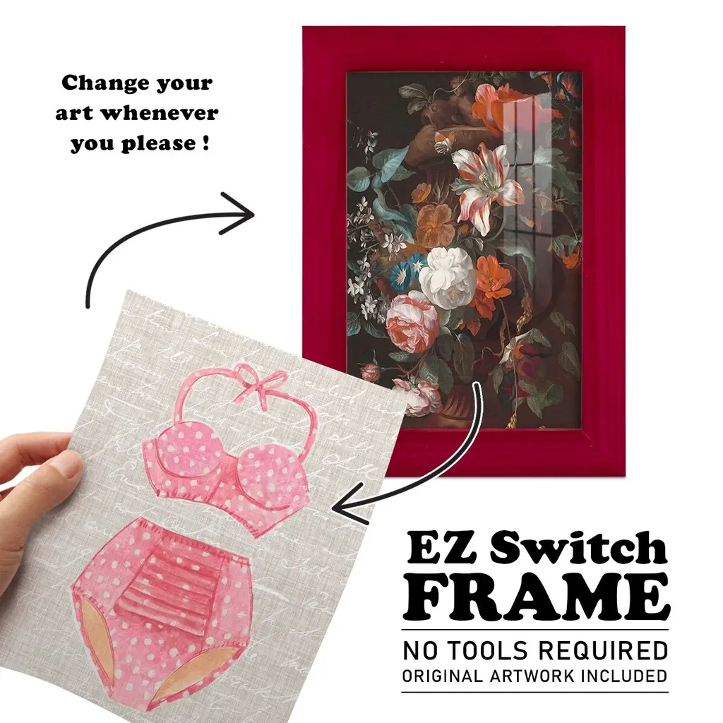 Vintage Swimming II -EZ SWITCH Framed Print w/glass-Cherry Red A delightful, framed print. Featuring a solid wood frame with real wood glass. This premium print is giclee quality. In addition, every frame features a removable back and table top stand. This allows you to change your art in the future or to just stand the art on a table for a new look. We are sure you'll enjoy our new series of EZ SWITCH Framed Art. Solid Wood Frame Real Glass Removable / Replaceable Art Built in Tabletop Stand Sizes range from 4x6 up to 12x15 - buy just one or pair them up as sets as you see fit.