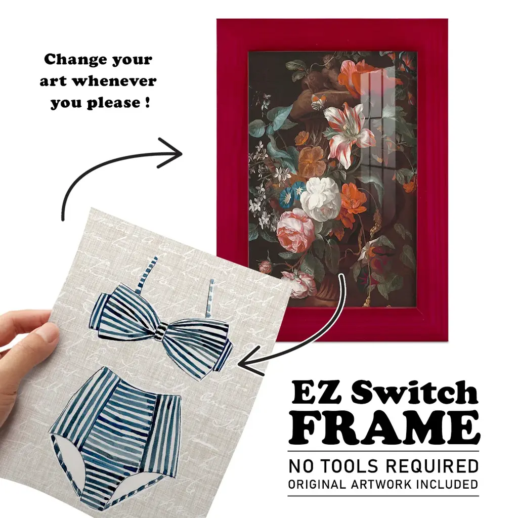 Vintage Swimming IV -EZ SWITCH Framed Print w/glass-Cherry Red A delightful, framed print. Featuring a solid wood frame with real wood glass. This premium print is giclee quality. In addition, every frame features a removable back and table top stand. This allows you to change your art in the future or to just stand the art on a table for a new look. We are sure you'll enjoy our new series of EZ SWITCH Framed Art. Solid Wood Frame Real Glass Removable / Replaceable Art Built in Tabletop Stand Sizes range from 4x6 up to 12x15 - buy just one or pair them up as sets as you see fit.
