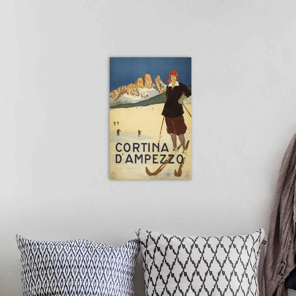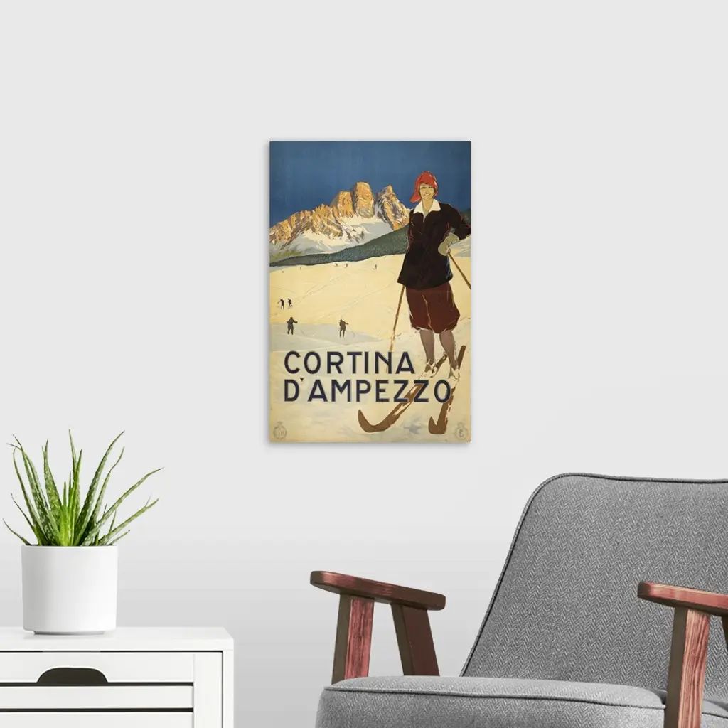 Vintage Travel Poster Of A Woman Posed On Ski Slopes At Cortina d'Ampezzo, 1920 wall art for home and office decor. Discover canvas art prints, photos, mural, big canvas art and framed wall art in GreatBigCanvas.com's varied collections.
