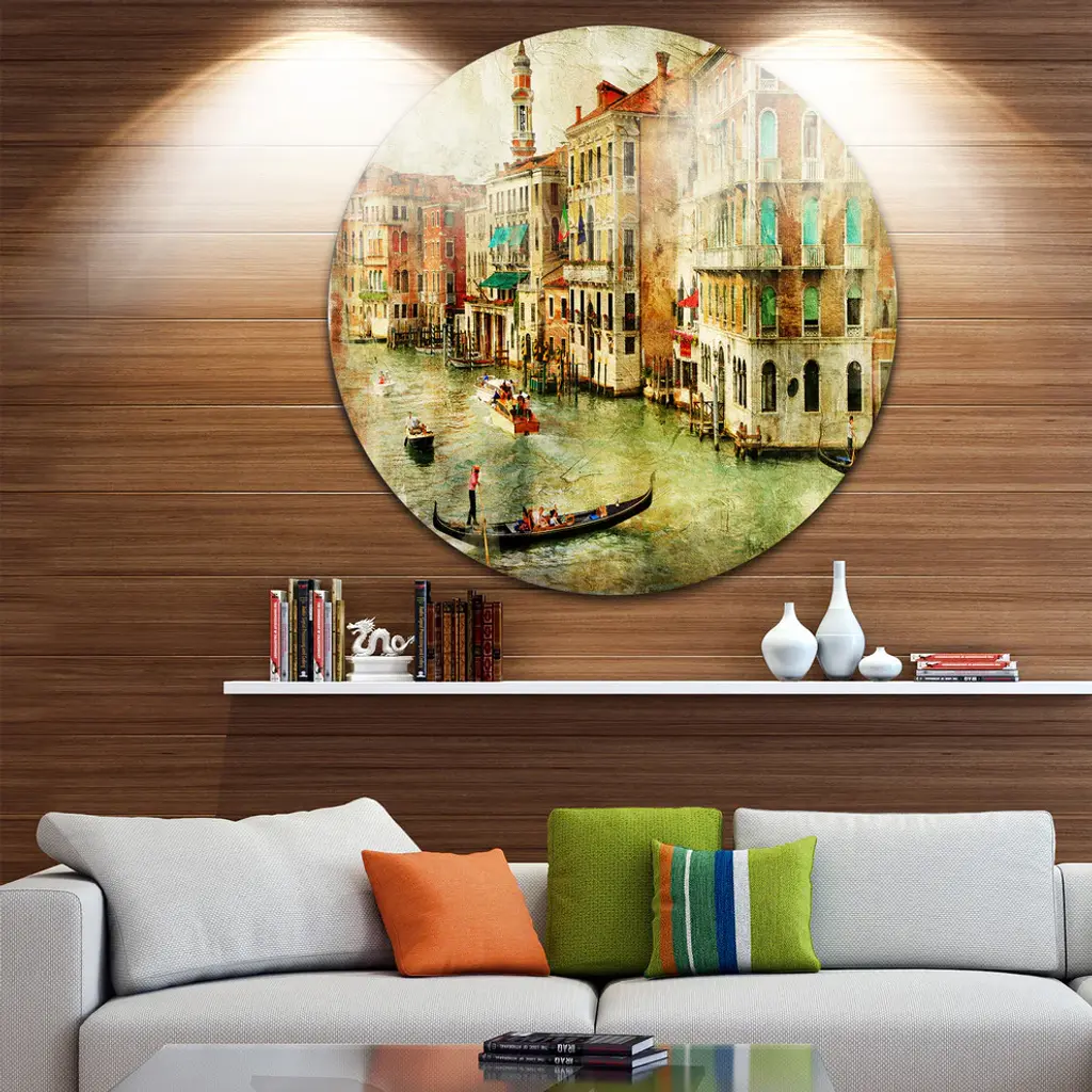 Bring Contemporary Abstraction to your home with this large Circle Metal wall art. This Vintage Venice Metal Artwork makes it the focal point of any room or office. - White Gloss Coating ensures colors are extra vibrant with light reflection.- Aluminum grade Sheet Metal with 1 inch mounting frame on the back giving the illusion that the artwork is floating on the wall..- Mounting Brackets are included along with instructions.- High Quality Digital images are created directly into a glossy aluminum panel producing a stunning and captivating print into the glossy finish of the metal.- Water, Fire and Scratch resistant HD Aluminum panels.- Looks better than any photo paper and guaranteed to last at least 20 years- Easy to clean with a microfiber cloth. Colors are far superior to regular Canvas Art. - Easy to Hang
