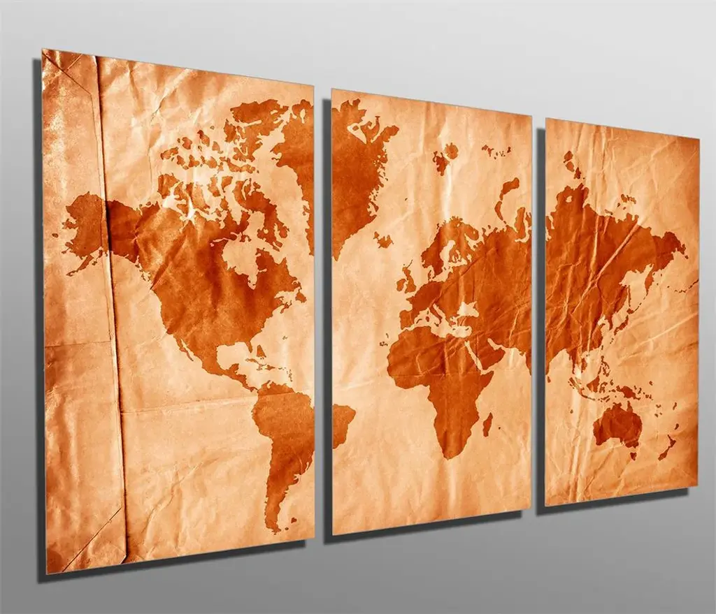 72"œ x 36"œ total size. Ready To Hang! (3 pieces - 24"œ x 36"œ each). 3 Panel Split (Triptych) Vintage World Map Metal Print with digital texturing. Modern metal wall art for home or office wall decor & interior design. Printed on Luxurious, HD aluminum glossy metal panels. Multi panel art.. HD aluminum panels. Metal print wall art. Includes Shadow Wall Mount on the back.• Aluminum Metal Wall Art• Made in USA• Ready to hang - No assembly required• Shadow mount hardware on the back• 0.045"œ thick HD Aluminum Panels• Scratch resistant, glossy finish• Superb color clarity, luxurious prints• Epson printing process• For indoor or moisture rich environment use• Easy to clean. Gently wipe with microfiber cloth.
