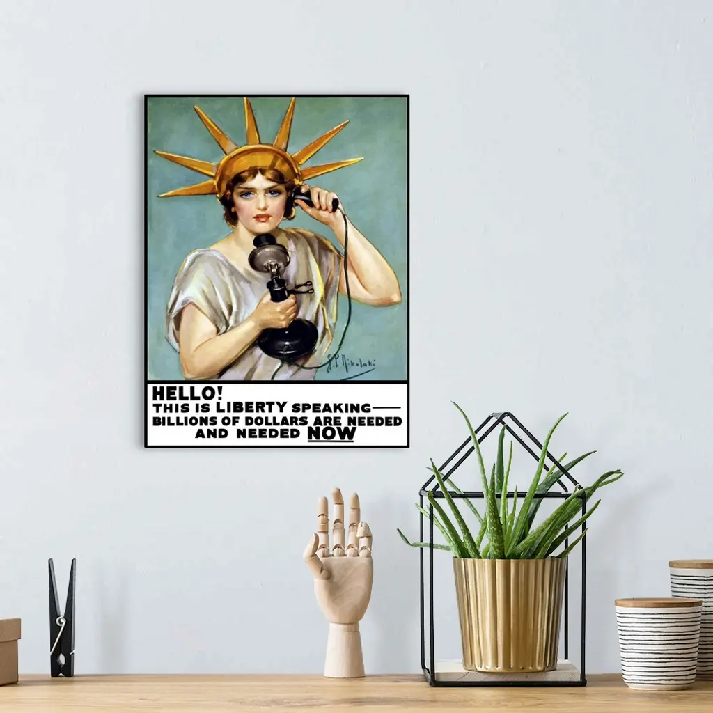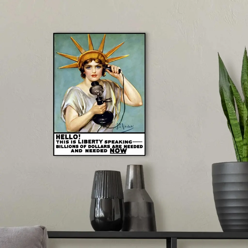 Vintage World War I poster of the Statue of Liberty talking on the telephone. It reads, Hello! This is liberty speaking - Billions of dollars are needed and needed now.